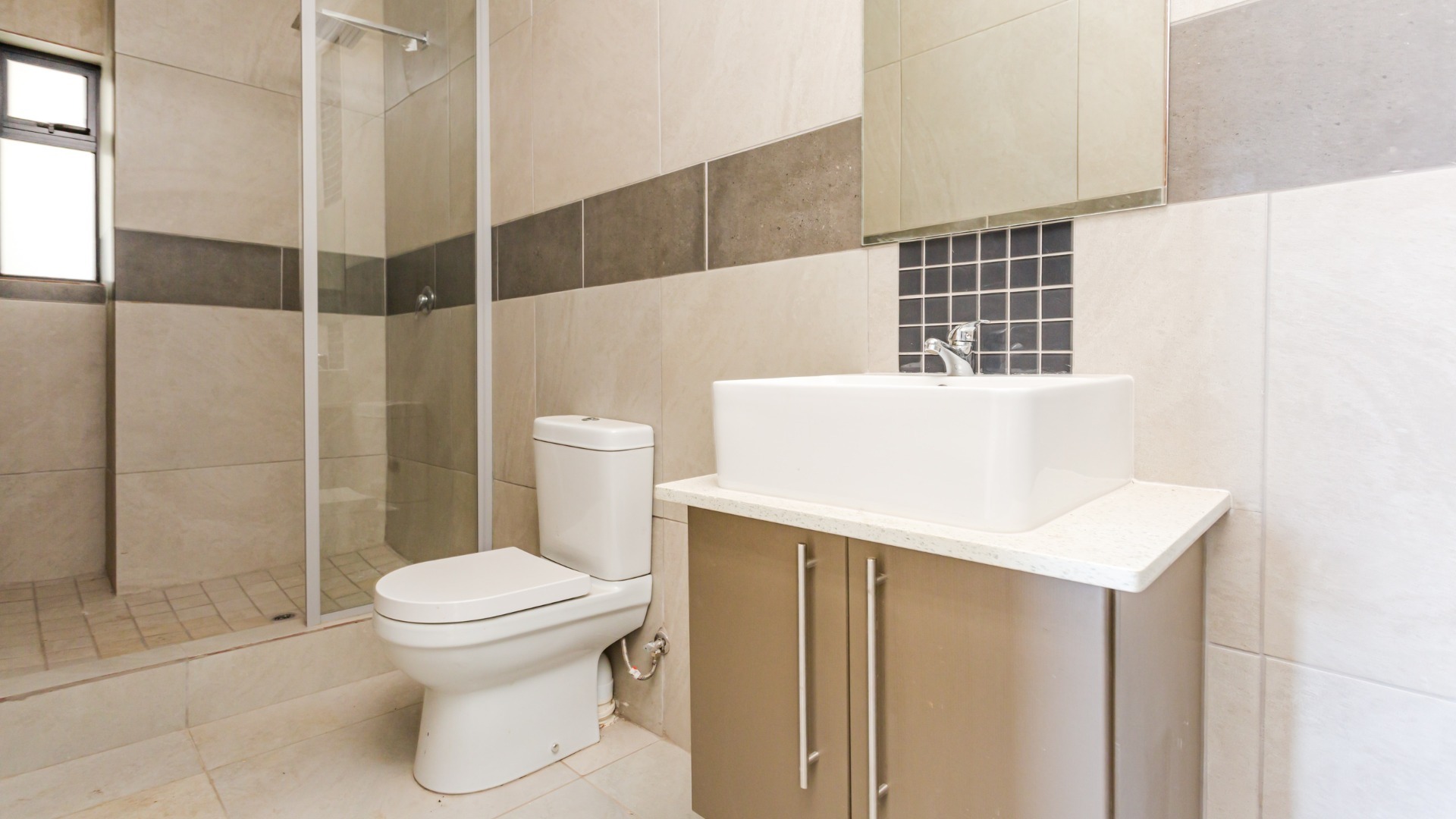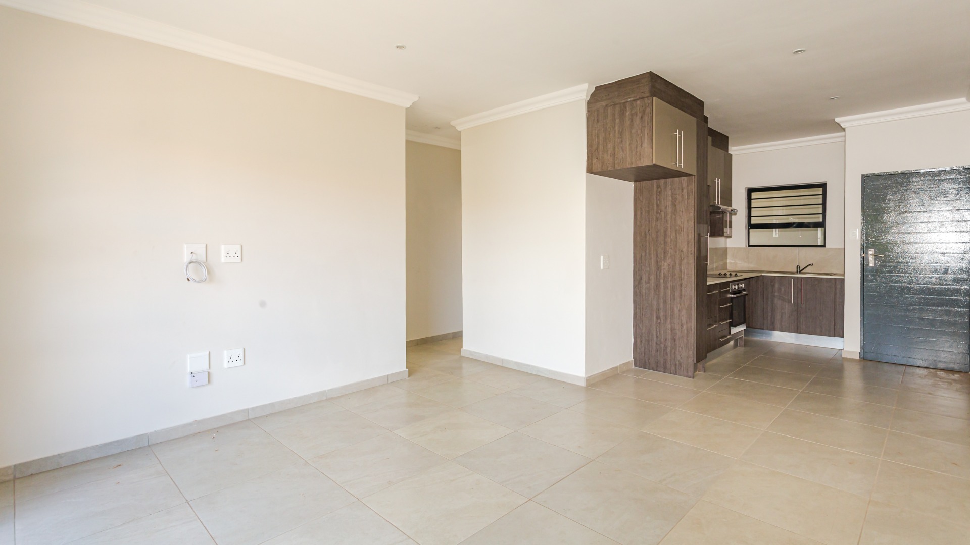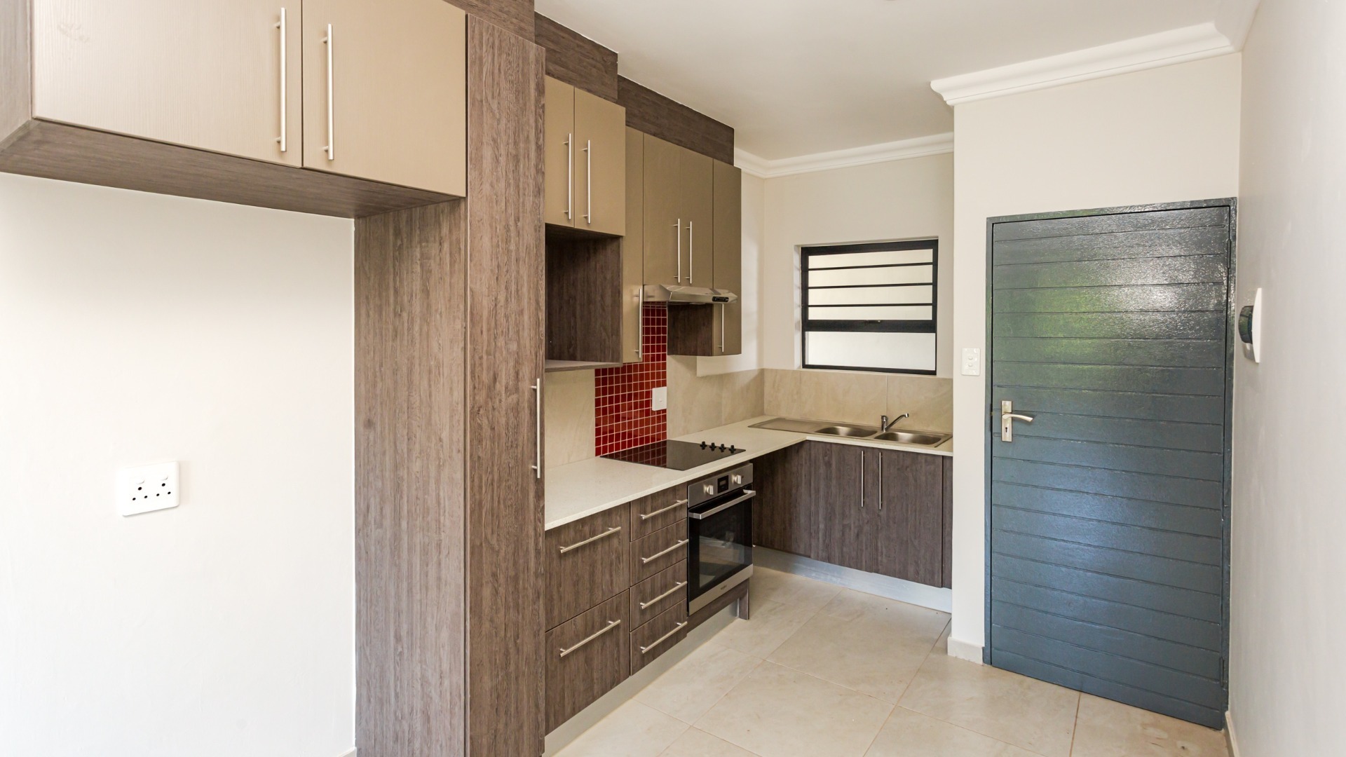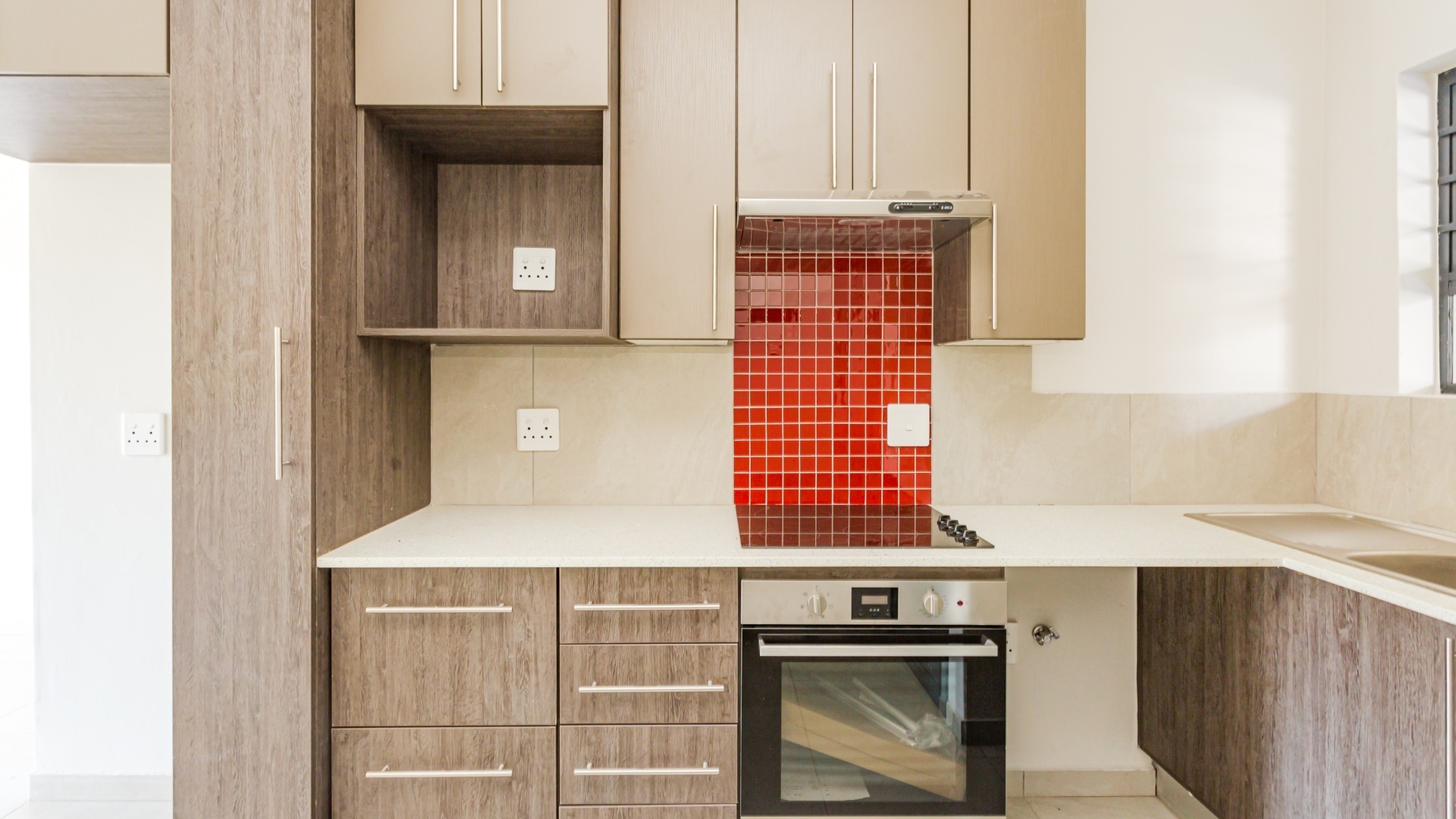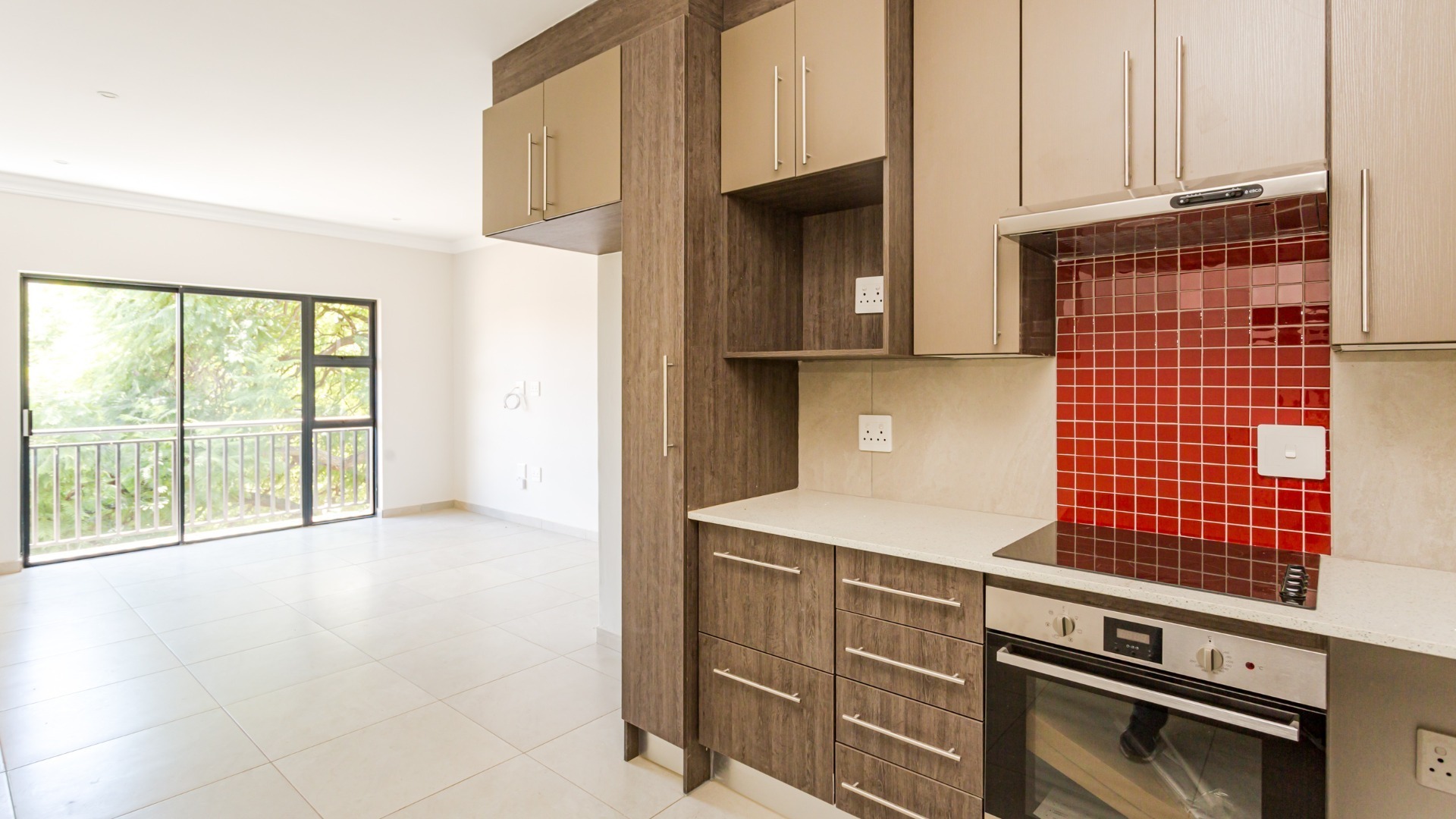 This modern 2-bedroom, 1-bathroom apartment offers a comfortable and secure living experience within a well-maintained complex. Spanning 64 square meters, the unit features an open-plan layout that seamlessly connects the living areas, creating a spacious feel. The interior boasts clean, neutral walls, crown moulding, and consistent tiled flooring throughout, providing a versatile canvas for personal styling. An entrance hall welcomes residents into this inviting space. The contemporary kitchen is a highlight, equipped with stylish two-tone cabinetry, integrated hob, oven, and extractor fan, complemented by a vibrant red tiled backsplash and a practical double sink. Adjacent to the kitchen, the lounge area benefits from abundant natural light, thanks to large sliding glass doors that open onto a private balcony. This outdoor space offers a pleasant view, perfect for relaxation. Security is a priority in this complex, featuring secure gated access and burglar bars on windows for peace of mind. Residents benefit from one dedicated undercover parking bay. This apartment is ideal for professionals or small families seeking a lock-up-and-go lifestyle in a secure environment. Situated in Pretoria North, this property offers convenient access to local amenities and transport routes, making it a practical choice for urban living. The complex provides a secure and modern setting, ensuring a comfortable residential experience in this established Pretoria suburb.