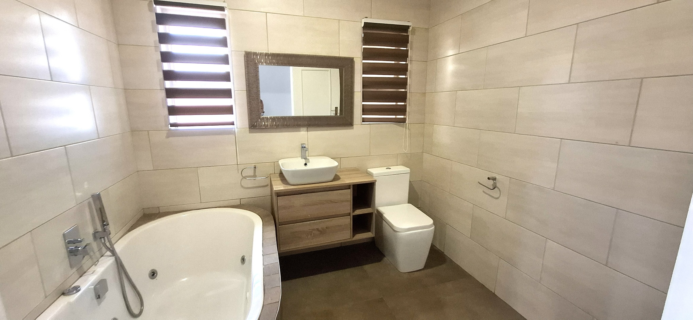 This elegant, modern single-storey residence is available to rent from 1 February 2026 within the prestigious Silver Lakes Golf & Wildlife Estate. Designed for refined estate living, the home offers three spacious bedrooms and three beautifully appointed bathrooms, including a luxurious Jacuzzi bath.