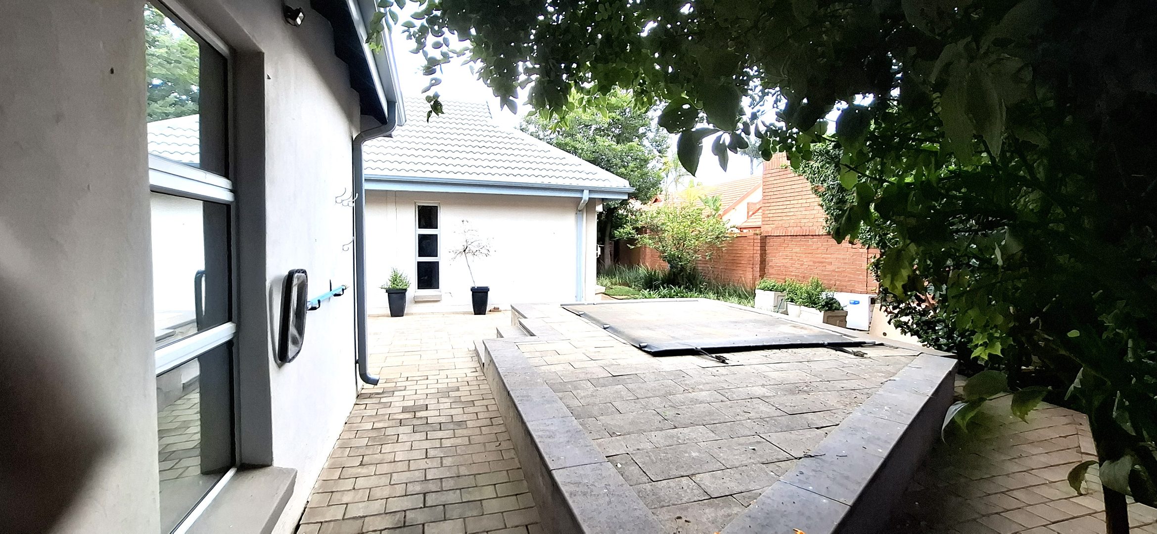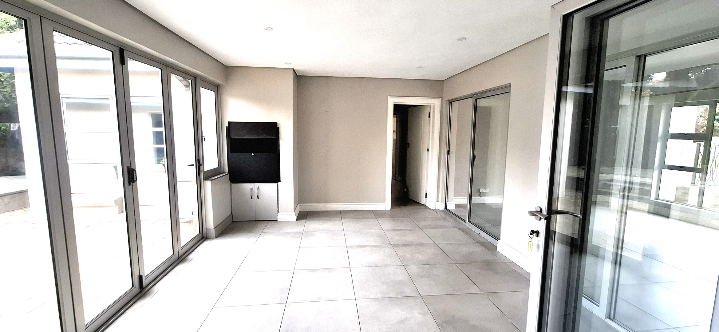 The open-plan kitchen is both stylish and functional, featuring a separate scullery and space for appliances, and flows effortlessly into three generous living areas that create a sophisticated yet welcoming atmosphere. The enclosed braai room opens onto the landscaped garden area and overlooks the swimming pool, offering an exceptional indoor-outdoor entertaining experience in a private and serene setting.
