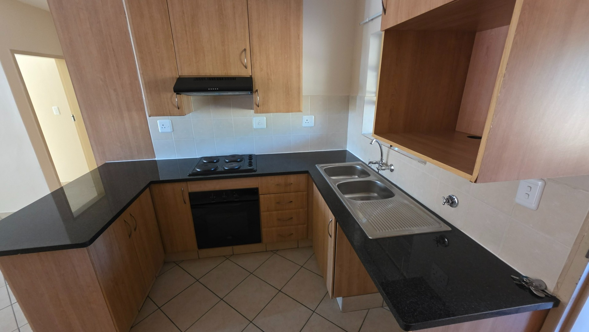 The heart of the home is a contemporary kitchen, equipped with stylish wooden cabinetry, dark countertops, a built-in hob and oven, and a double stainless steel sink. This functional space flows seamlessly into the dining and lounge areas, perfect for everyday living and entertaining. Large windows and a sliding door ensure abundant natural light, enhancing the airy feel of the apartment. Step out onto your private balcony, complete with a built-in braai, offering an ideal spot for outdoor relaxation and entertaining.