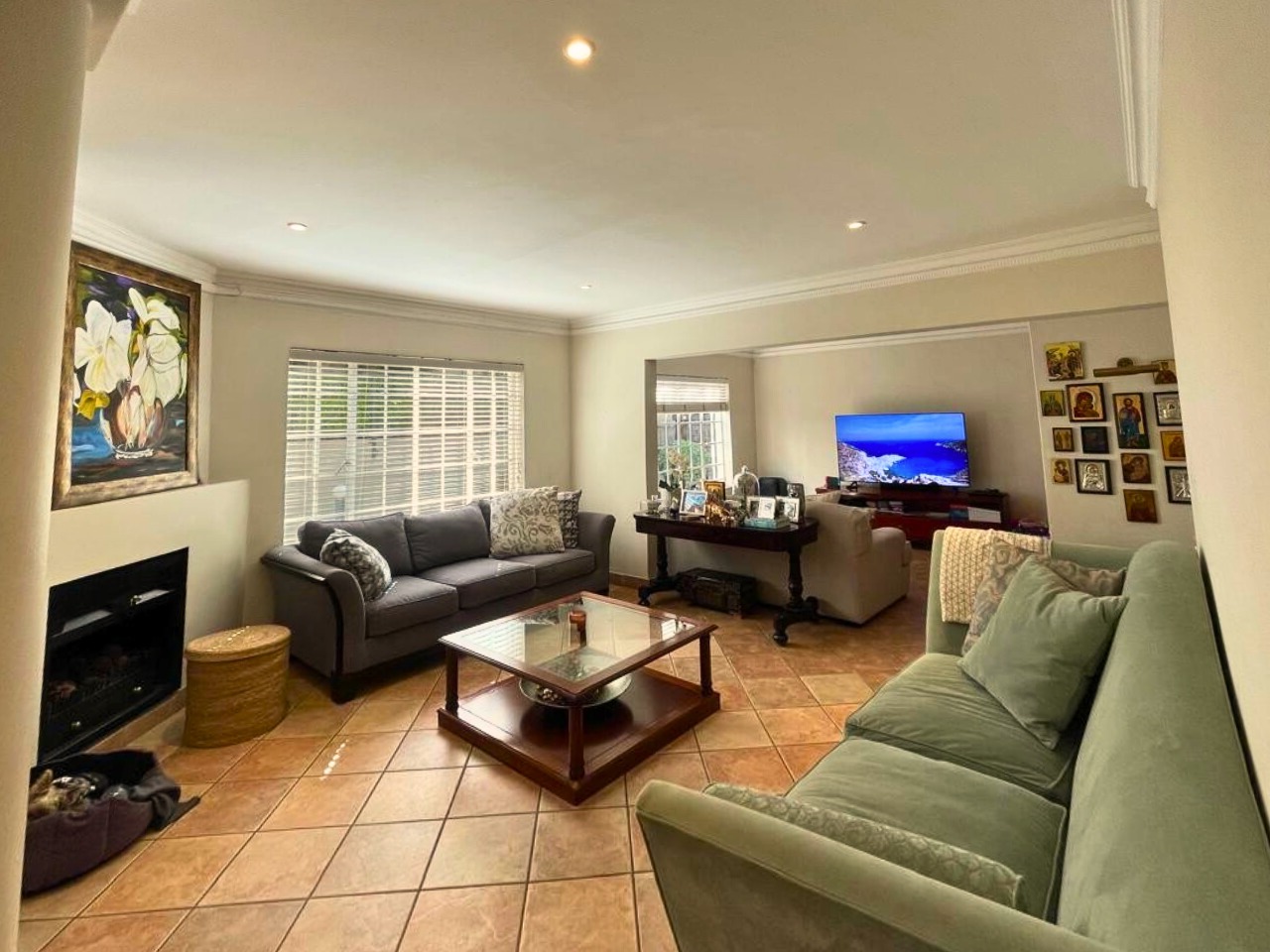Upstairs, a bright pajama lounge connects to three well-proportioned bedrooms. The main suite offers a full en-suite bathroom and generous cupboards, while the two additional bedrooms share a modern full bathroom. One bedroom opens onto a sunny private balcony.