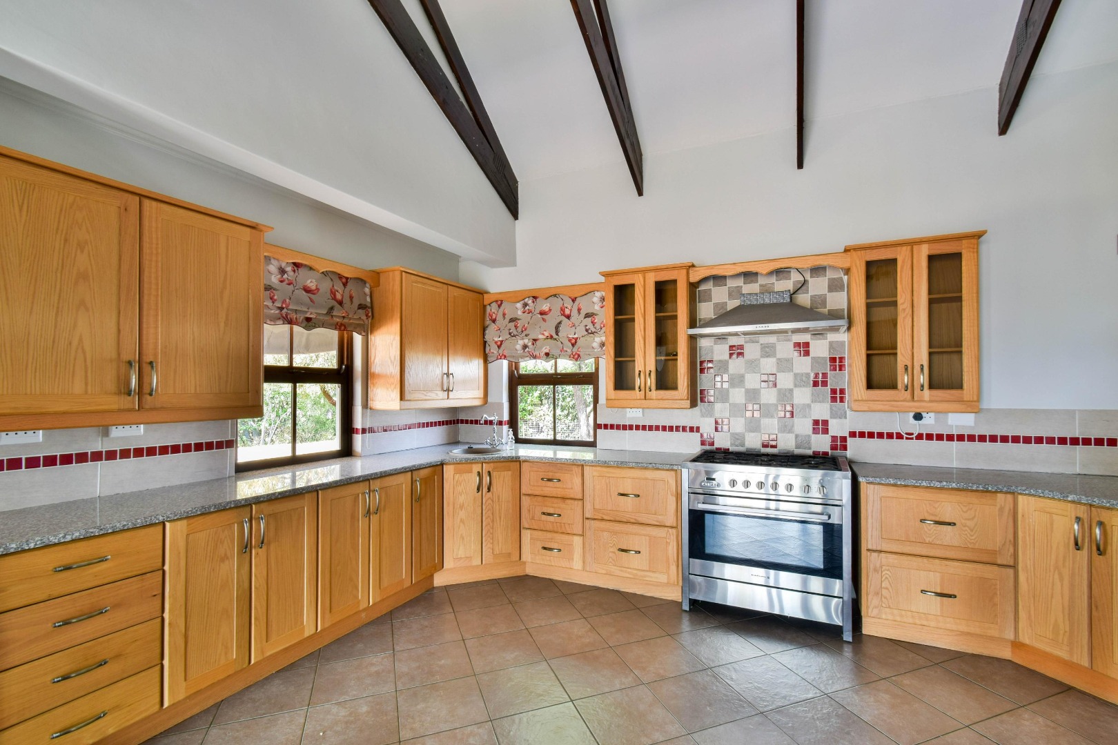 The open-plan living area has a double volume roof with exposed wooden beams and the space flows freely into the large farm style kitchen. The open-plan area also connects through double sliding doors that open up to a big outside undercover wrap around veranda, which provides space for multiple covered seating areas and outside entertainment.