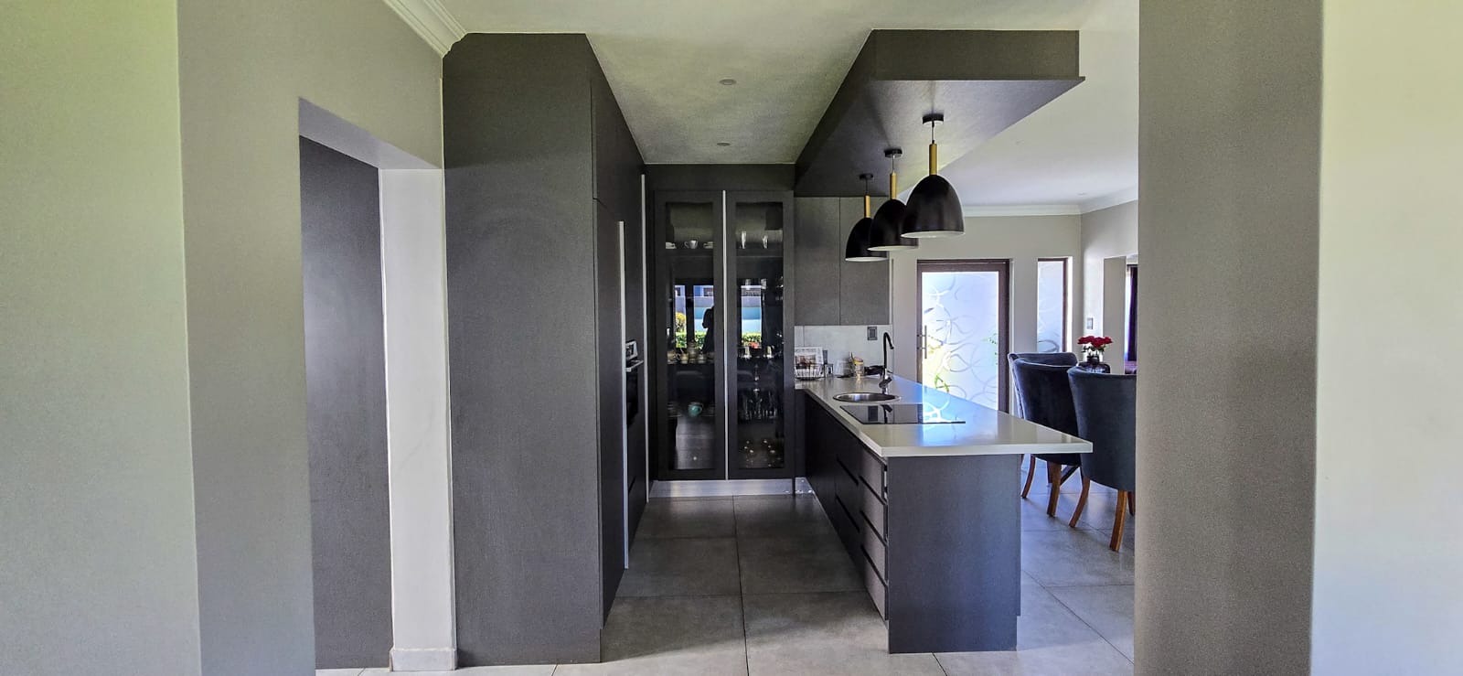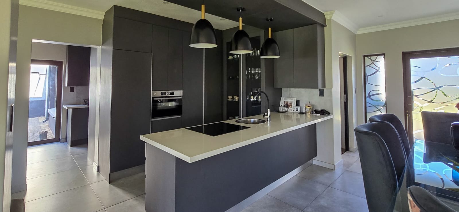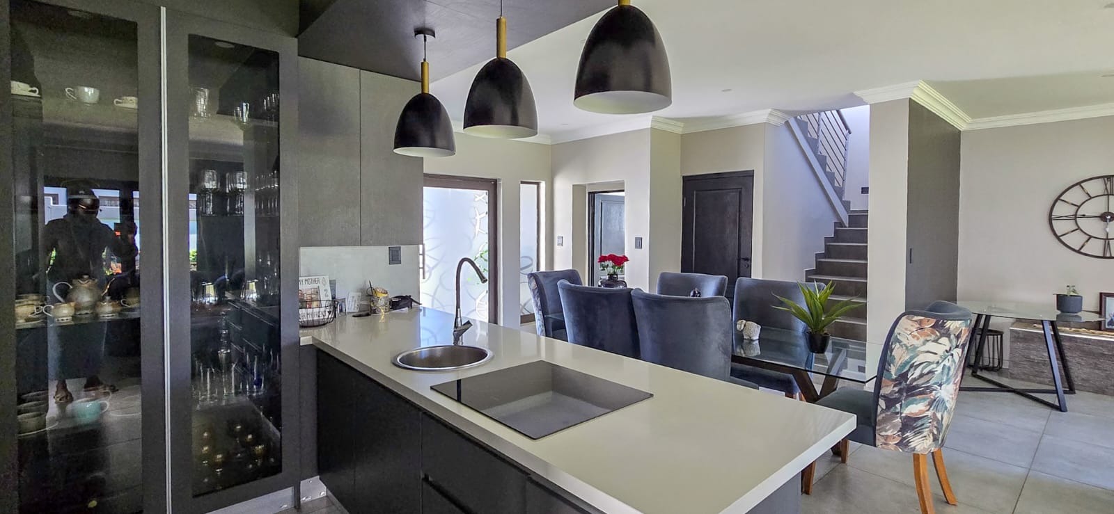 At the heart of the home lies a modern, designer kitchen, beautifully finished with high-end fittings, generous storage, and a gas stove ideal for culinary enthusiasts. Just behind it, the scullery provides added convenience, featuring a second gas stove and additional workspace to keep the main kitchen sleek and uncluttered.