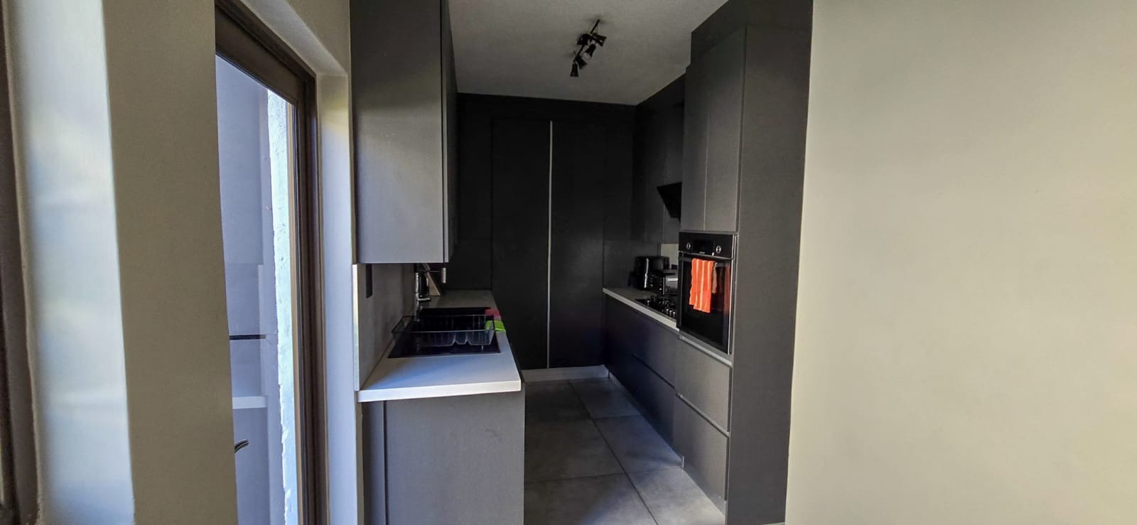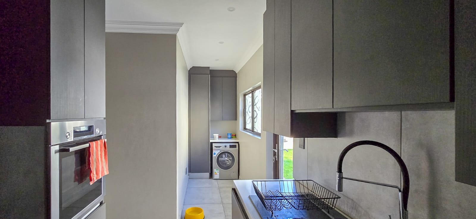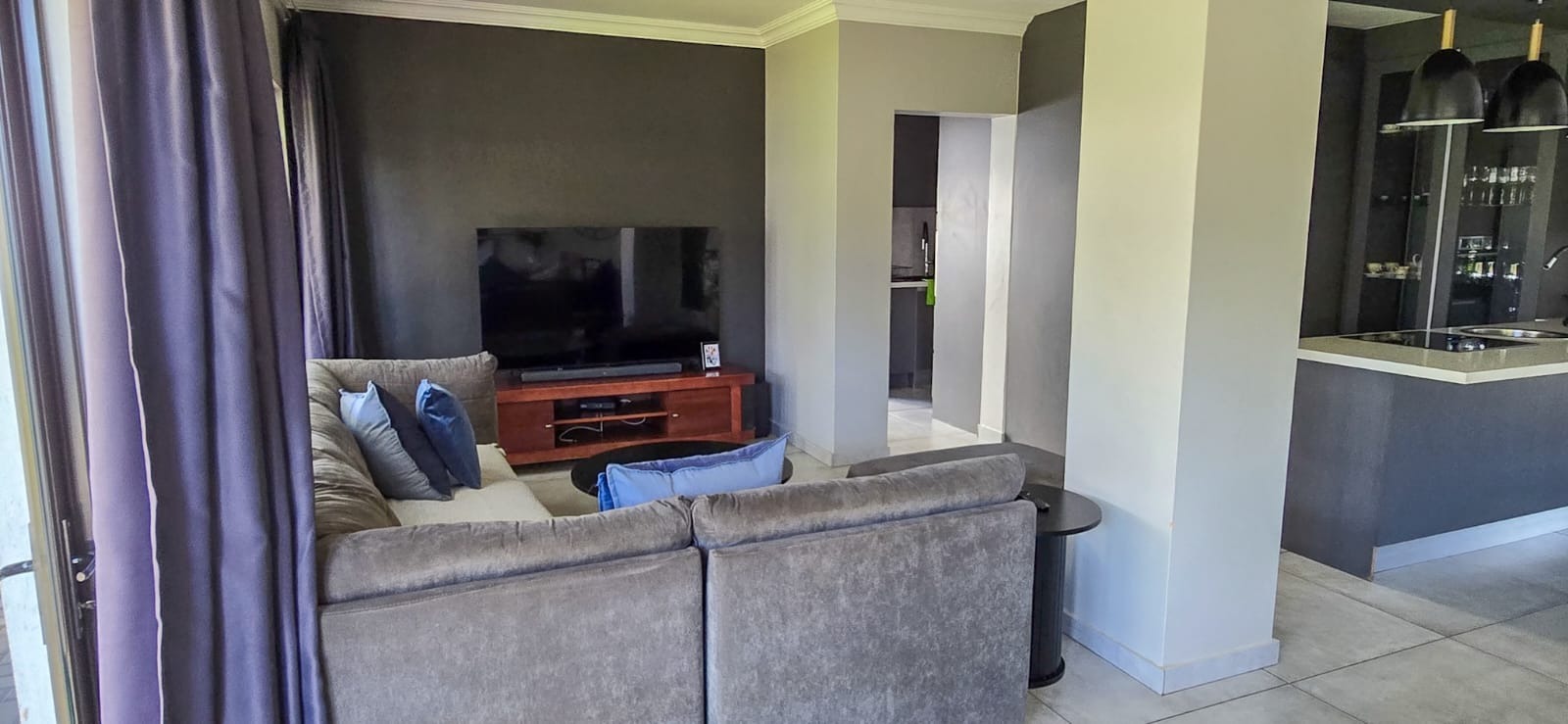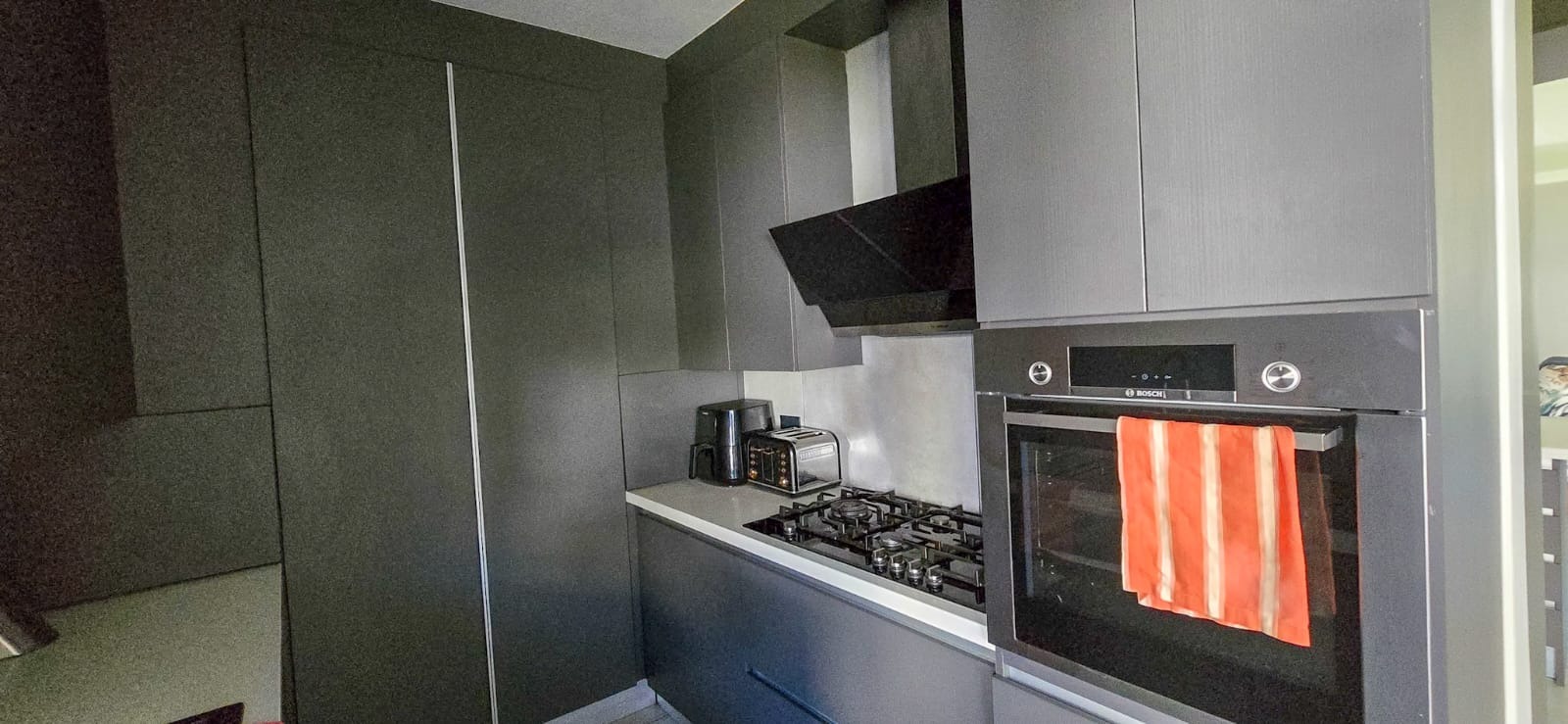 At the heart of the home lies a modern, designer kitchen, beautifully finished with high-end fittings, generous storage, and a gas stove ideal for culinary enthusiasts. Just behind it, the scullery provides added convenience, featuring a second gas stove and additional workspace to keep the main kitchen sleek and uncluttered.