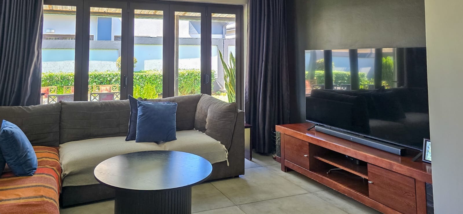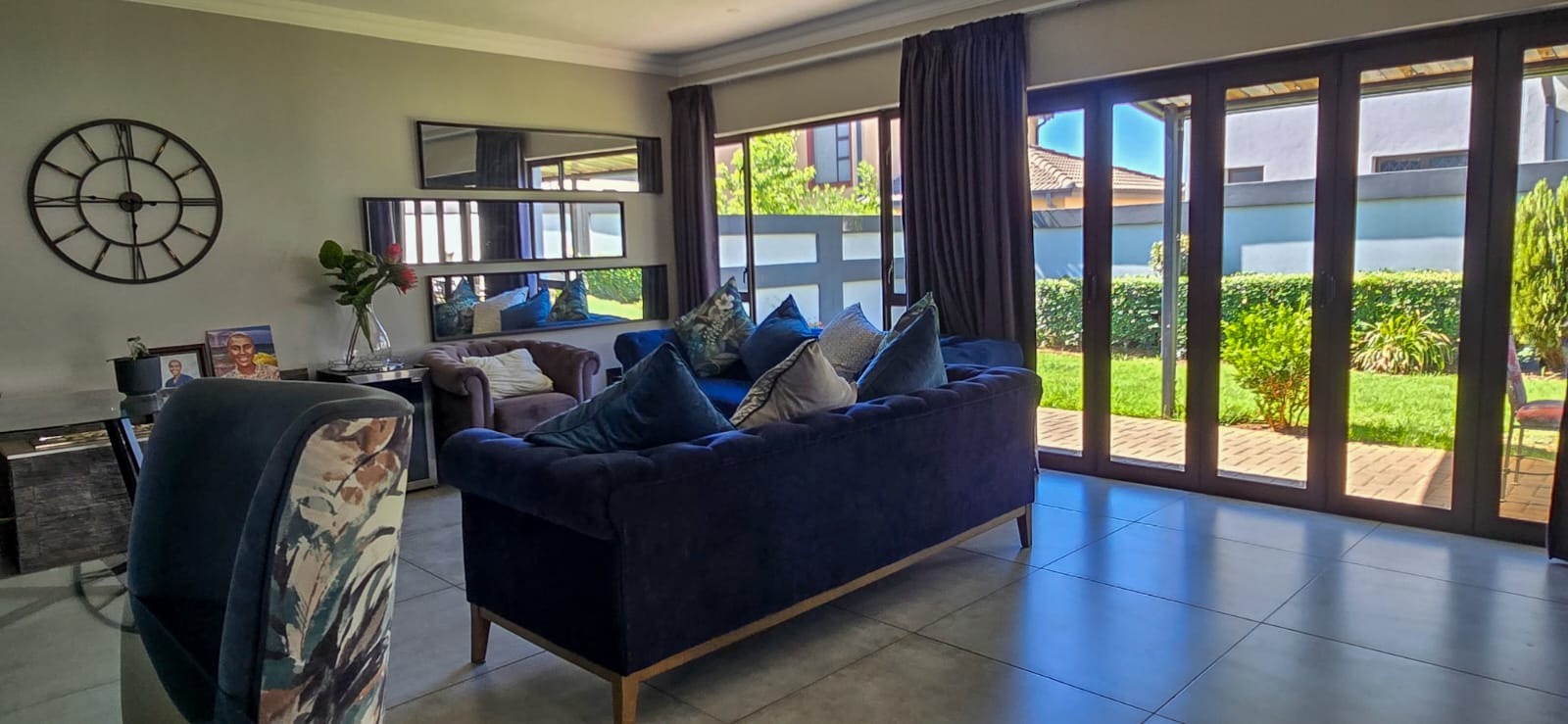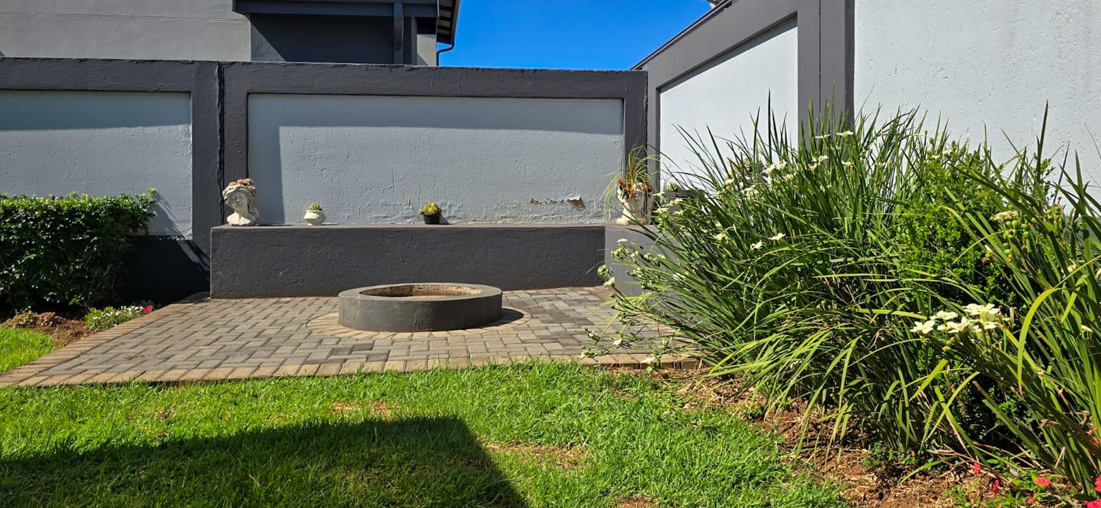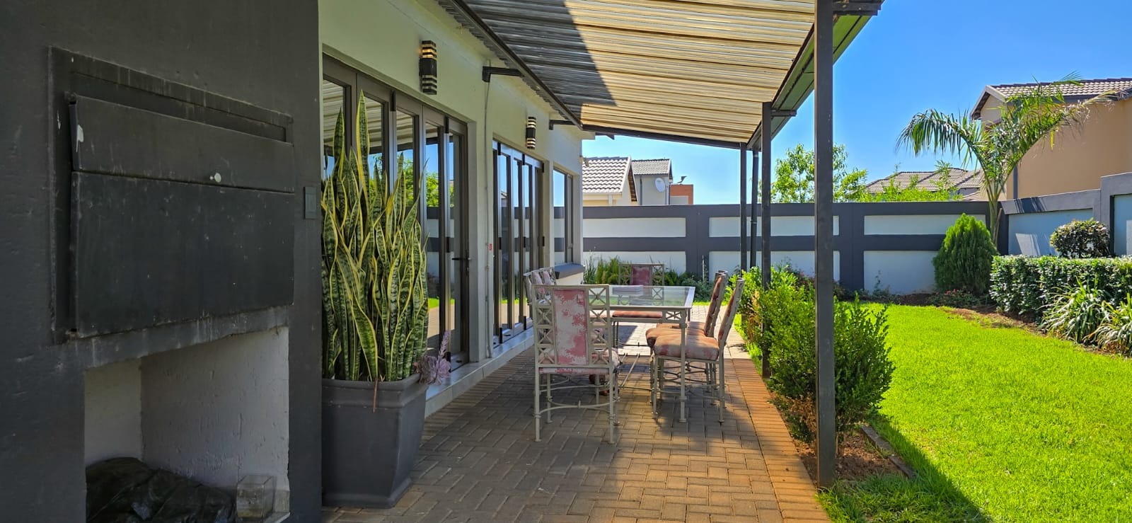 A guest bedroom and a full bathroom complete the downstairs level, offering a private and comfortable retreat for visitors or extended family. Large sliding doors open up to a covered patio that blends indoor and outdoor living. Here you’ll find a spacious entertainment area with a built-in braai, ample seating, and views of the beautifully landscaped garden perfect for hosting or simply unwinding. For evenings under the stars, the boma area offers a sophisticated yet cozy outdoor escape where friends and family can gather around the fire.