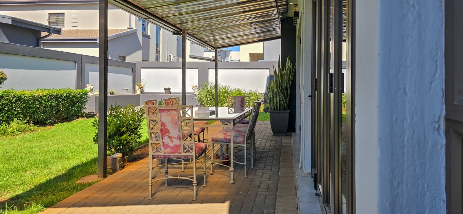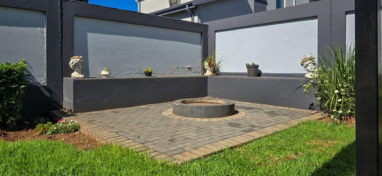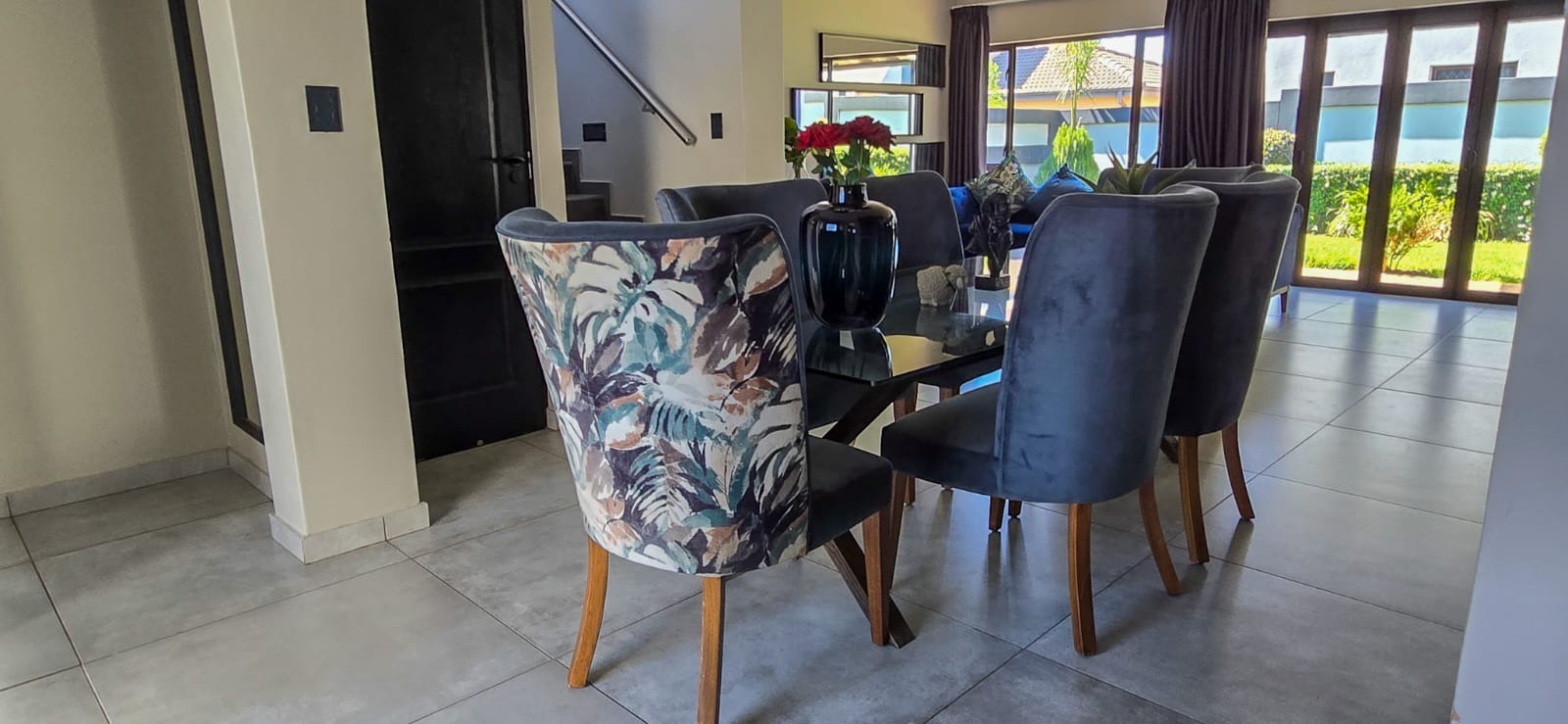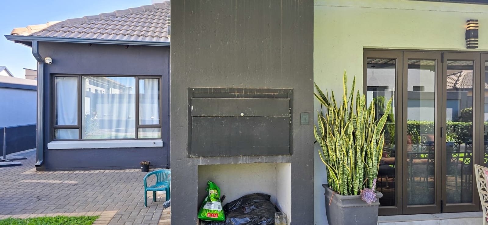 A guest bedroom and a full bathroom complete the downstairs level, offering a private and comfortable retreat for visitors or extended family. Large sliding doors open up to a covered patio that blends indoor and outdoor living. Here you’ll find a spacious entertainment area with a built-in braai, ample seating, and views of the beautifully landscaped garden perfect for hosting or simply unwinding. For evenings under the stars, the boma area offers a sophisticated yet cozy outdoor escape where friends and family can gather around the fire.