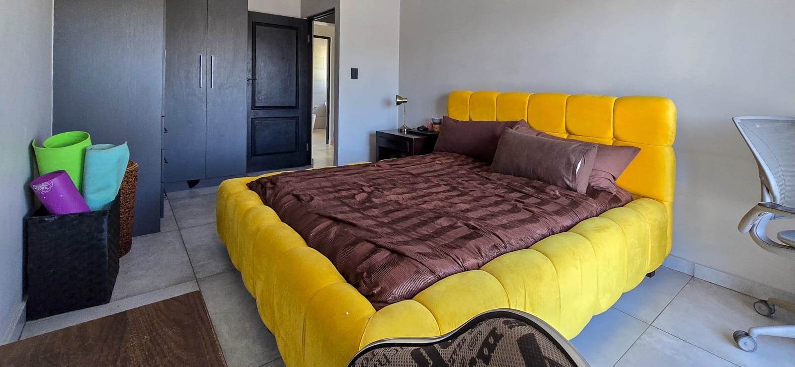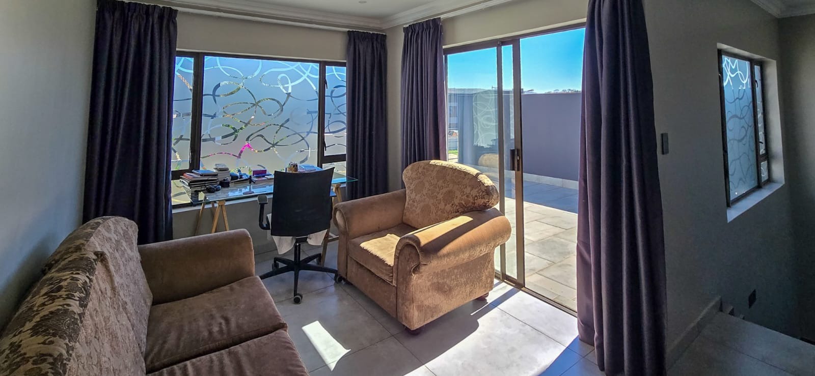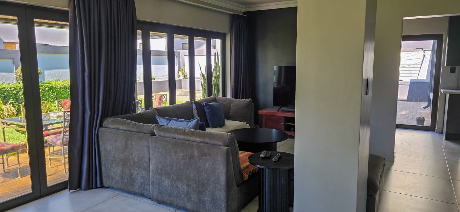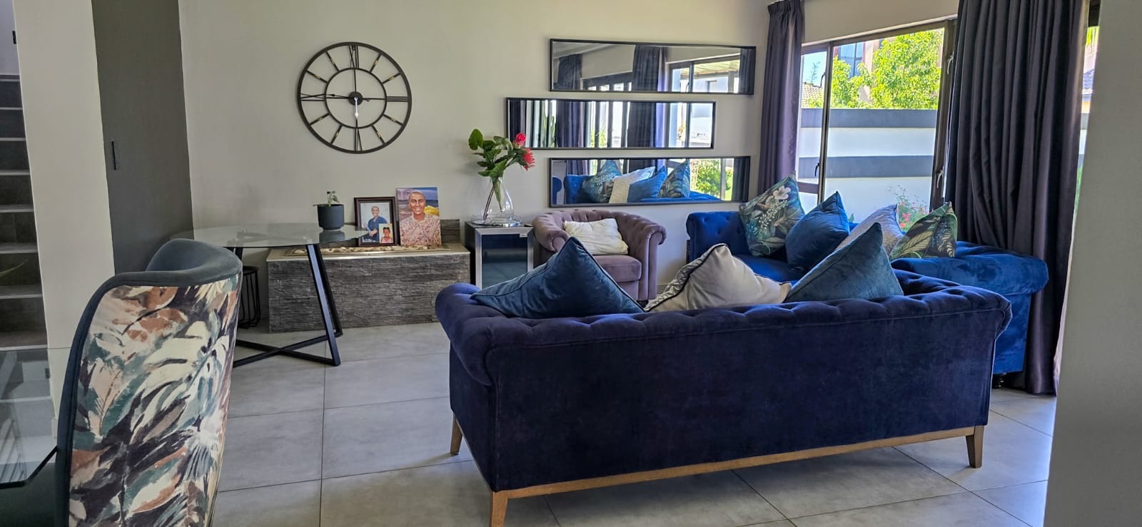 A guest bedroom and a full bathroom complete the downstairs level, offering a private and comfortable retreat for visitors or extended family. Large sliding doors open up to a covered patio that blends indoor and outdoor living. Here you’ll find a spacious entertainment area with a built-in braai, ample seating, and views of the beautifully landscaped garden perfect for hosting or simply unwinding. For evenings under the stars, the boma area offers a sophisticated yet cozy outdoor escape where friends and family can gather around the fire.