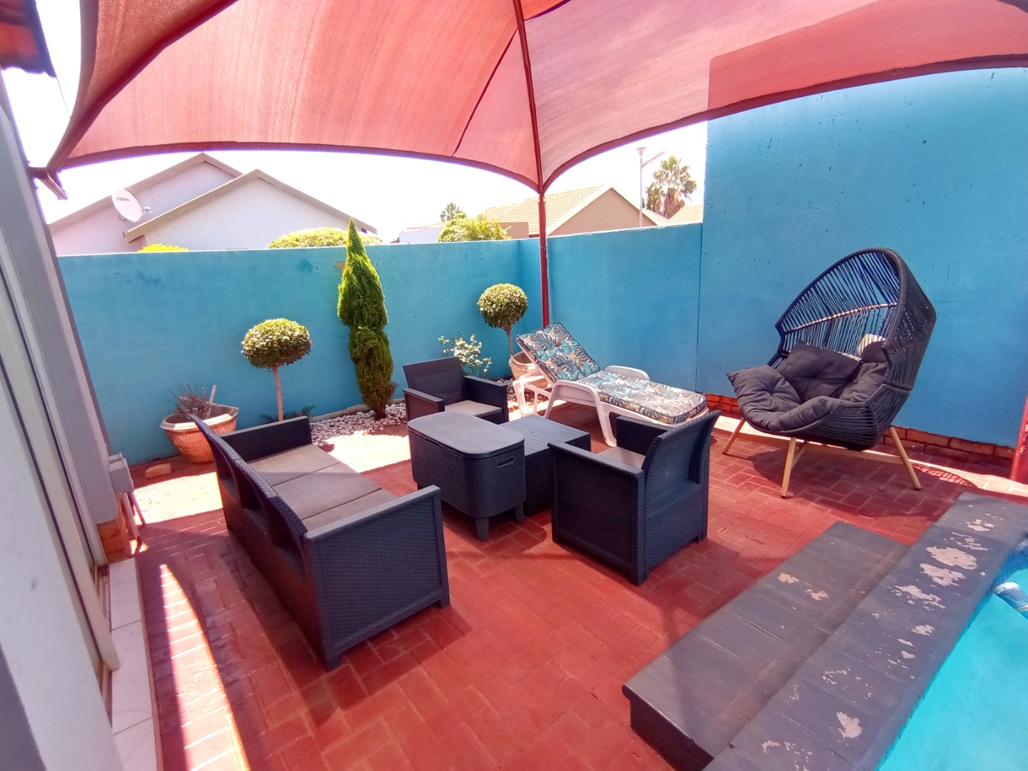 - Outside, get ready to enjoy your very own private swimming pool, guest toilet and a paved entertainment area with shaded seating, ideal for relaxing or hosting friends.