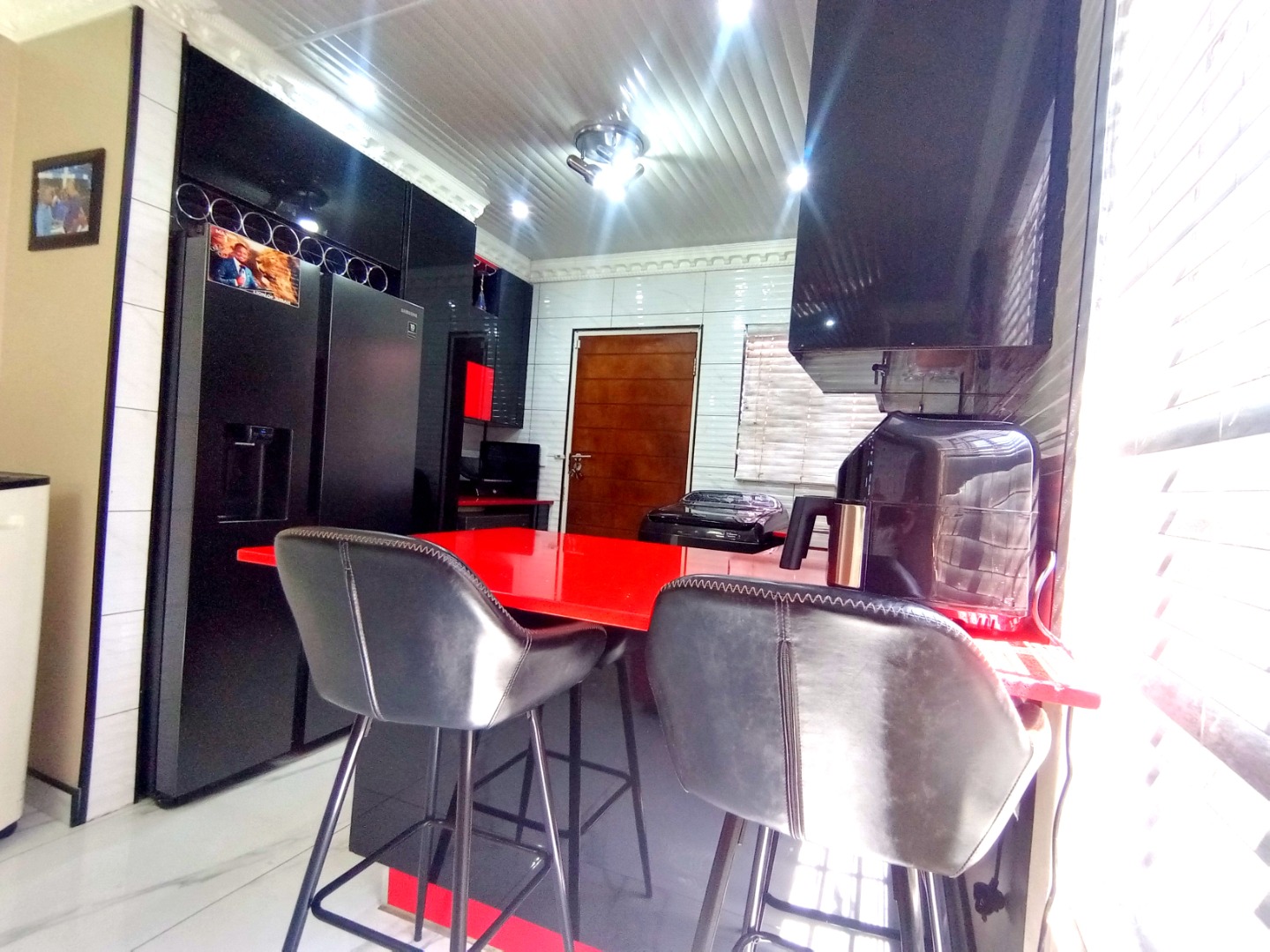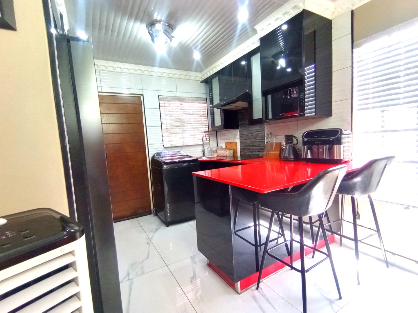 - A modern kitchen that really pops with its glossy black cabinets and a striking red countertop, complete with an island and bar seating – perfect for casual meals.