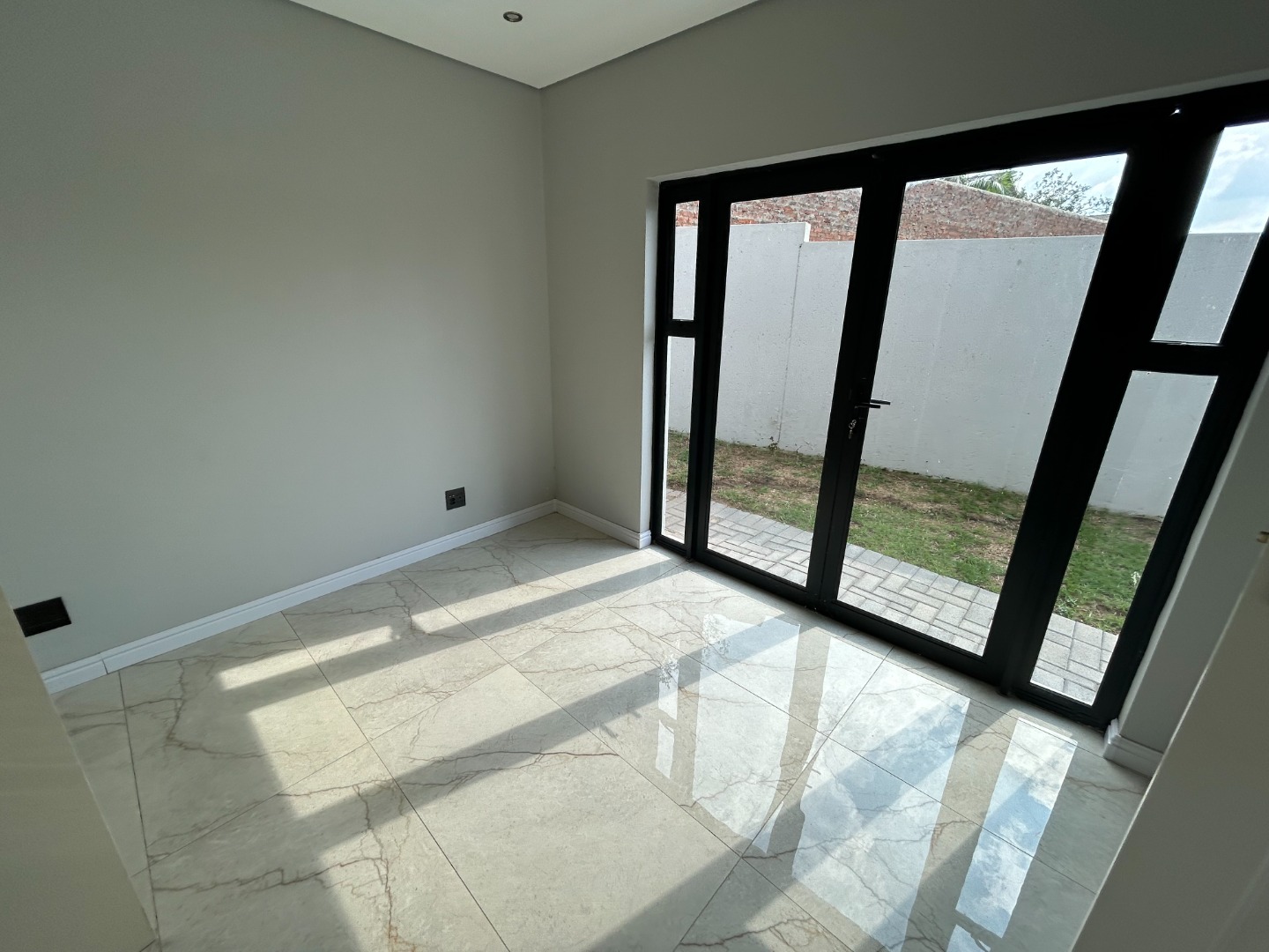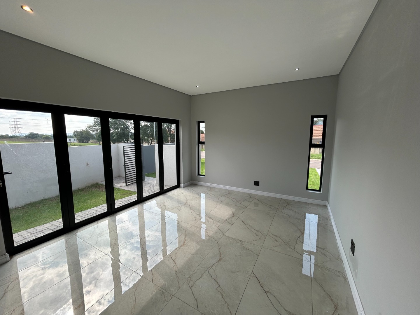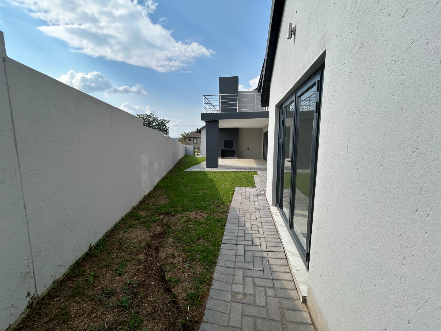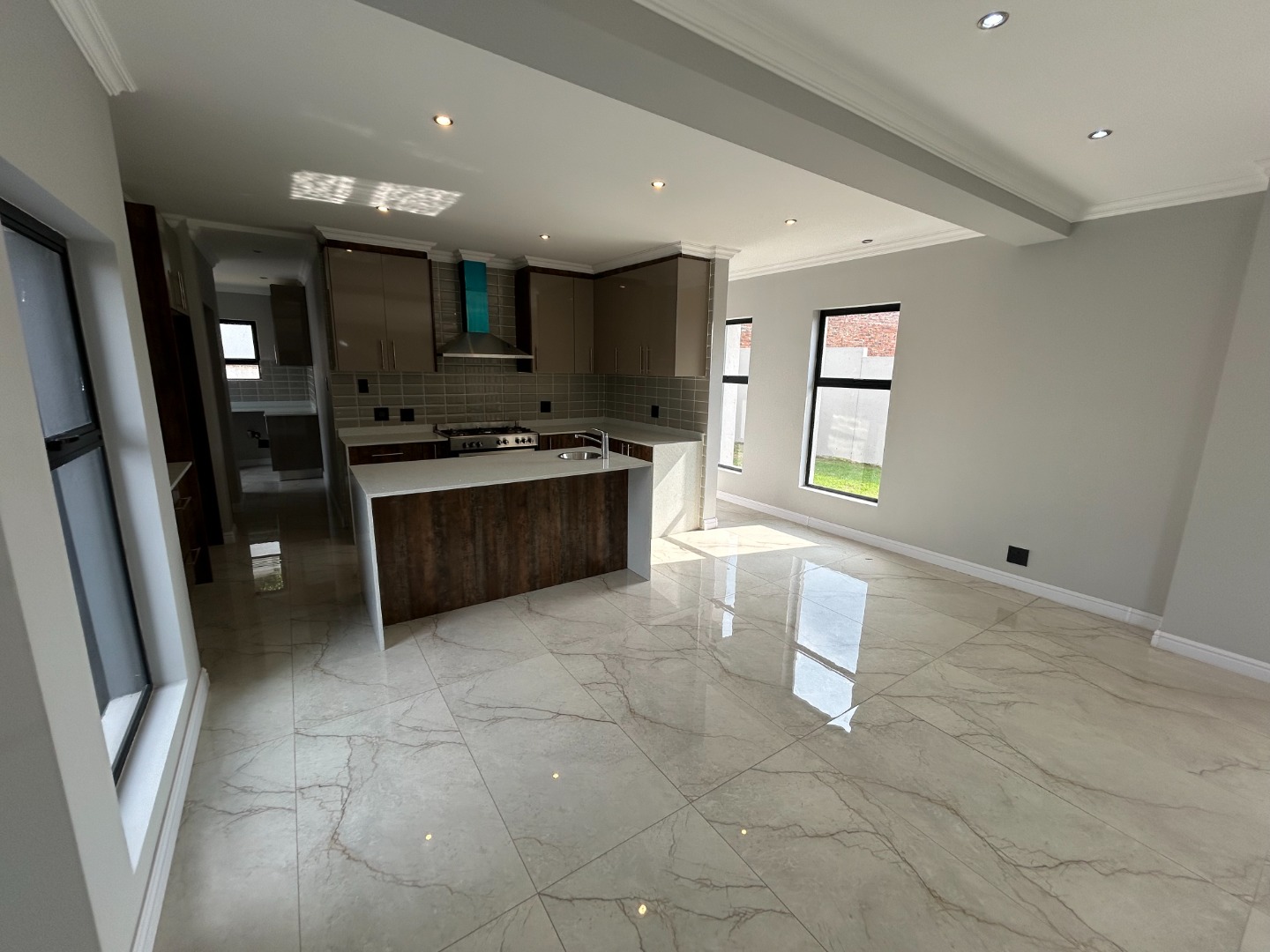 The modern kitchen serves as the heart of the home, featuring sleek finishes and seamless flow into the open-plan living spaces. A built-in braai extends the entertainment lifestyle, allowing for both indoor and outdoor gatherings. Adding to its unique appeal, the home also includes a dedicated prayer or study room, creating a quiet sanctuary for reflection or productivity.