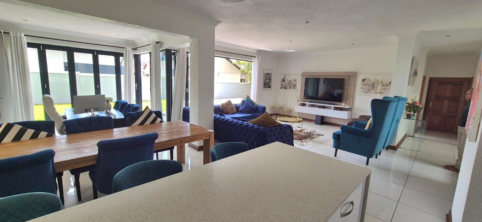 To the left, you’ll find two spacious living areas, seamlessly combining a dining room and TV lounge. These flow effortlessly into an enclosed braai room, which opens onto the garden through stacker doors — perfect for indoor-outdoor entertaining in summer, or a cozy additional living space during winter months.