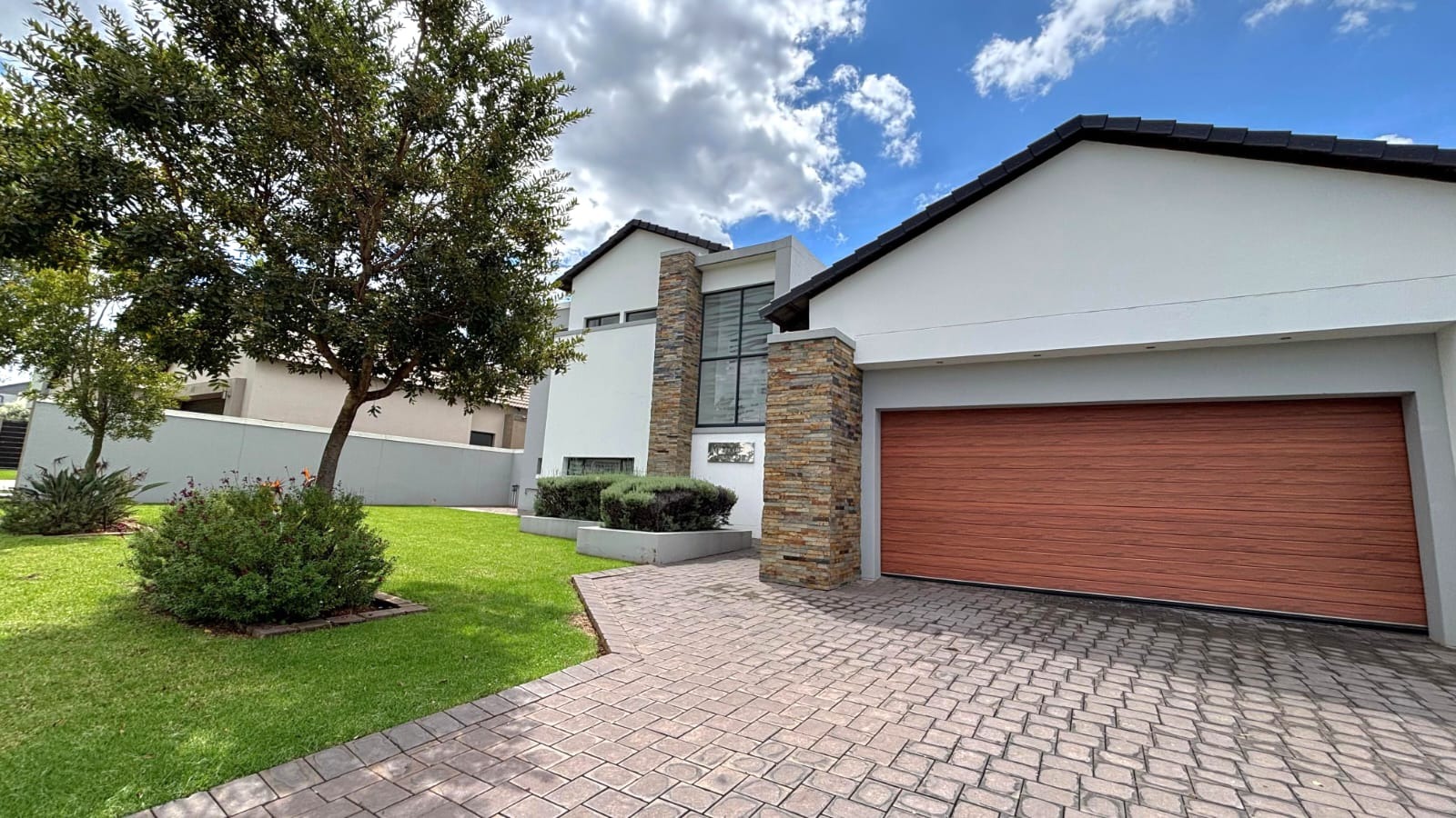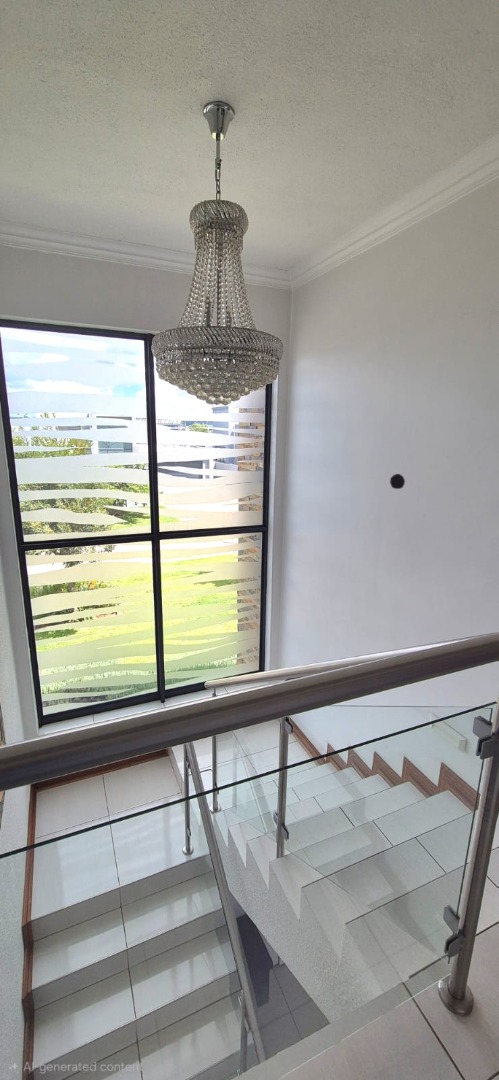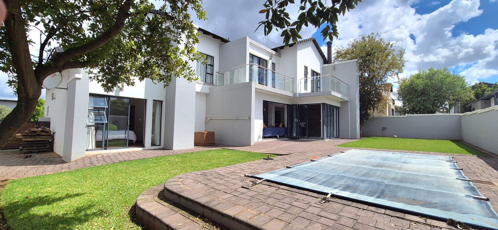 Upstairs, you’ll find three well-proportioned bedrooms. Two bedrooms share a full bathroom, while the main suite boasts a walk-in cupboard leading into a stylish en-suite bathroom. Both the main bedroom and one additional bedroom open onto a patio overlooking the spacious stand and sparkling pool.