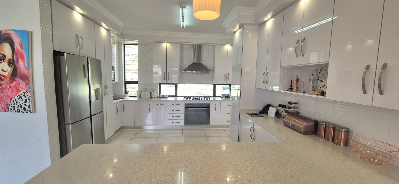 The adjacent kitchen is modern, bright, and generously sized, offering ample space for the whole family to cook and connect. A separate scullery provides convenience, with room for three appliances.
