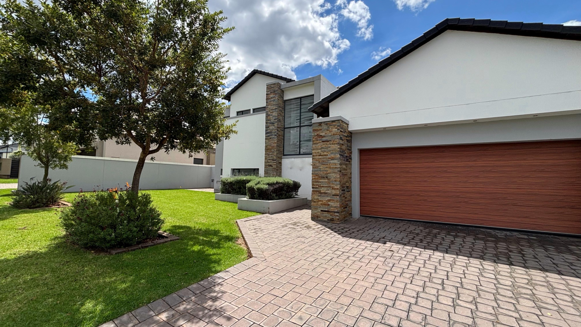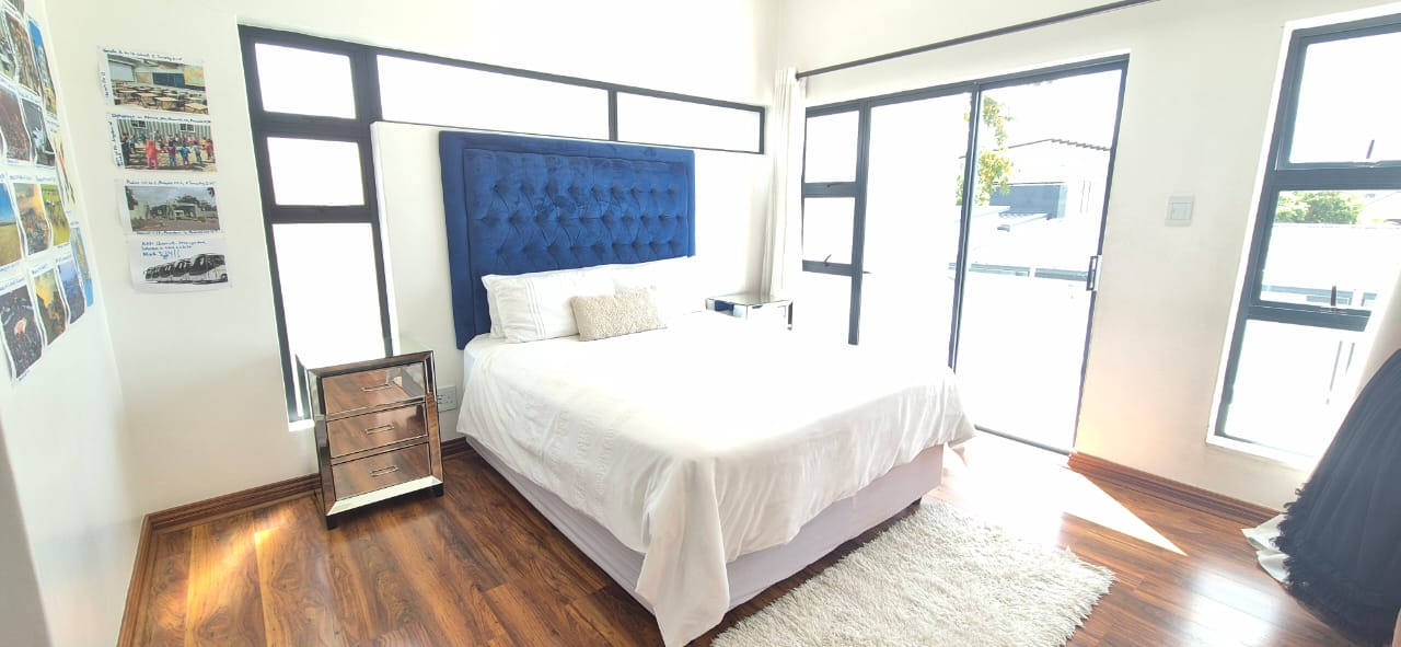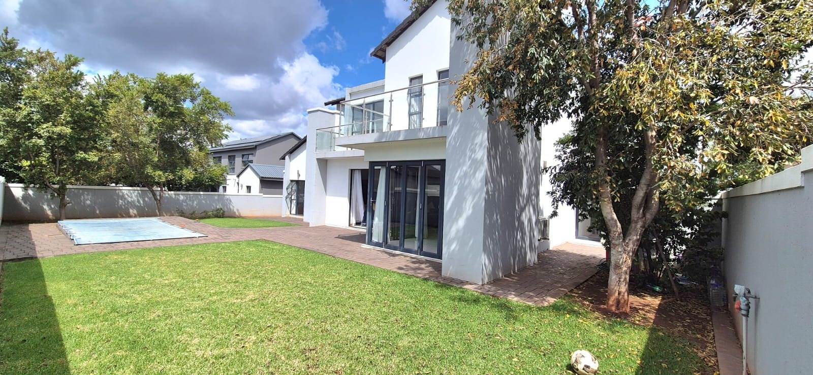 Upstairs, you’ll find three well-proportioned bedrooms. Two bedrooms share a full bathroom, while the main suite boasts a walk-in cupboard leading into a stylish en-suite bathroom. Both the main bedroom and one additional bedroom open onto a patio overlooking the spacious stand and sparkling pool.