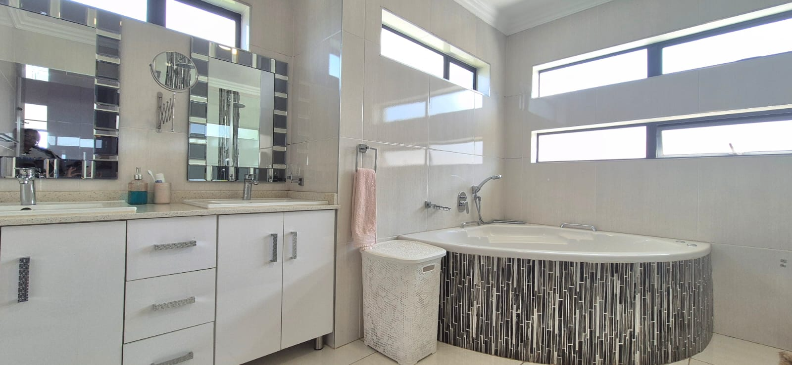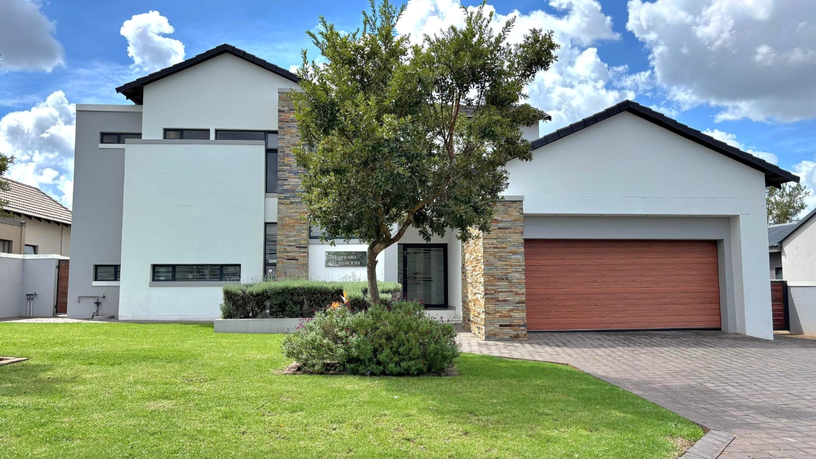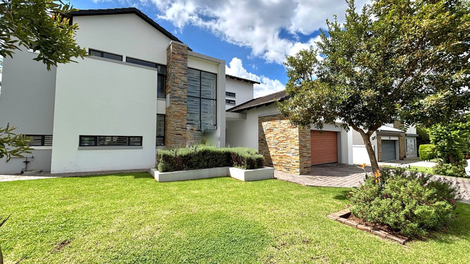 Upstairs, you’ll find three well-proportioned bedrooms. Two bedrooms share a full bathroom, while the main suite boasts a walk-in cupboard leading into a stylish en-suite bathroom. Both the main bedroom and one additional bedroom open onto a patio overlooking the spacious stand and sparkling pool.