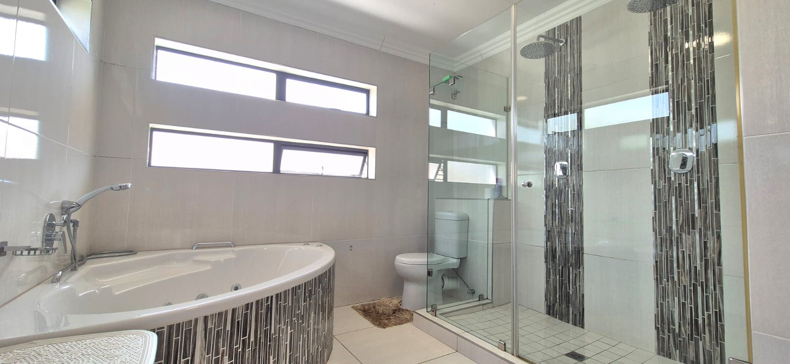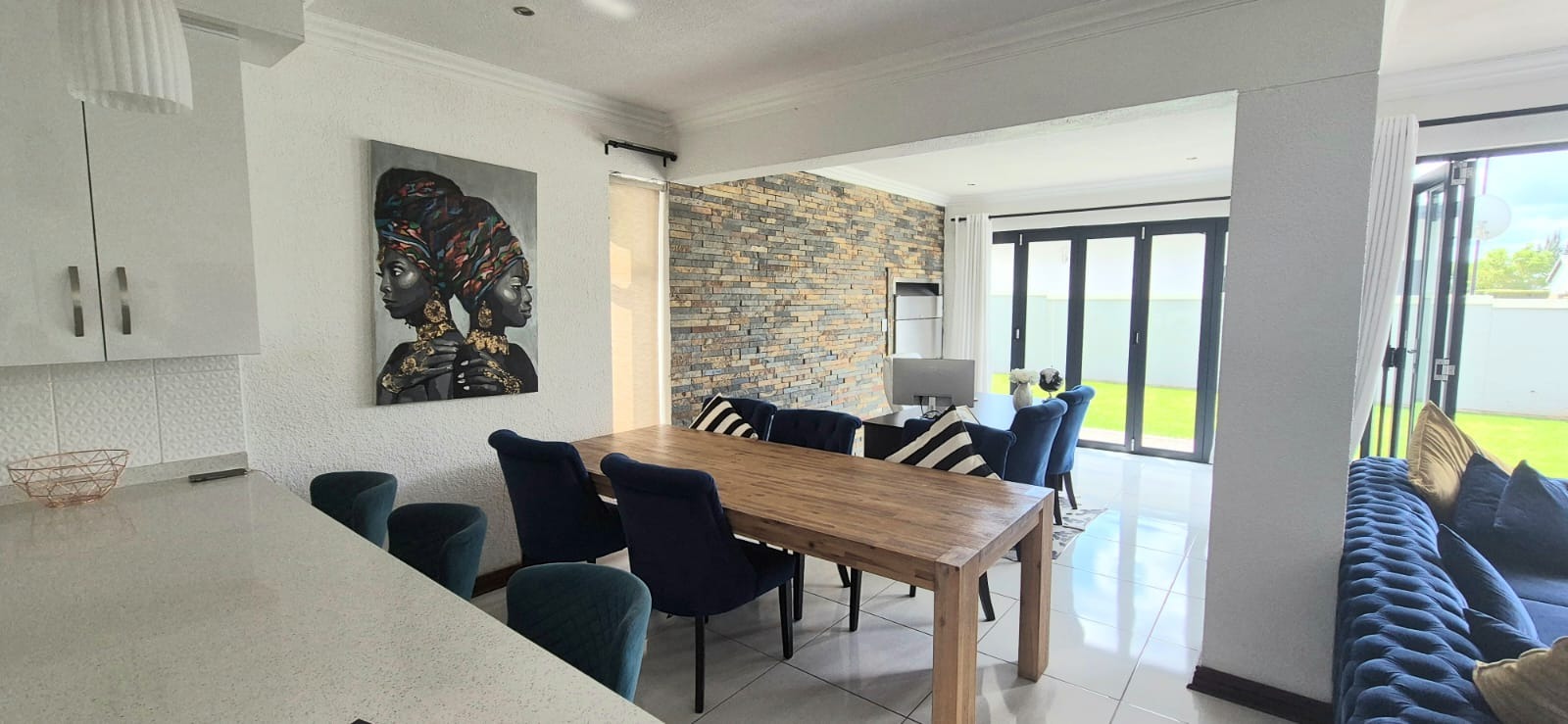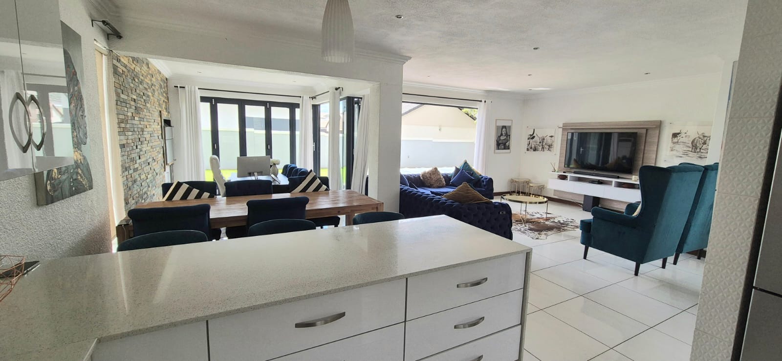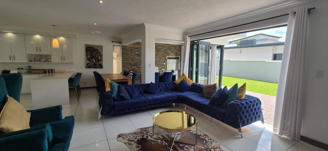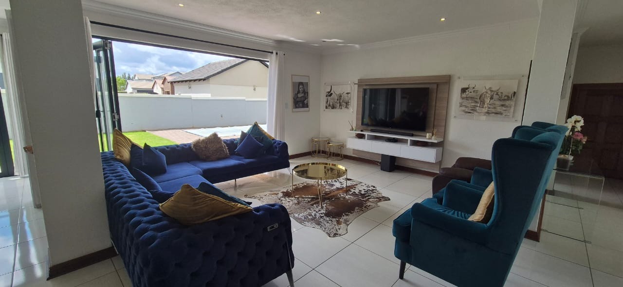 To the left, you’ll find two spacious living areas, seamlessly combining a dining room and TV lounge. These flow effortlessly into an enclosed braai room, which opens onto the garden through stacker doors — perfect for indoor-outdoor entertaining in summer, or a cozy additional living space during winter months.
