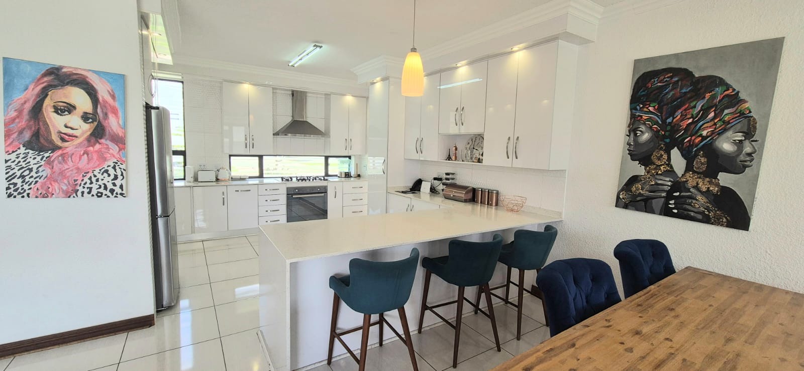 The adjacent kitchen is modern, bright, and generously sized, offering ample space for the whole family to cook and connect. A separate scullery provides convenience, with room for three appliances.