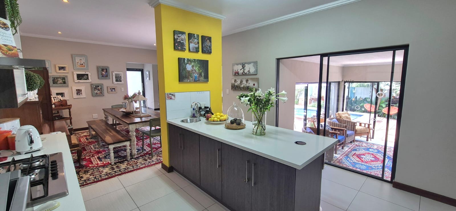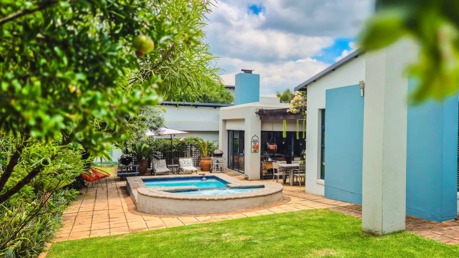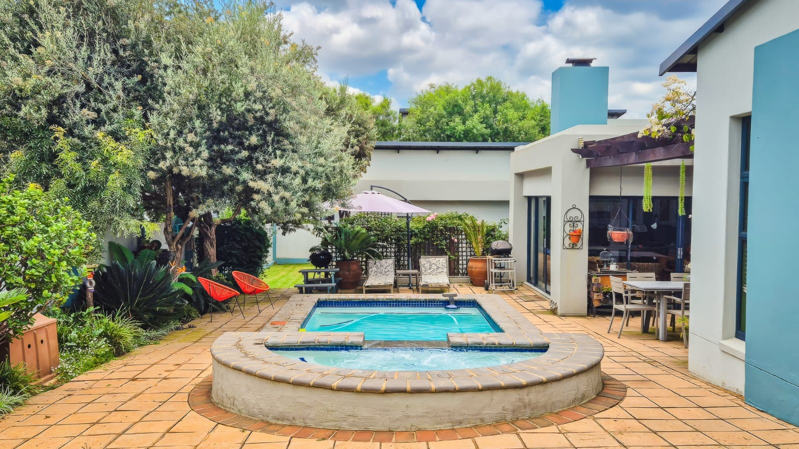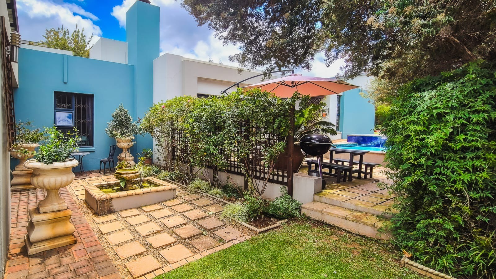 The kitchen leads into a sizable enclosed braai room with sliding doors, which opens seamlessly onto the garden and swimming pool. The gentle sound of a water feature enhances the peaceful atmosphere and adds to the home’s serene character.