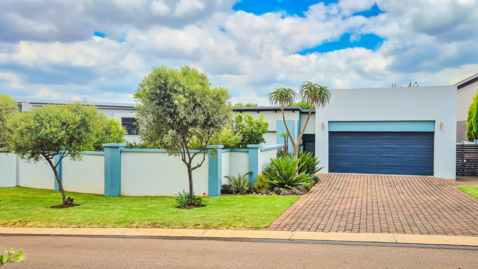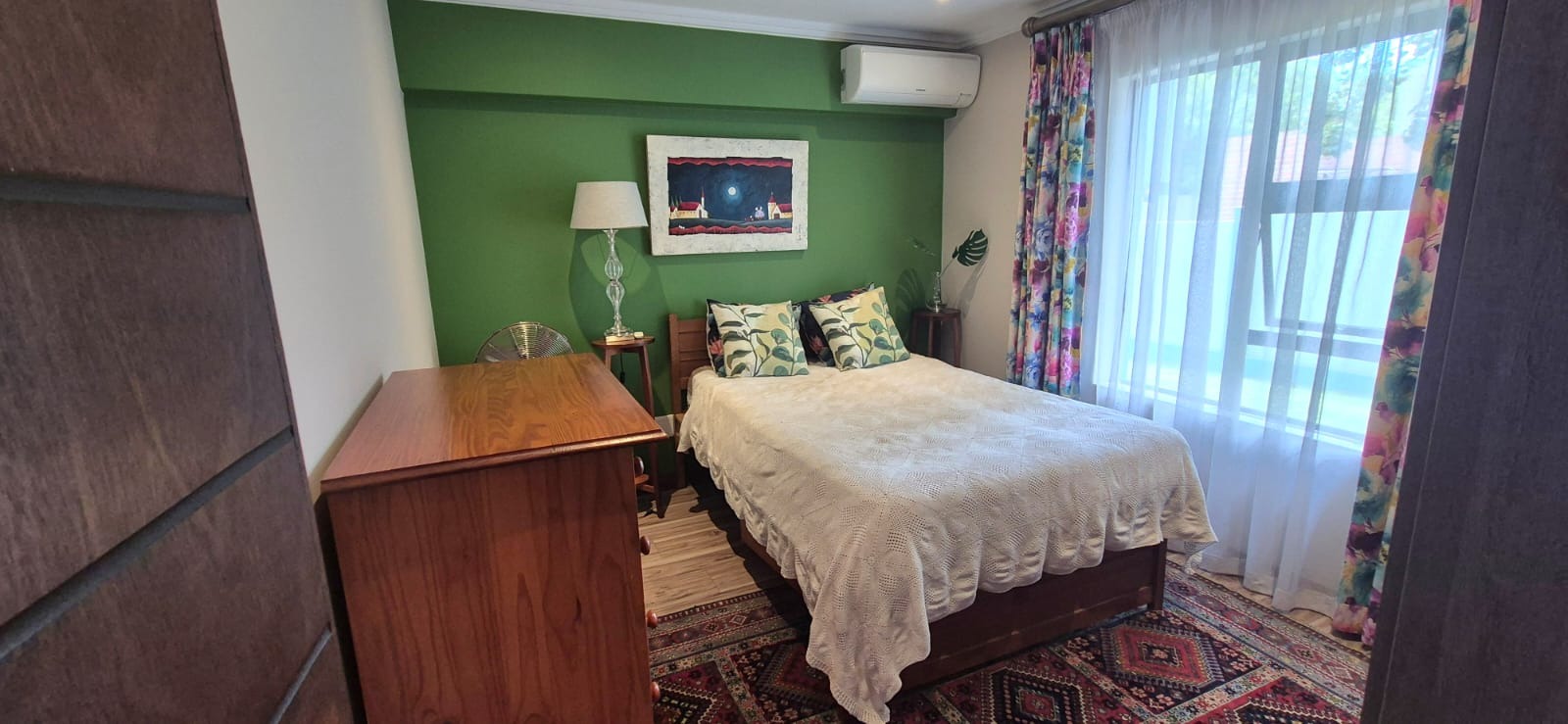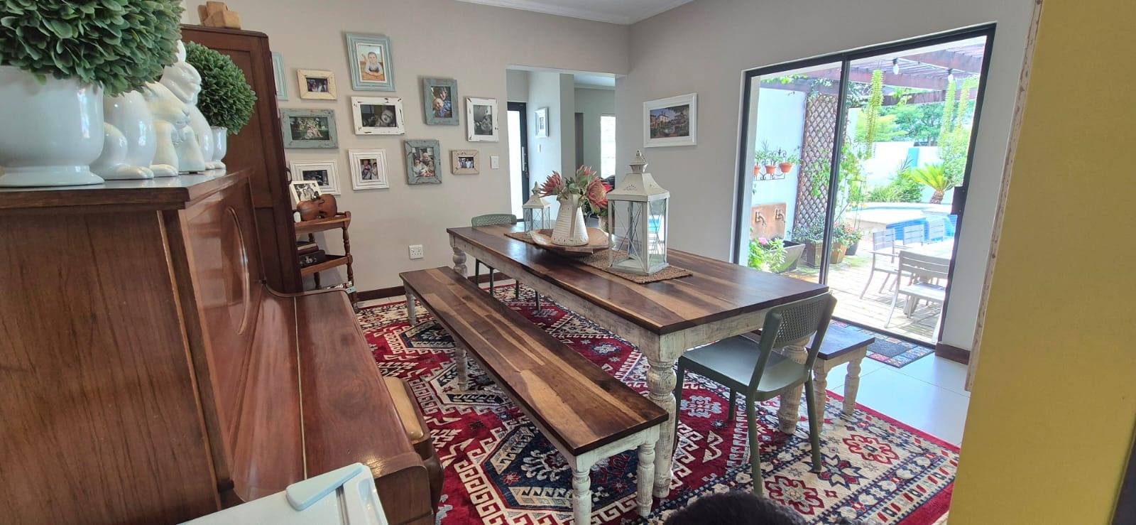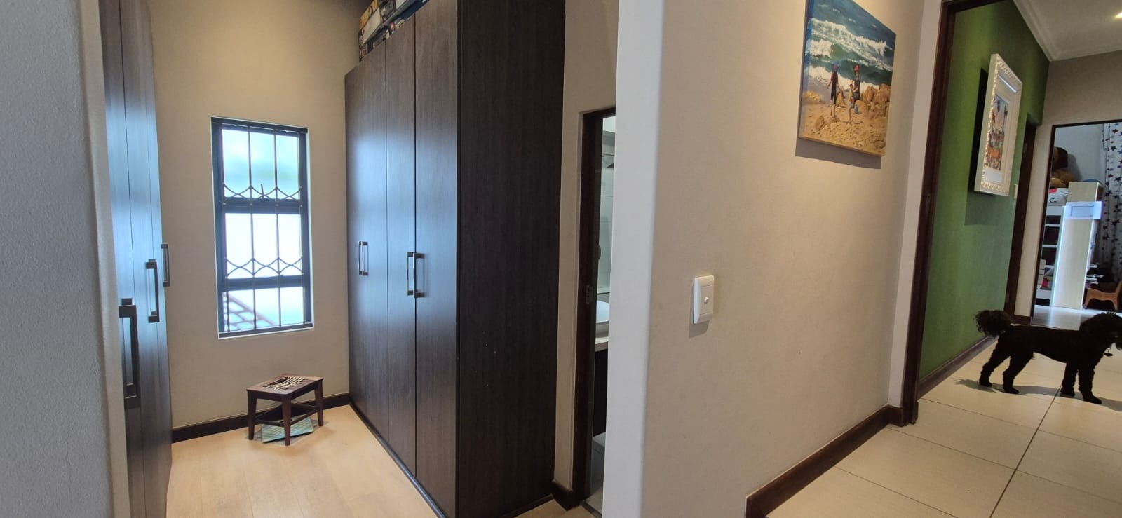 The kitchen leads into a sizable enclosed braai room with sliding doors, which opens seamlessly onto the garden and swimming pool. The gentle sound of a water feature enhances the peaceful atmosphere and adds to the home’s serene character.
