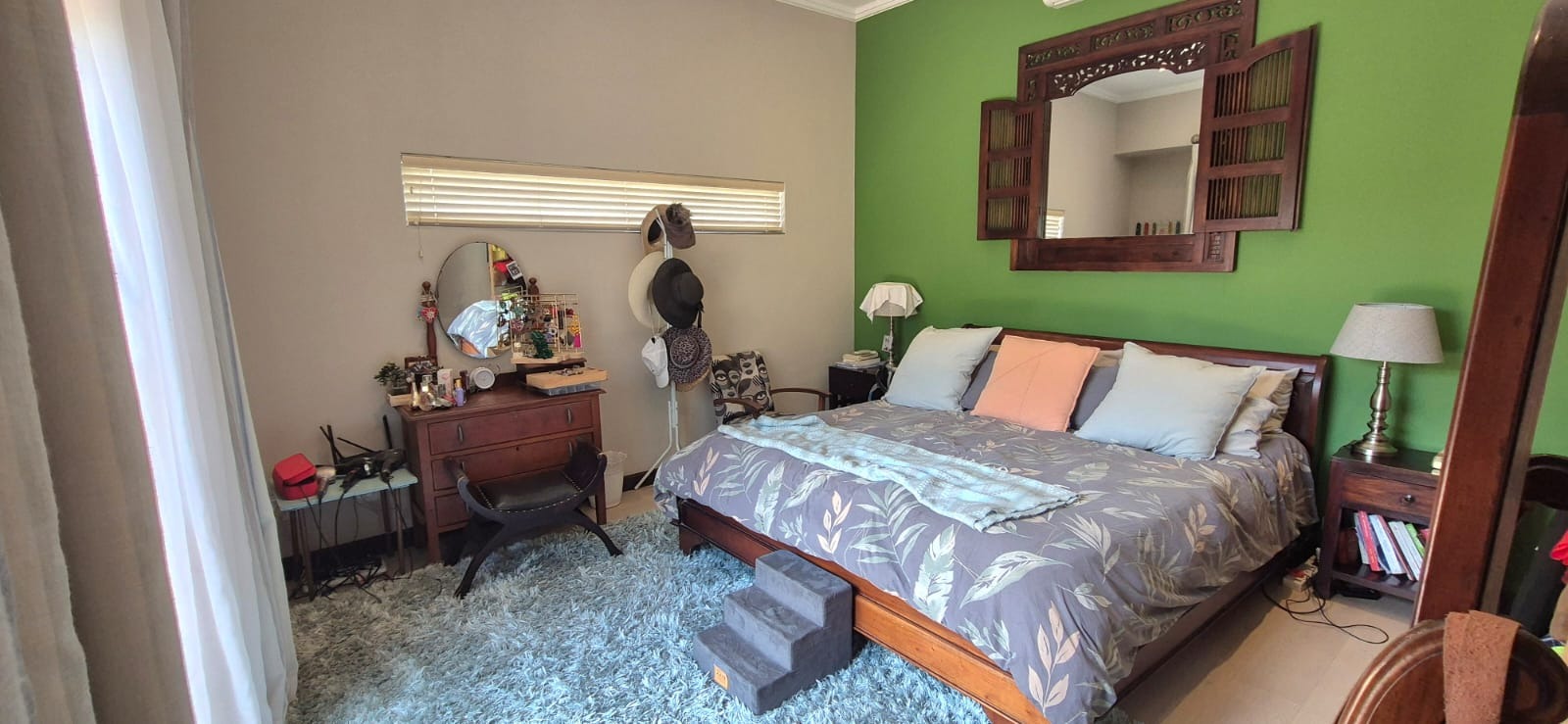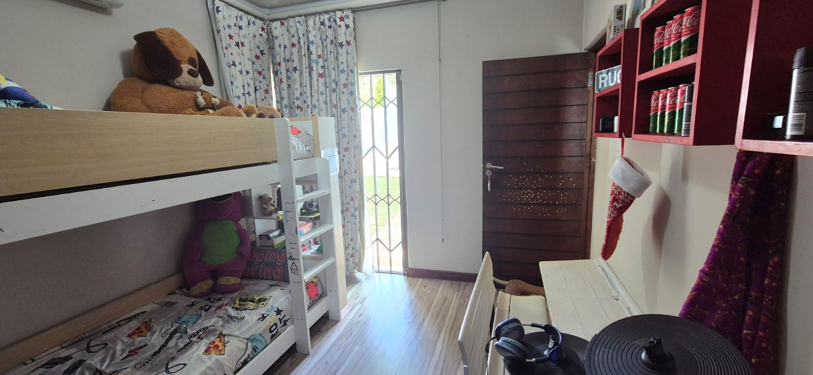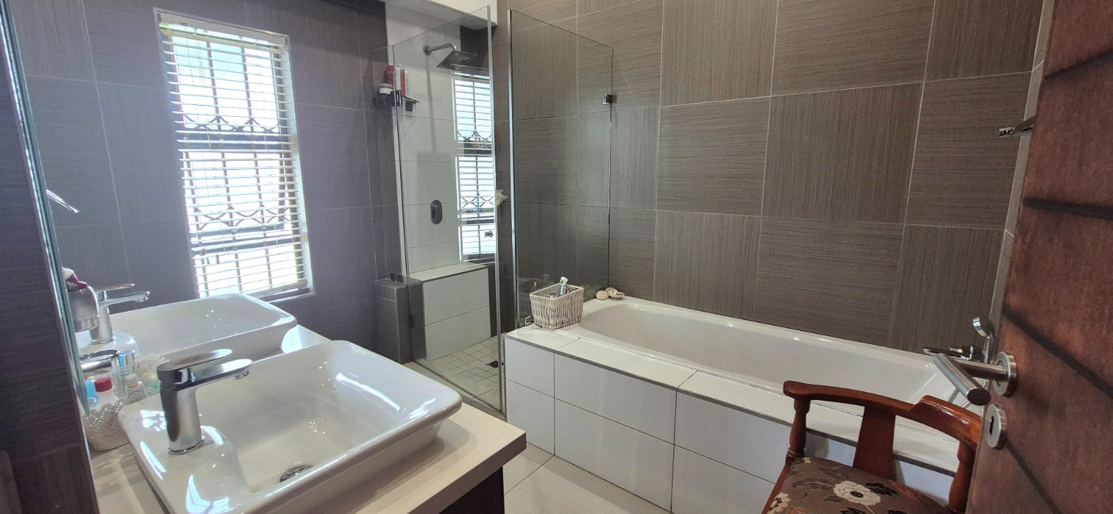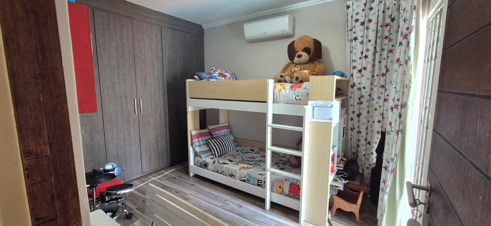 The kitchen leads into a sizable enclosed braai room with sliding doors, which opens seamlessly onto the garden and swimming pool. The gentle sound of a water feature enhances the peaceful atmosphere and adds to the home’s serene character.