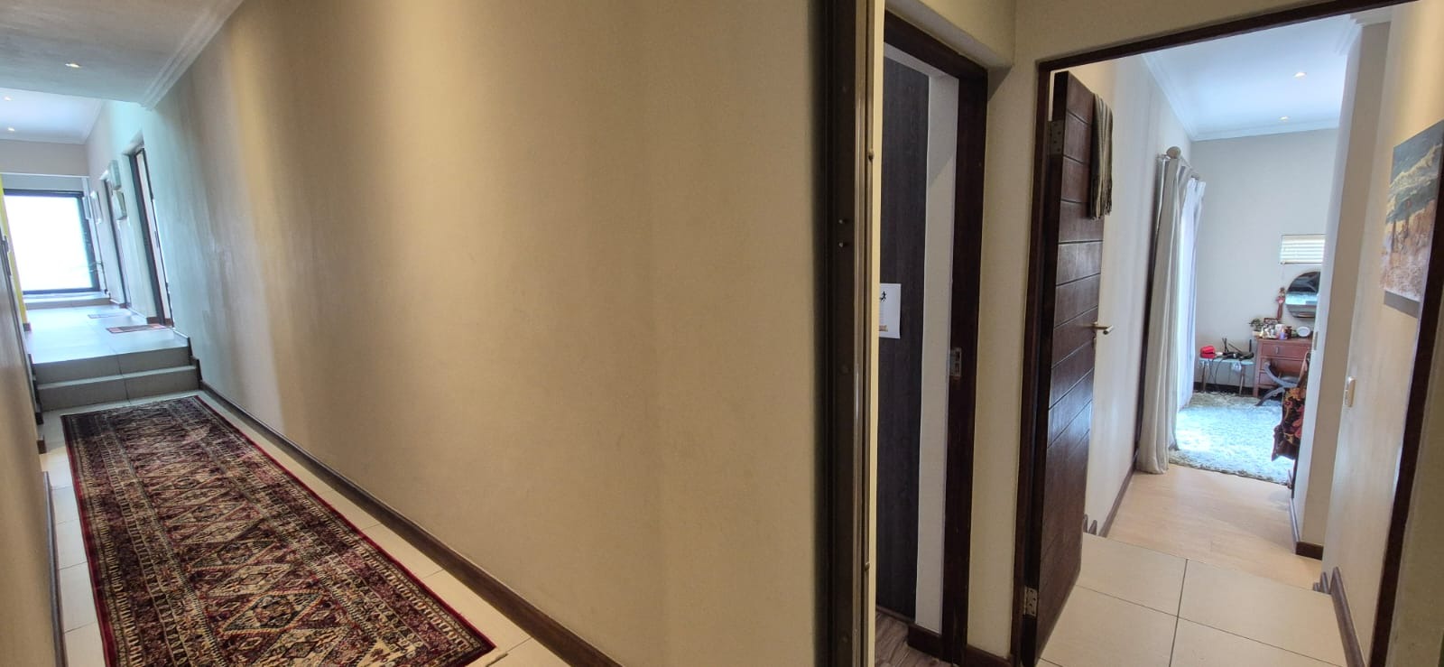 Down the hallway, you will find the guest bathroom, which also serves the guest bedroom. The spacious main bedroom is privately positioned and connects to the en-suite bathroom via a dressing room. Two additional bedrooms share a third full bathroom.