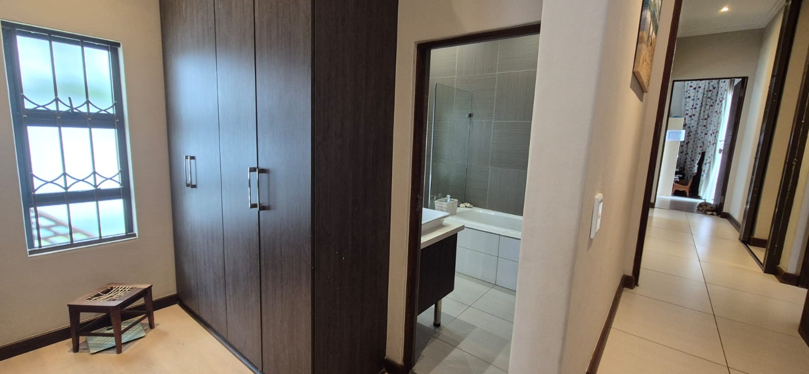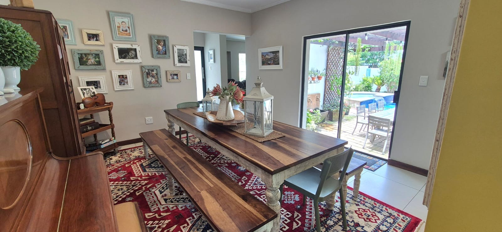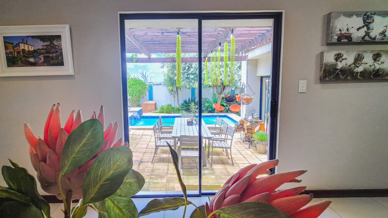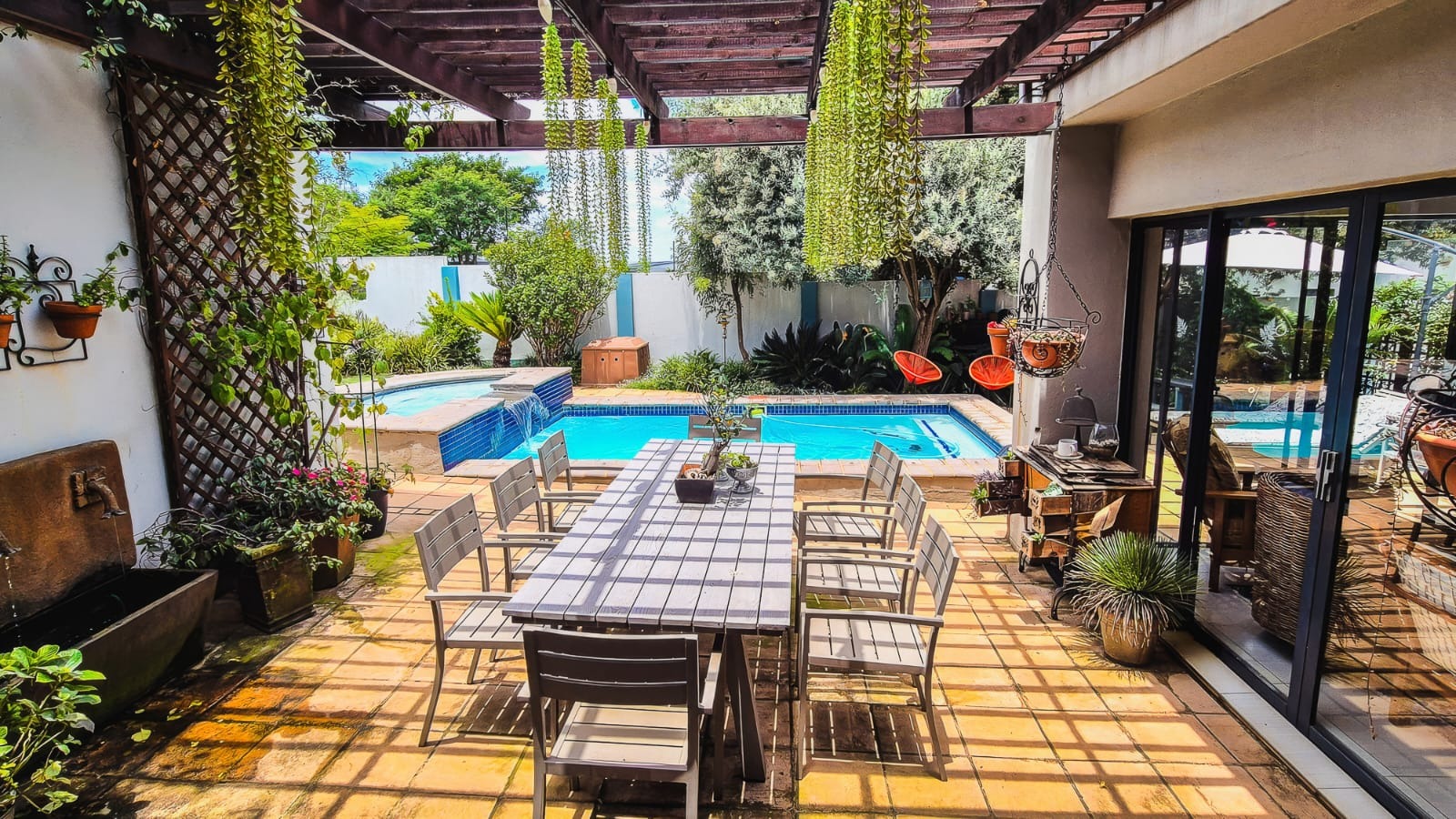 The kitchen leads into a sizable enclosed braai room with sliding doors, which opens seamlessly onto the garden and swimming pool. The gentle sound of a water feature enhances the peaceful atmosphere and adds to the home’s serene character.