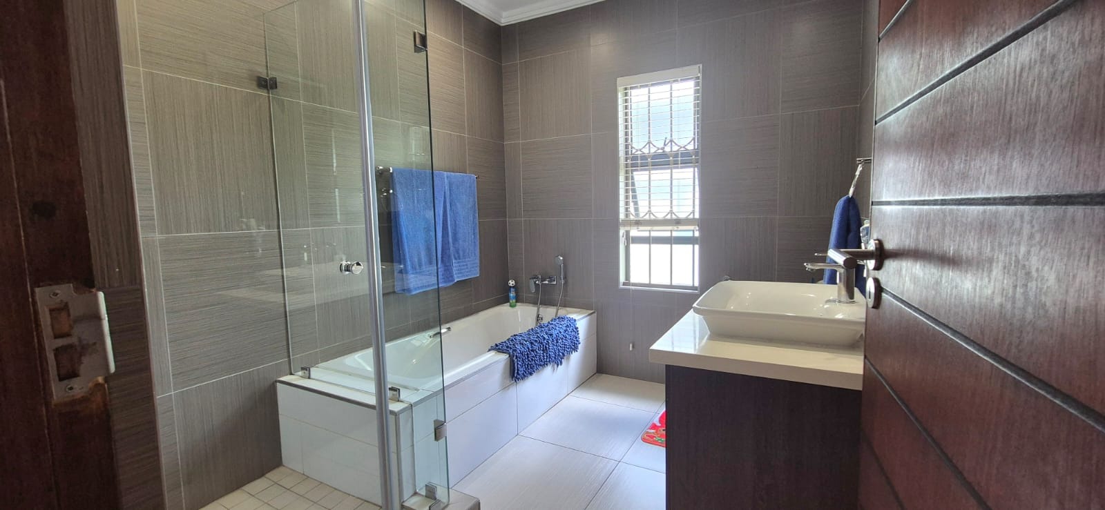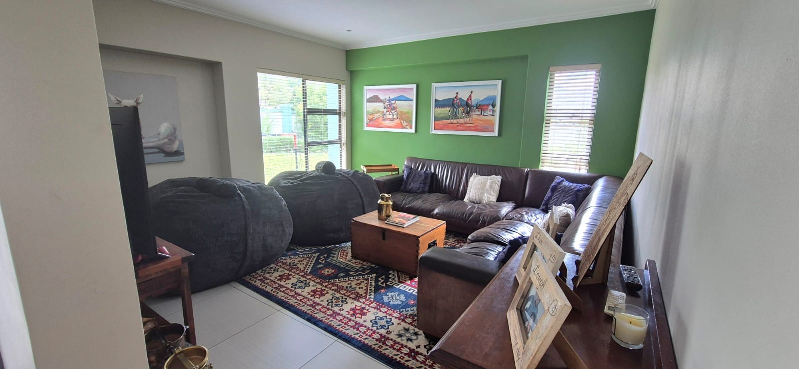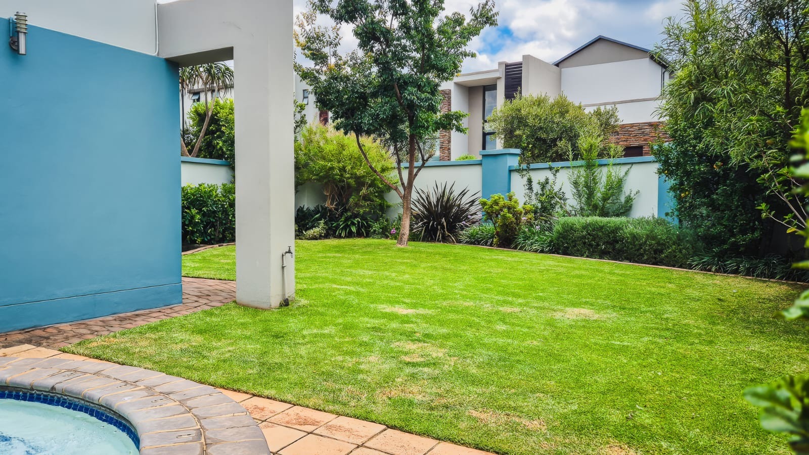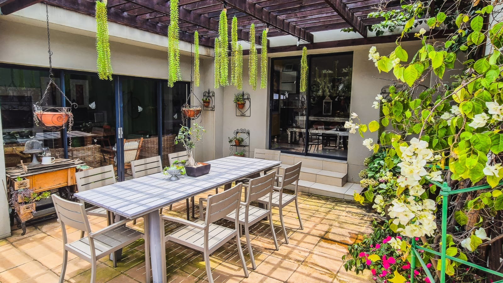 The kitchen leads into a sizable enclosed braai room with sliding doors, which opens seamlessly onto the garden and swimming pool. The gentle sound of a water feature enhances the peaceful atmosphere and adds to the home’s serene character.