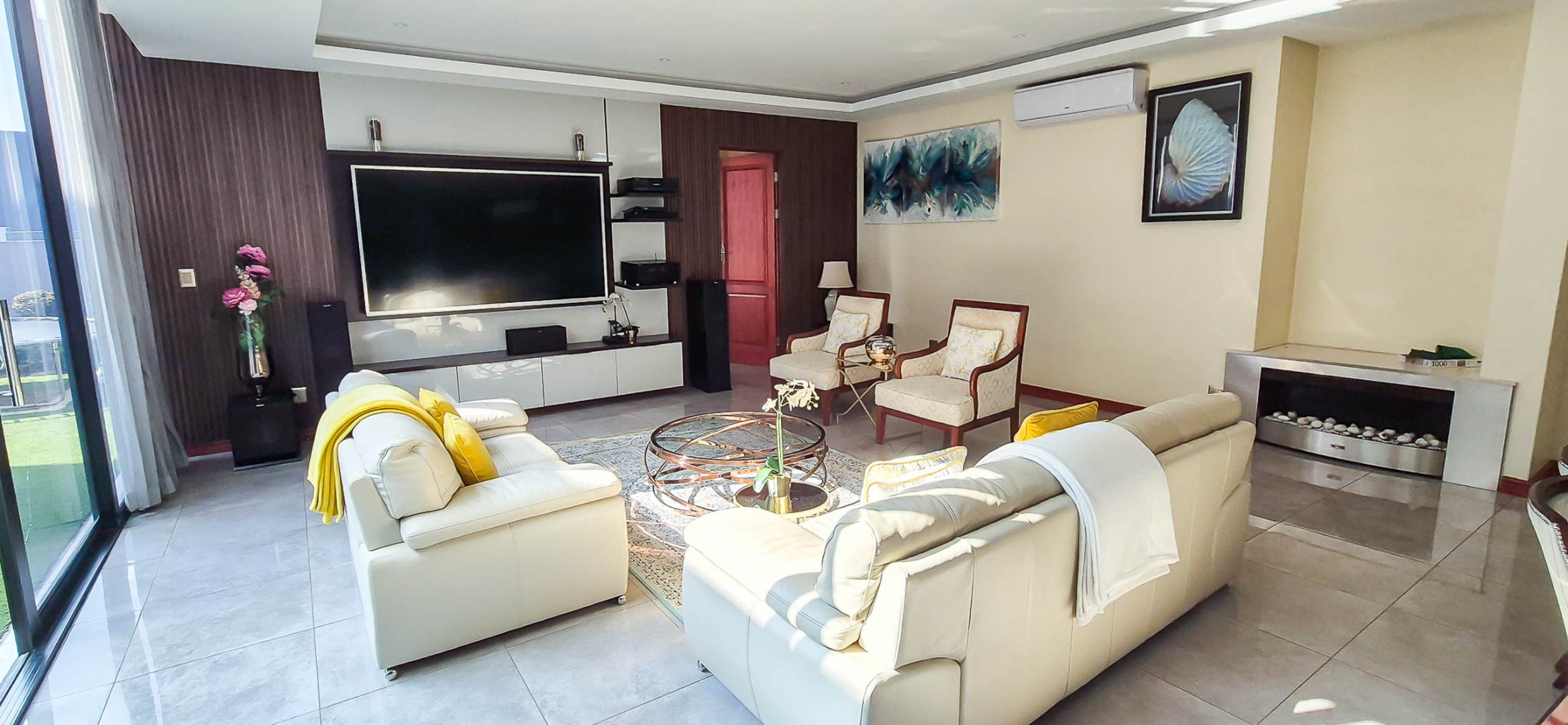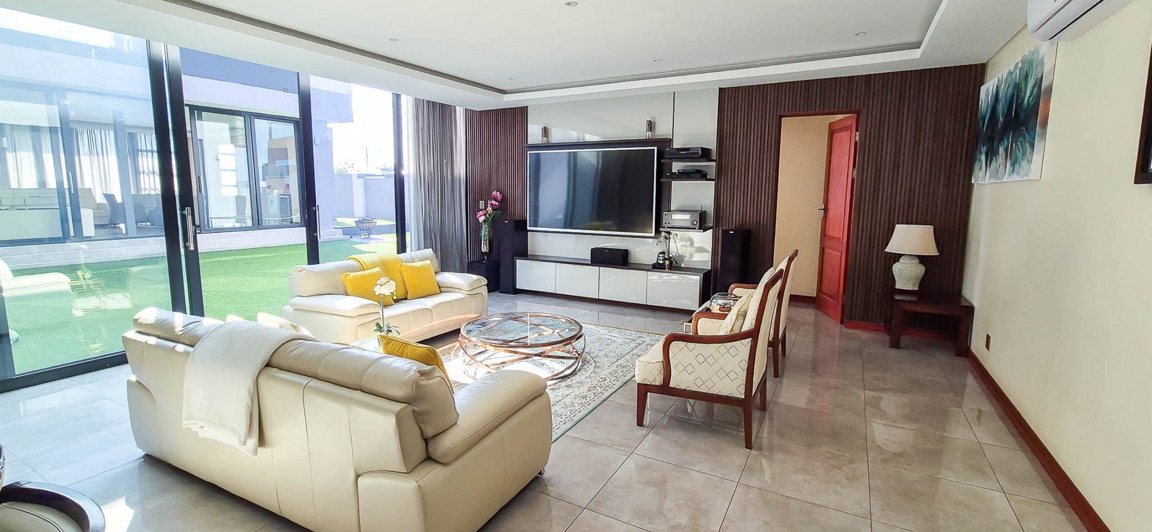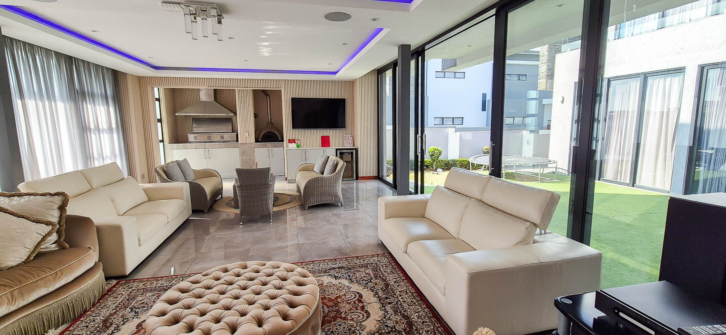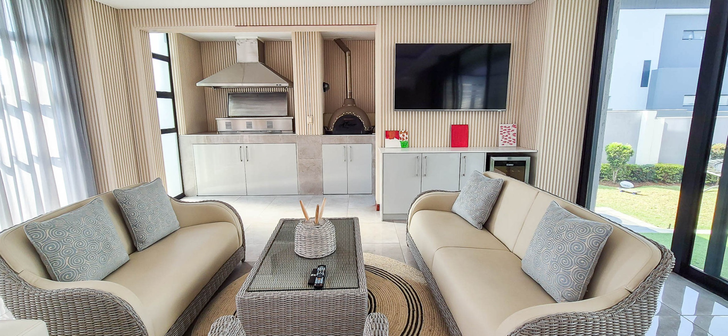 To your left, a grand entertainment area awaits — spacious enough to be divided into two distinct living zones. Enjoy a top-of-the-line built-in braai and a pizza oven, all seamlessly flowing out to the garden. Next door, your very own private movie room invites cosy evenings in.