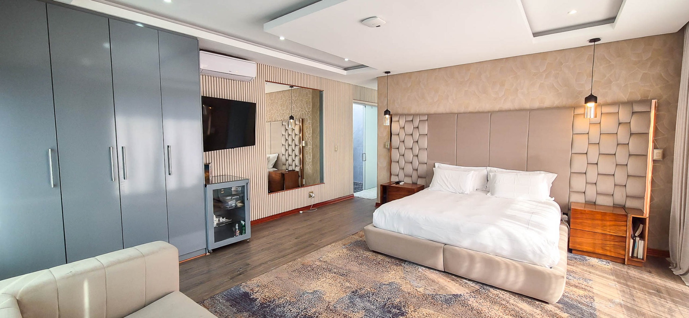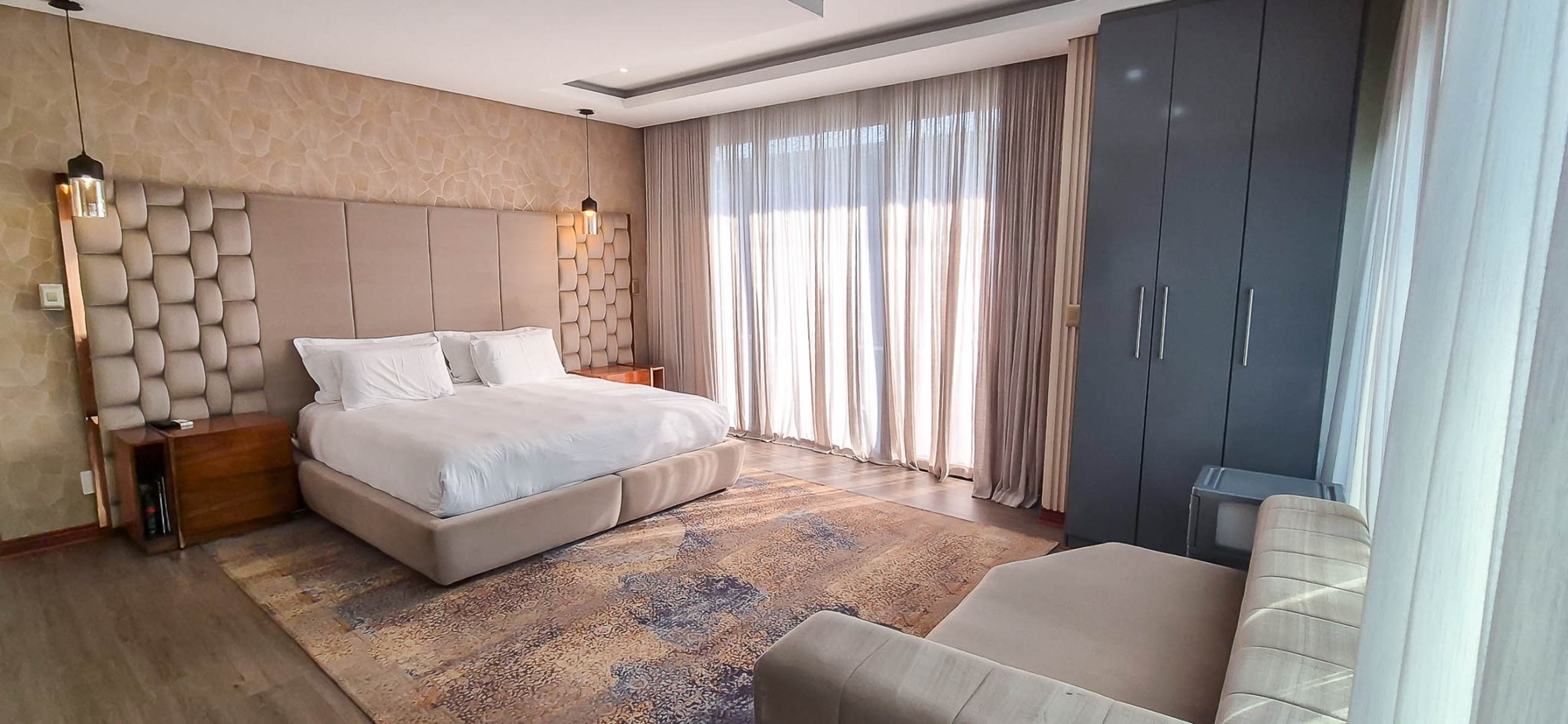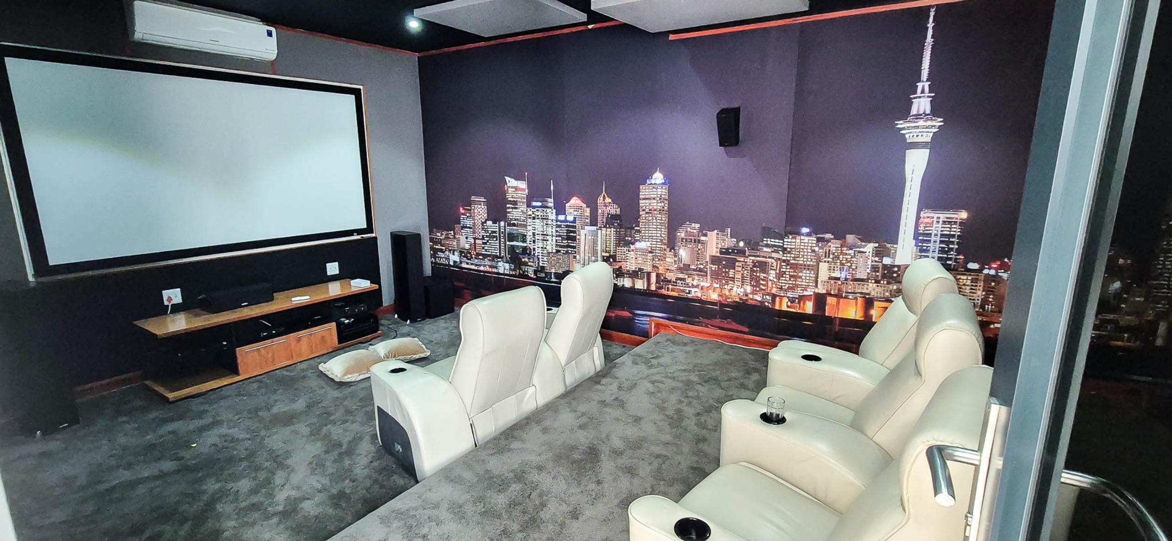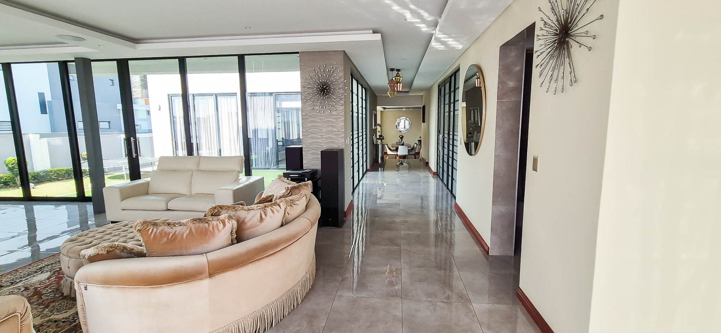 To your left, a grand entertainment area awaits — spacious enough to be divided into two distinct living zones. Enjoy a top-of-the-line built-in braai and a pizza oven, all seamlessly flowing out to the garden. Next door, your very own private movie room invites cosy evenings in.