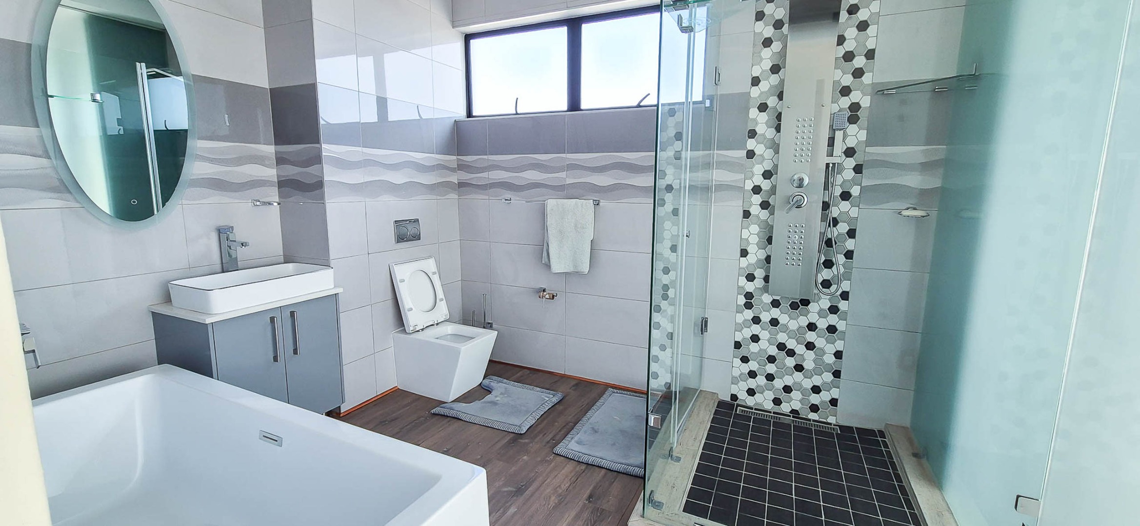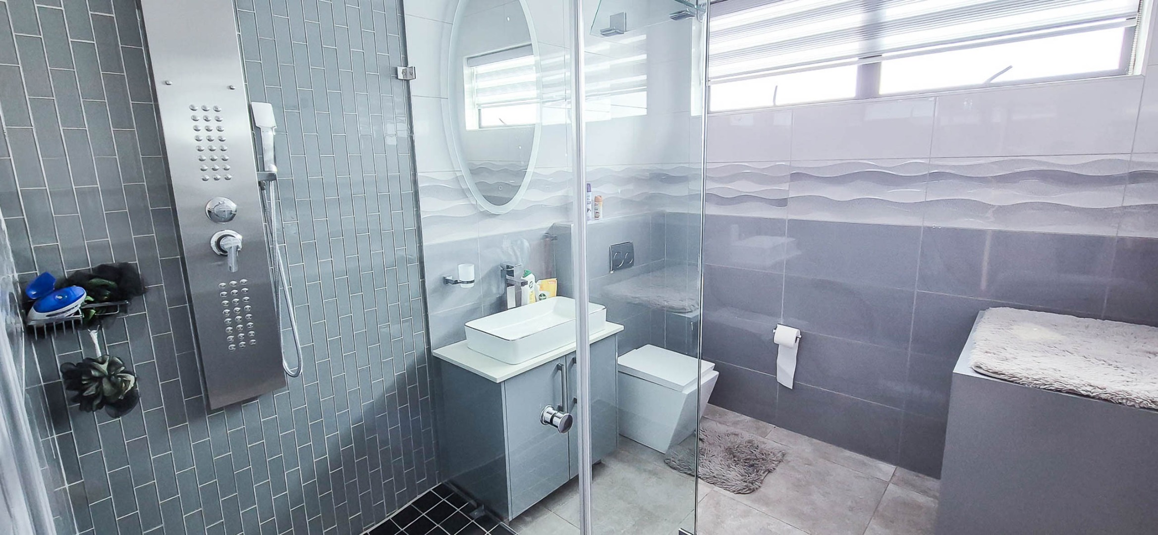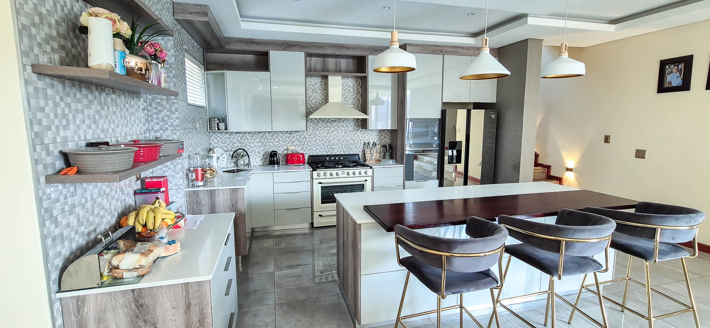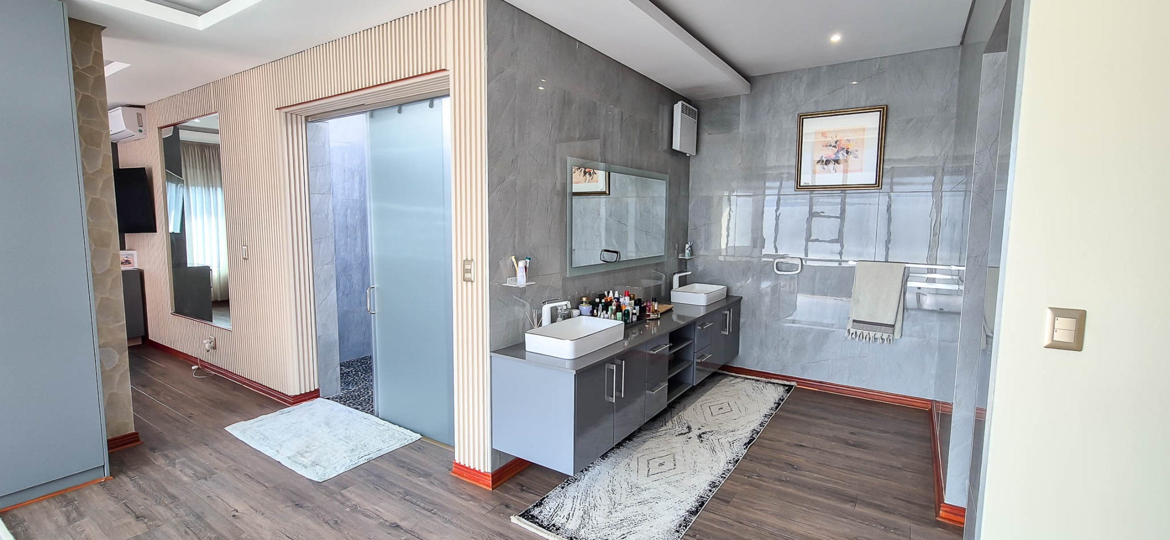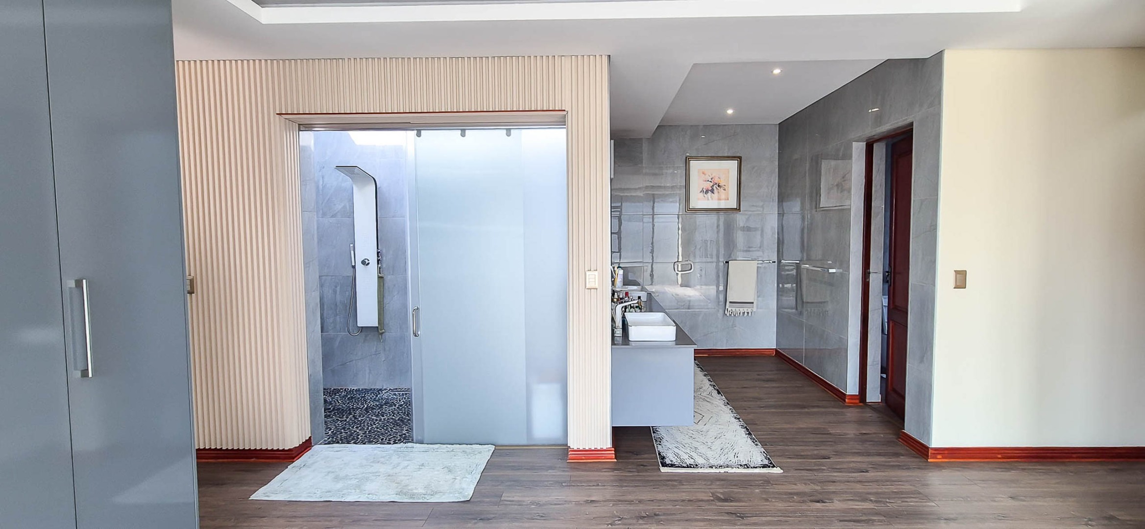 Upstairs, a family lounge opens onto a large patio with synthetic grass — the perfect spot for children to play on warm summer nights while parents unwind in front of the TV. The main bedroom exudes pure indulgence, with exceptional cupboard space and a luxurious double shower beneath a skylight, creating the feel of an outdoor retreat. Two additional ensuite bedrooms are complemented by a versatile play/study room.