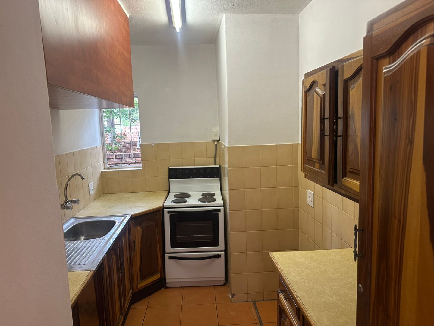 The kitchen is well fitted with beautiful real wood cupboards.