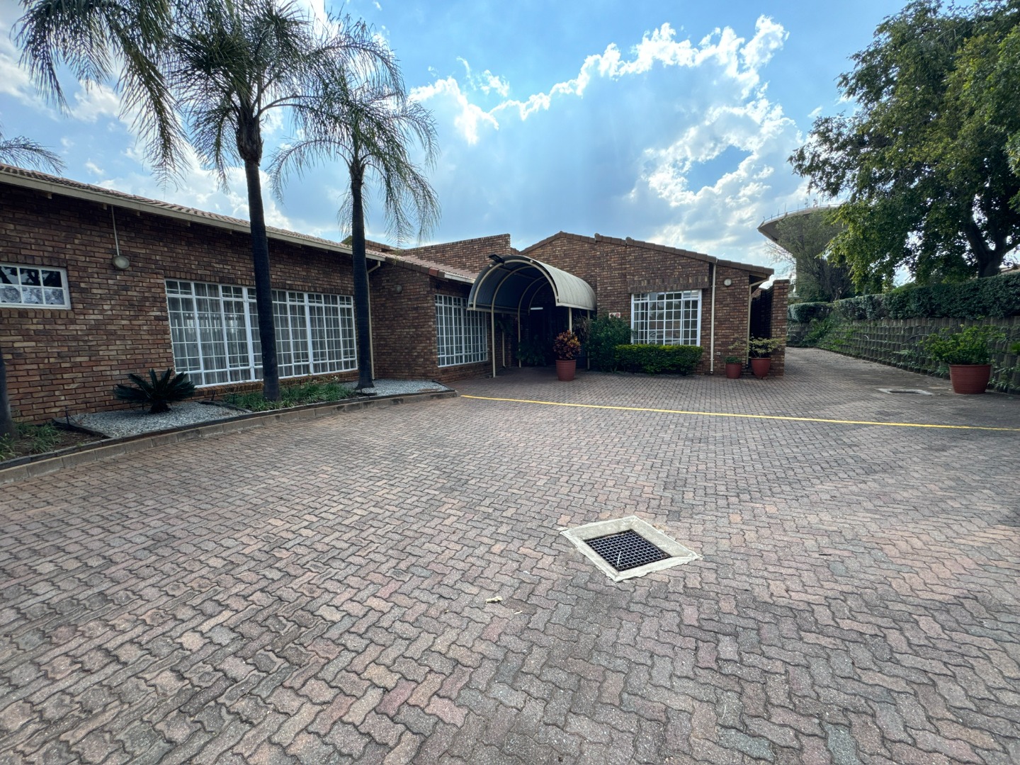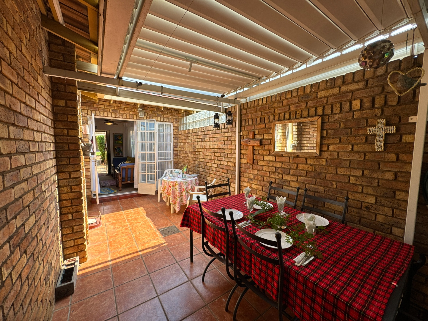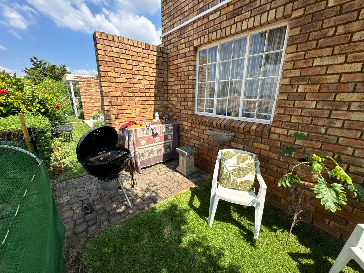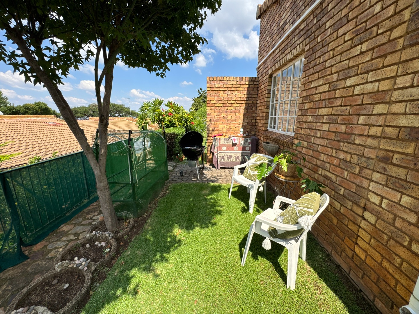 This charming cluster-style property in Brummeria, Pretoria, offers a welcoming facade with its durable brick construction, tiled roof, and neatly manicured front garden. A paved driveway leads to a covered parking area and a single garage, providing convenient space for vehicles. The well-maintained exterior sets a pleasant first impression for this retirement village residence.