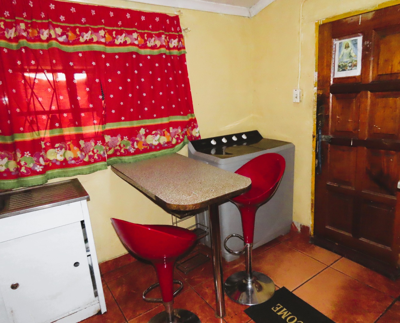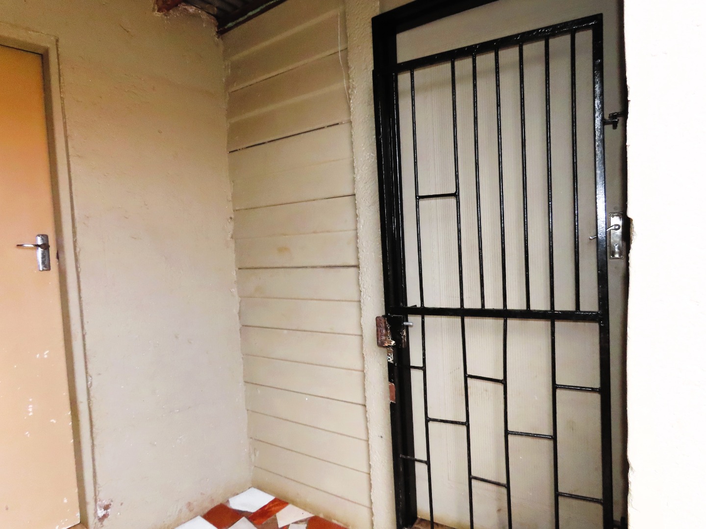 The interior welcomes you with a cozy lounge, characterized by warm yellow walls and durable tiled flooring. The kitchen, though compact, boasts cabinet storage and a practical stainless steel sink, catering to daily needs. A dedicated laundry area adds to the home's convenience. There is also a prepaid meter to manage and control your electrical usage.