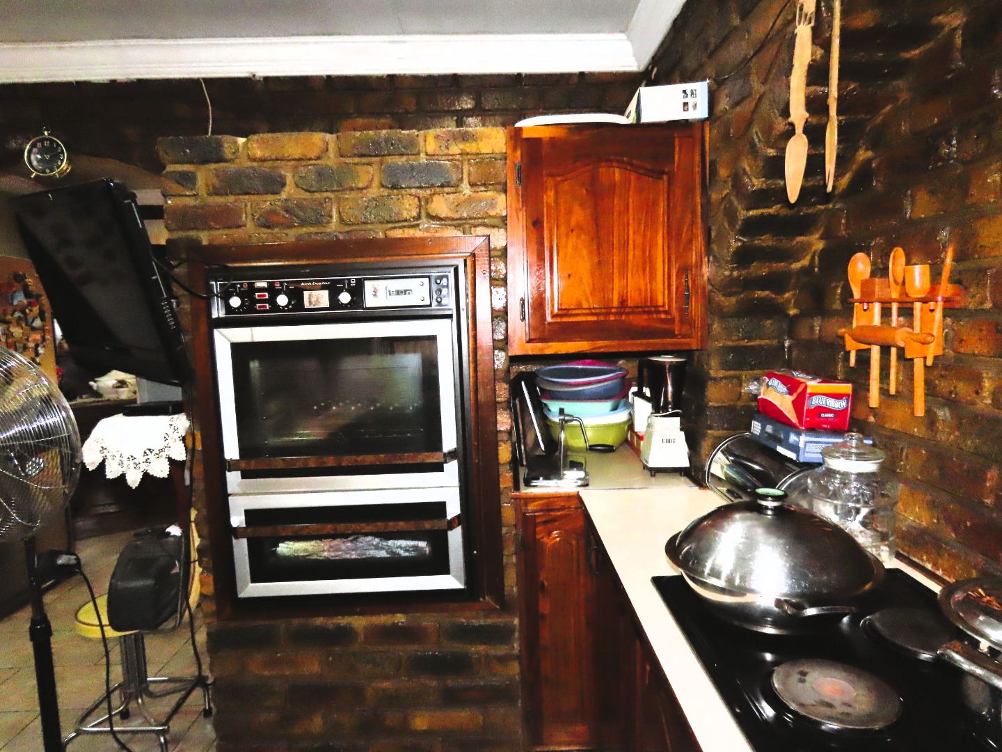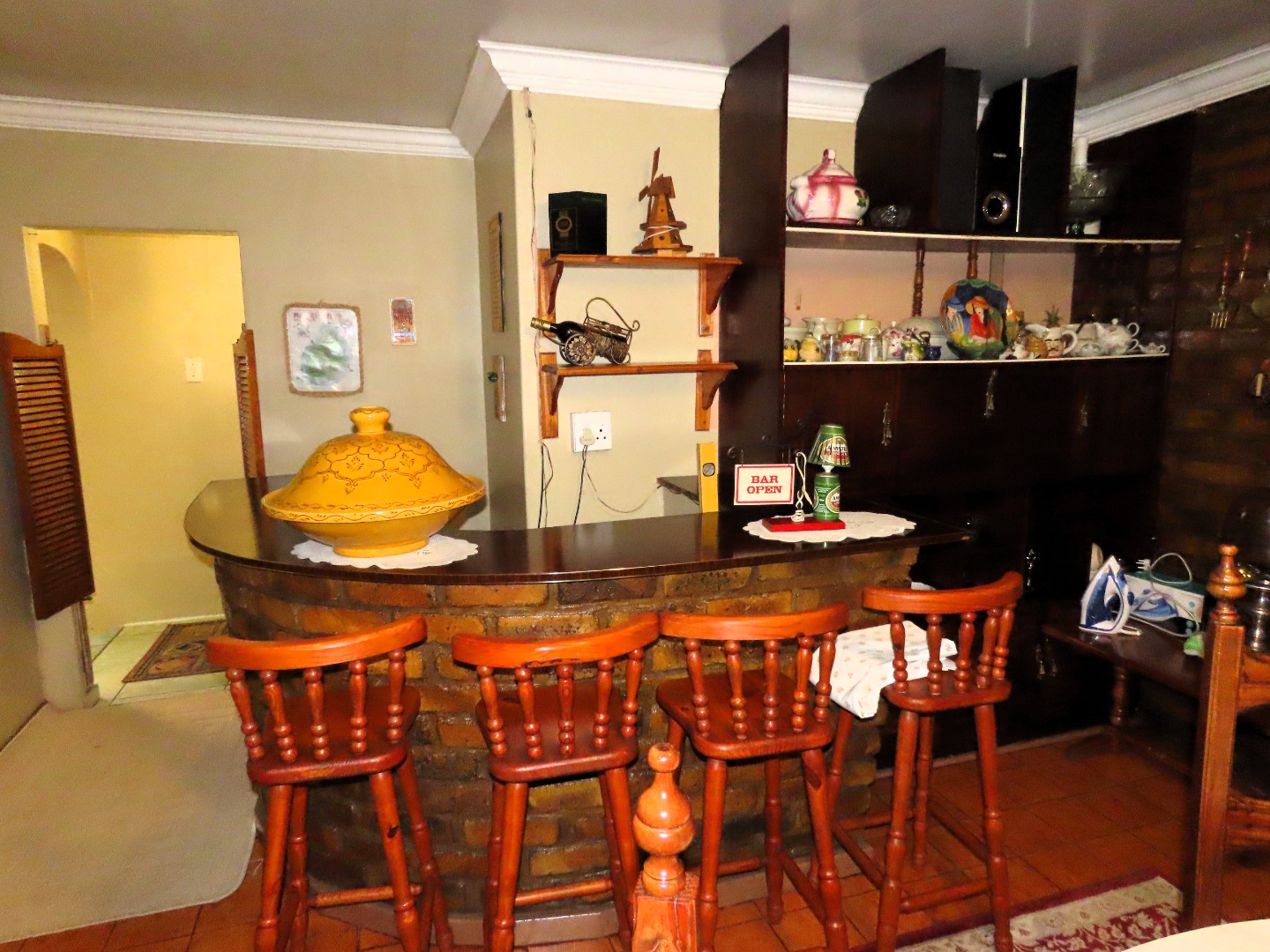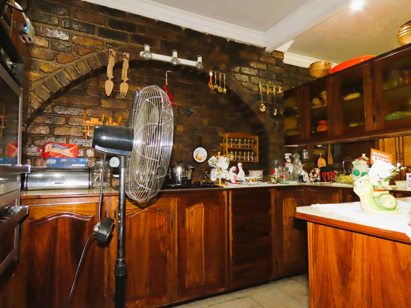 The interior features a welcoming lounge and a dedicated dining area, providing distinct zones for relaxation and formal meals. The home is designed with an open-plan special feature, enhancing the flow between key living spaces. A highlight is the unique sunken circular room with built-in seating and arched windows, offering a distinctive space for gatherings. The property also includes an indoor bar area, perfect for entertaining guests. The kitchen is equipped with ample imbuia cabinetry, a centre island for cozy mealtimes and a double sink, maintaining a warm, traditional aesthetic.