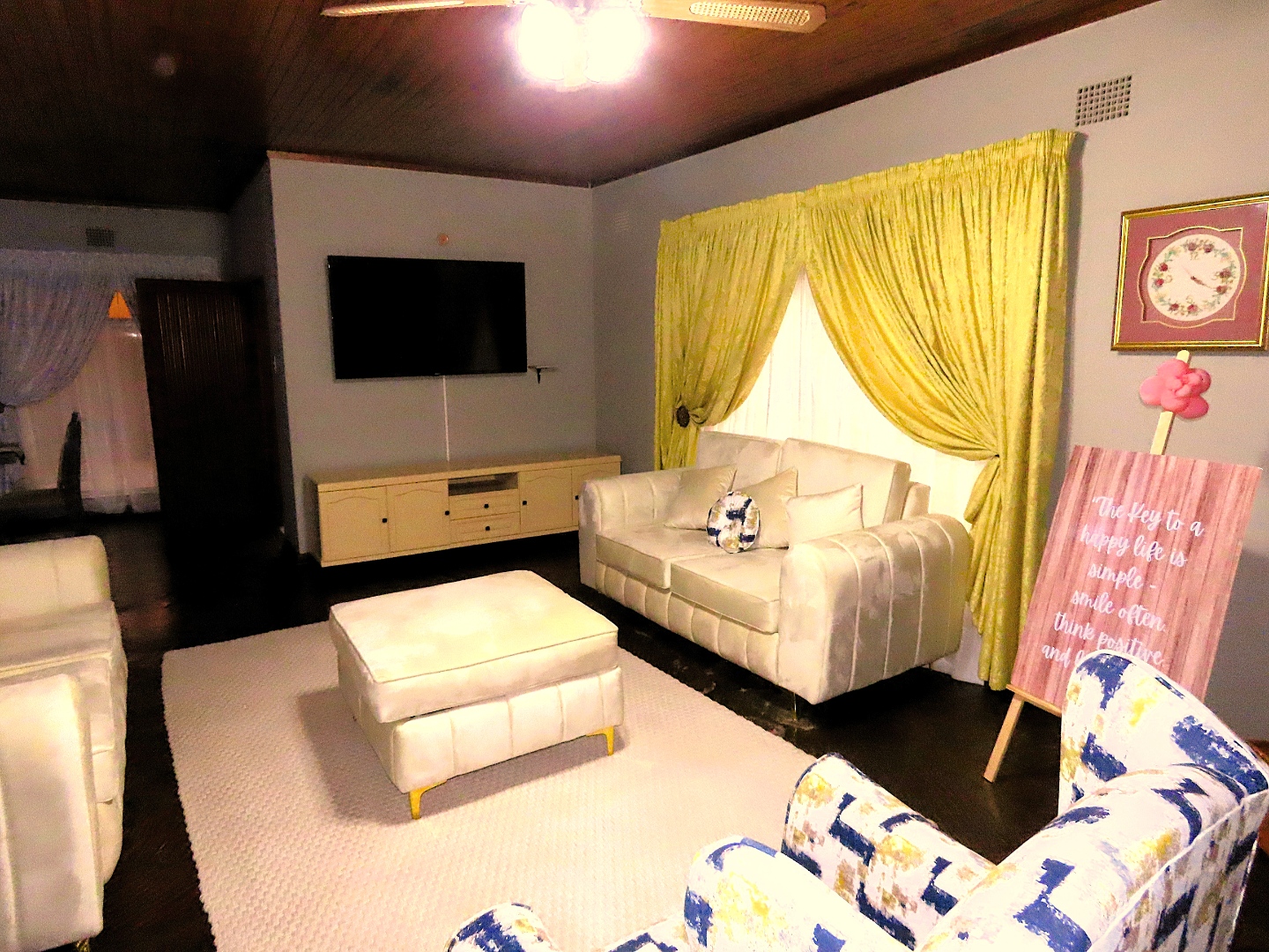 Upon entering through the welcoming entrance hall, you are greeted by an open-plan layout that seamlessly connects the living spaces. The spacious lounge features a unique wooden paneled ceiling, an exposed brick accent wall, and a built-in fireplace, with slate tiled floors, creating a warm and inviting atmosphere. Adjacent to this, is a dining room as well as a convenient pass-through to the kitchen which ensures effortless entertaining at its best.