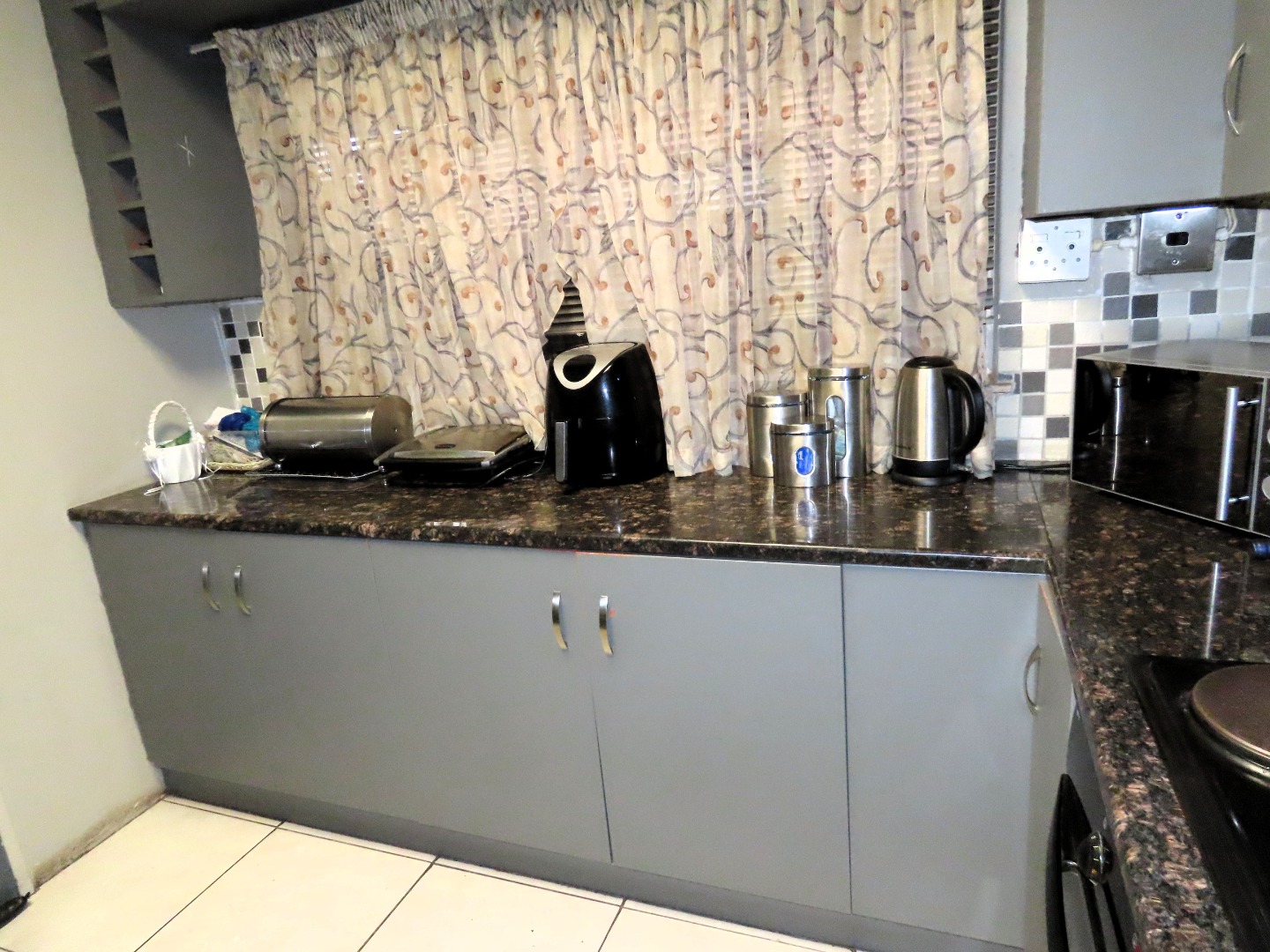 The modern kitchen is a highlight, boasting sleek grey cabinetry, dark speckled granite countertops, with oven and hob, and a contemporary checkered tile backsplash. It is well-equipped with ample storage, catering to all culinary needs. The home offers three comfortable bedrooms, including a main bedroom with walk-in closet and en-suite bathroom, alongside a second well-appointed bathroom.