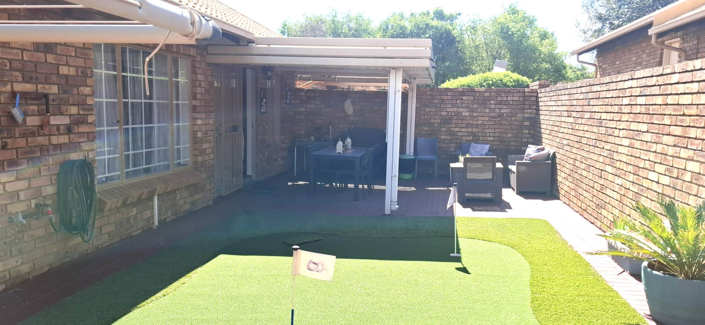 Outdoor living is a standout feature, with a covered patio ideal for entertaining or relaxing. This area includes a unique artificial turf putting green, adding a touch of leisure and charm. The property also offers access to a swimming pool situated in the complex with a beautiful garden for relaxation and perfect for warm summer days.