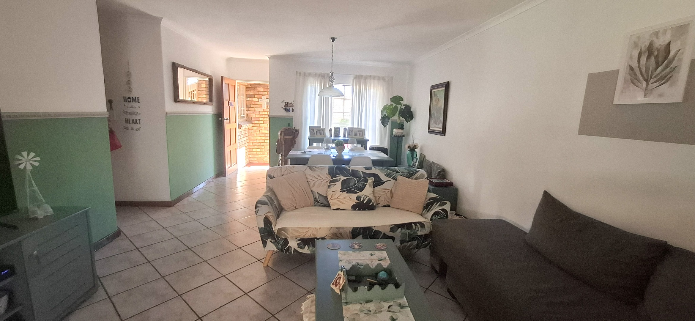 The home features a spacious lounge and separate dining area, creating a welcoming space for both everyday living and entertaining. The functional kitchen is fitted with a gas hob, modern subway-tile backsplash, ample cupboard space, and space for front loader washing machine, fridge/freezer and tumble dryer. Extra connection point for top loader washing machine fitted in the garage.