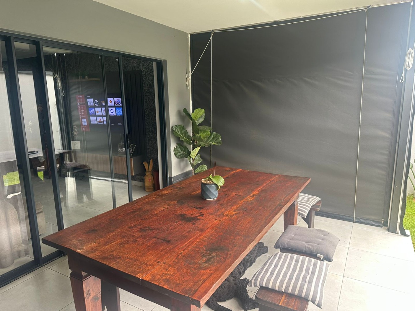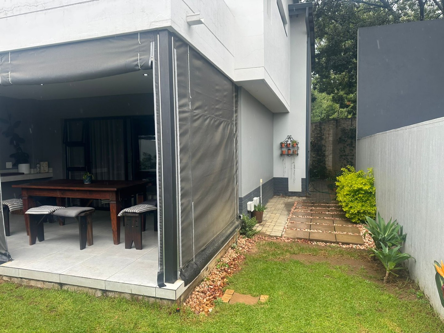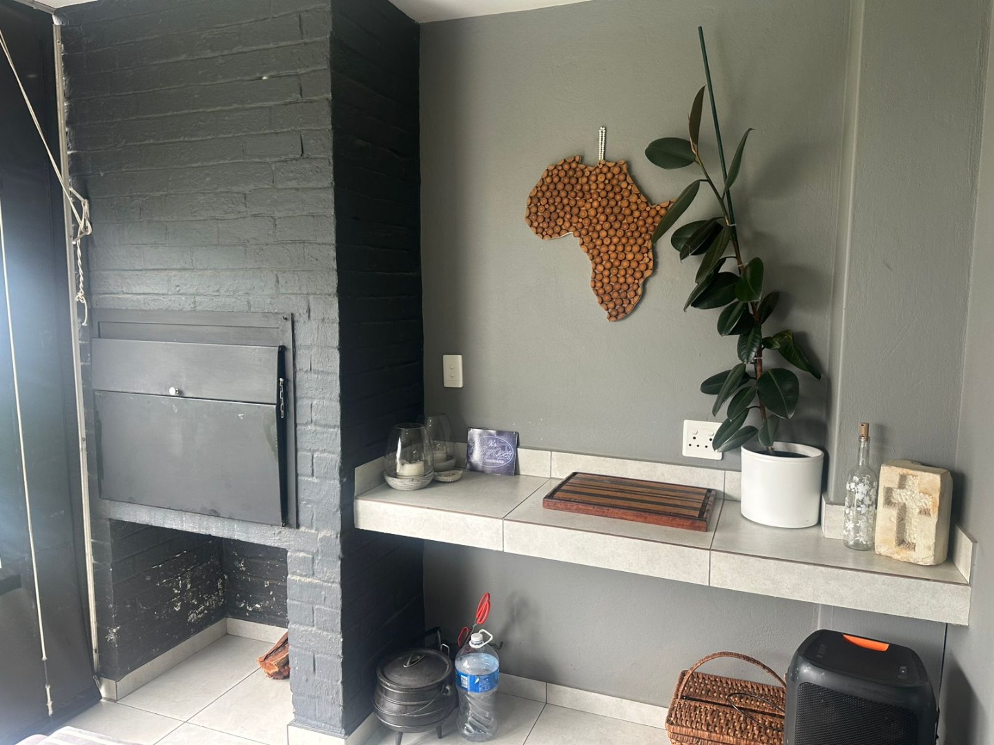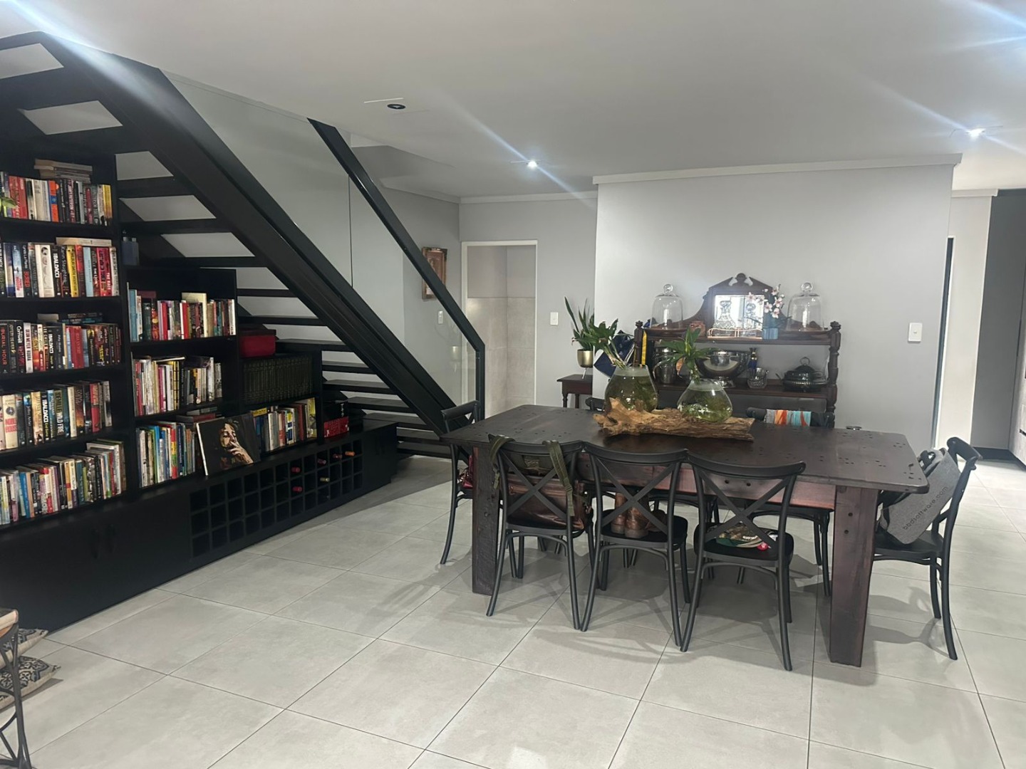 Lovely 3-Bedroom Home in Equestria - This beautiful and well-maintained 3-bedroom home offers comfortable living with great features for modern family life. Downstairs you will find a small, easy-to-maintain garden and a covered patio with canvas enclosures and a built-in braai — perfect for entertaining year-round. Inside, the home features a spacious open-plan living and dining area, a well-appointed kitchen with a separate scullery, a guest toilet, and a built-in bookshelf that adds charm and functionality. Upstairs offers three bedrooms. The main bedroom includes its own private patio, an en-suite bathroom, and plenty of cupboard space. Two additional bedrooms share a second bathroom. The home also offers double automated garages for secure and convenient parking. Extras include fibre internet, prepaid electricity, and custom-made blinds that were specifically designed for the home and will remain. The property is conveniently located close to excellent schools and Linton’s Corner Shopping Centre in Equestria.