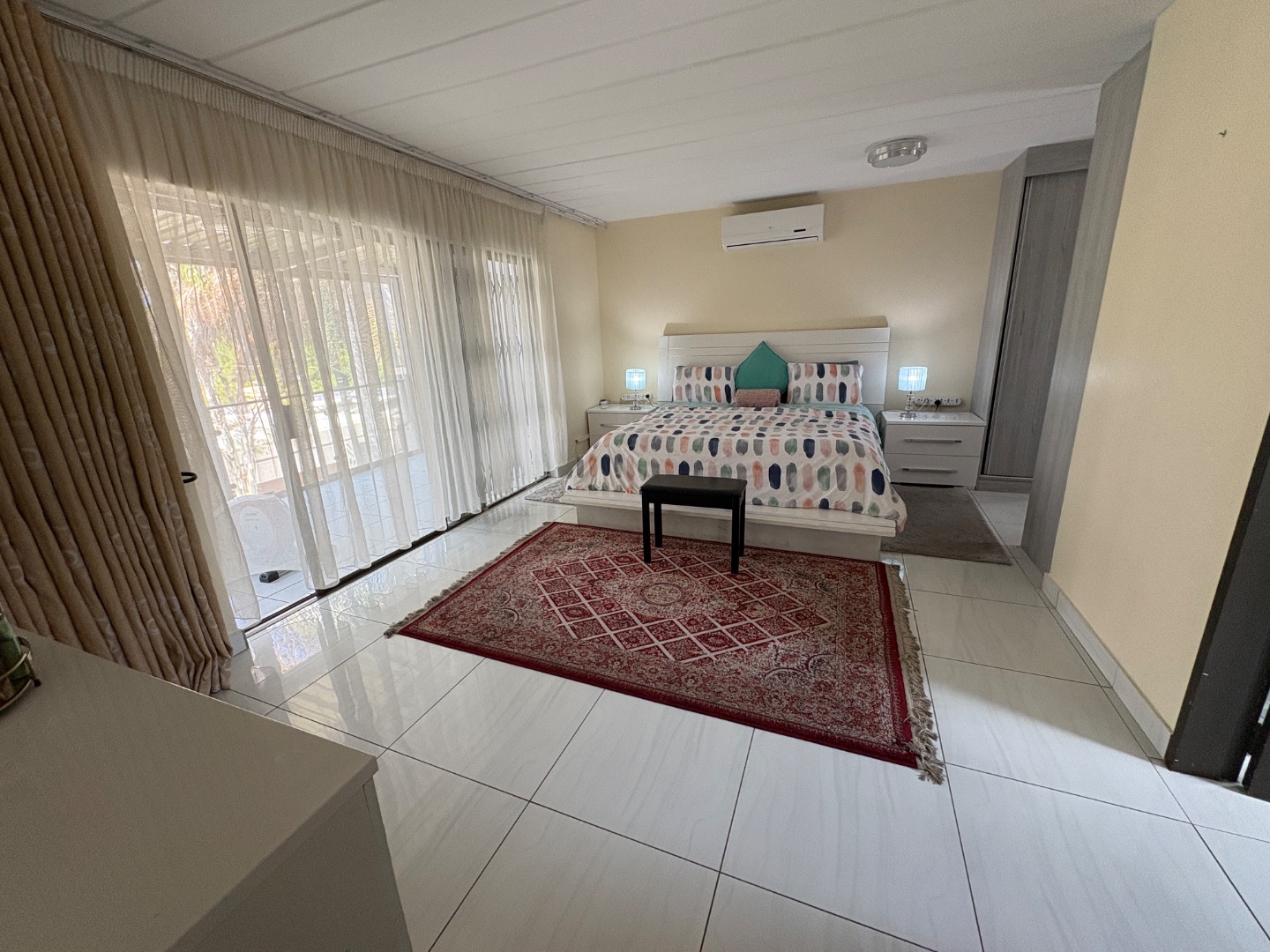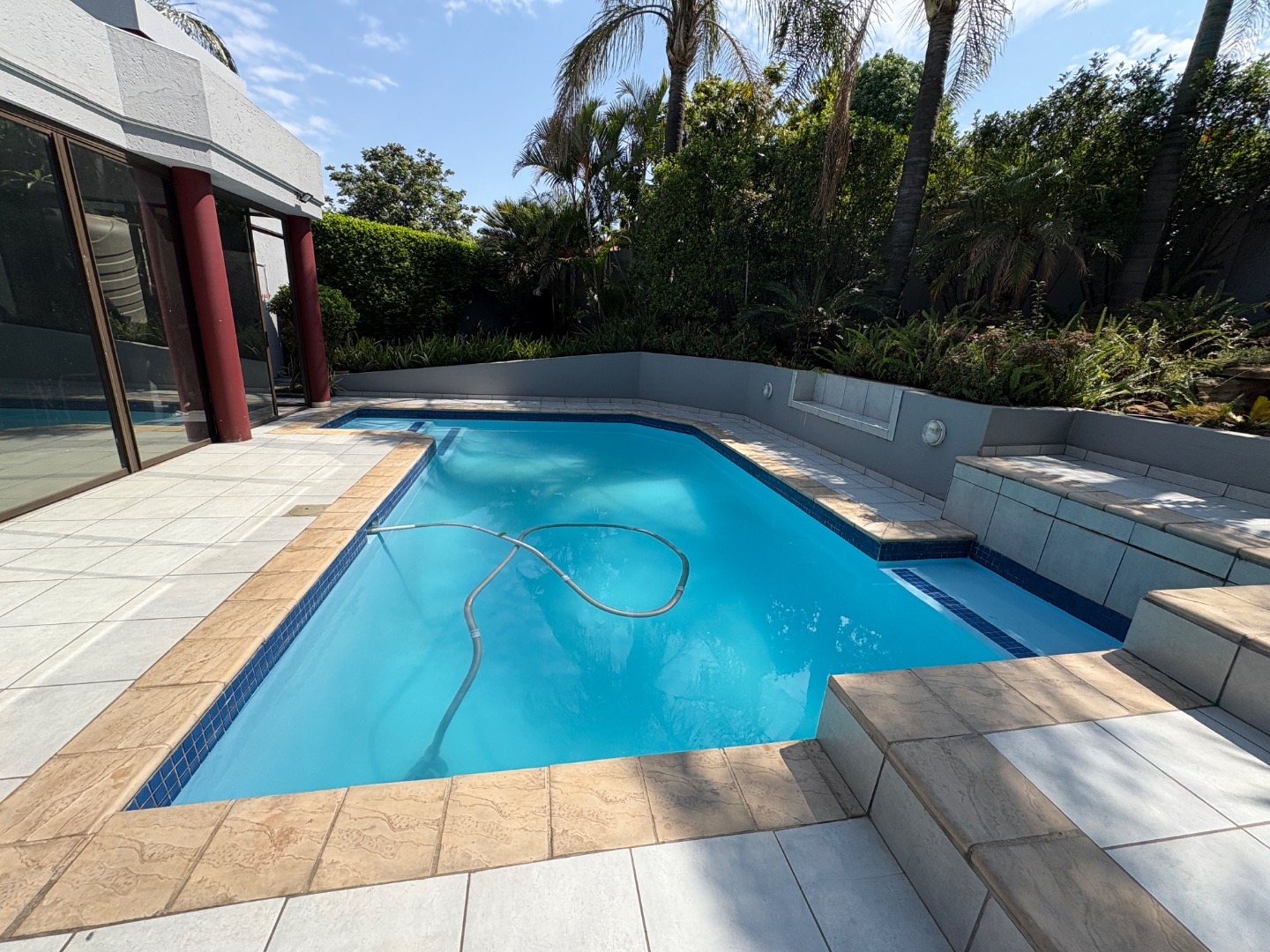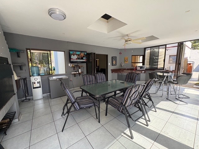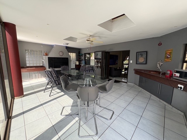 Accommodation comprises four generously proportioned bedrooms and three well-appointed bathrooms, including a luxurious en-suite. Each bedroom benefits from ample natural light, with large sliding glass doors providing access to outdoor spaces and equipped with air conditioning for optimal comfort. Externally, the property features a large swimming pool, complemented by an integrated indoor/outdoor entertainment area, a patio, and a built-in braai, perfect for alfresco gatherings. The established garden and outside toilets add to the convenience.