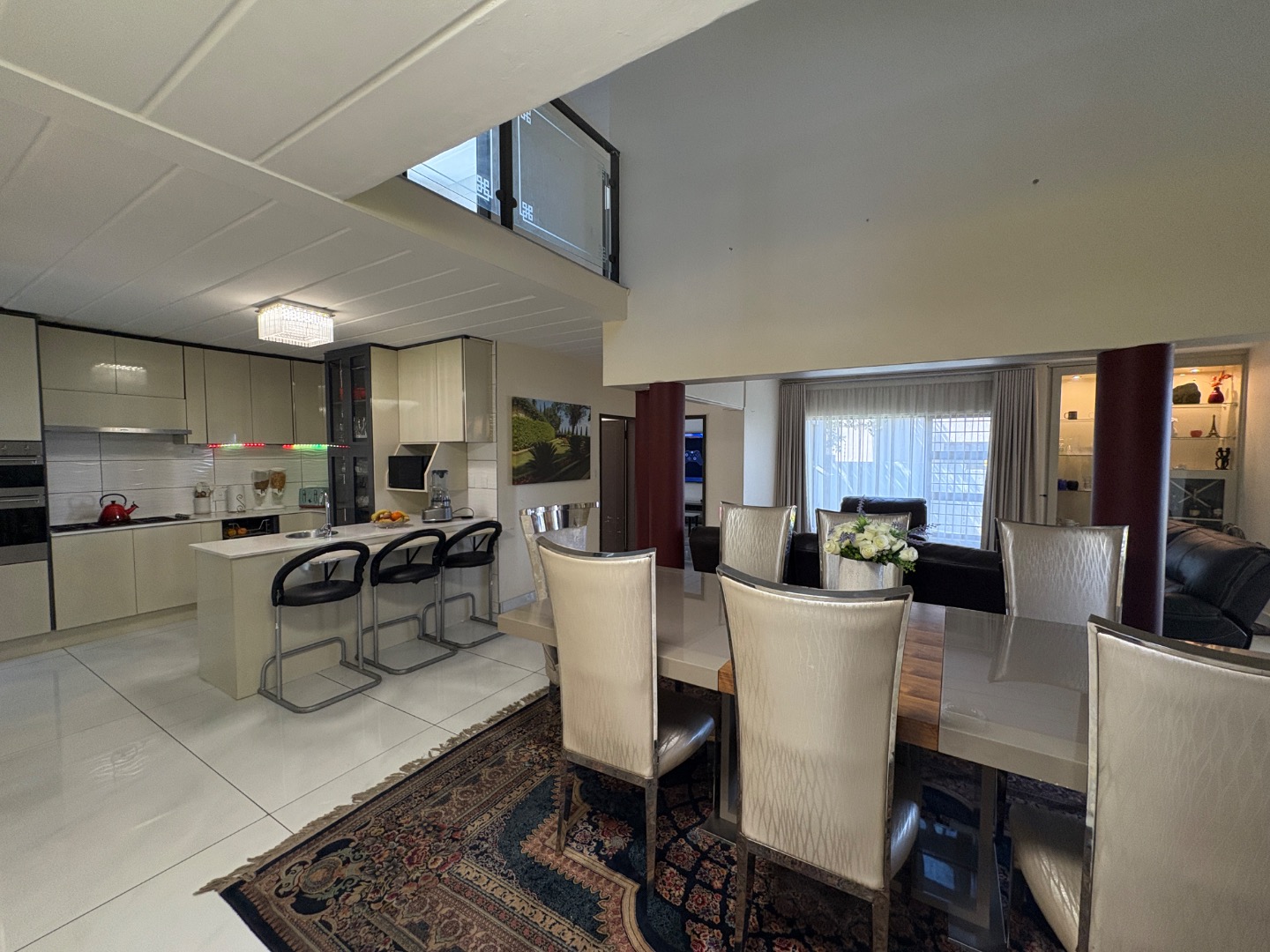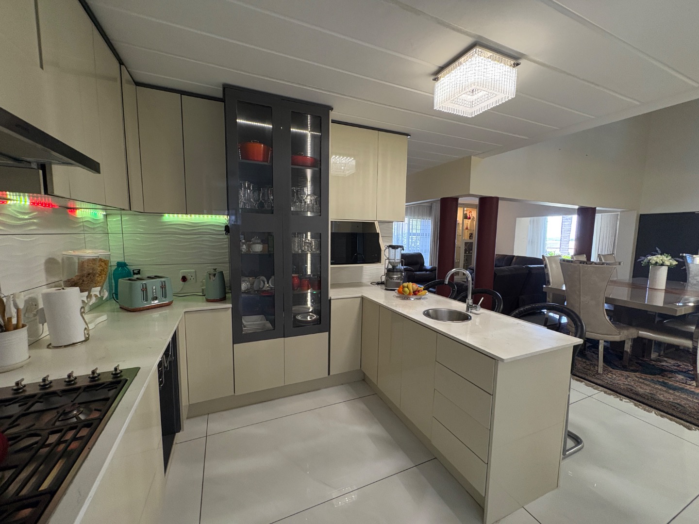 The interior boasts an exceptional open-plan design, seamlessly integrating three lounges, a dining room, and a contemporary kitchen. High ceilings and a multi-level layout, including a mezzanine, enhance the sense of grandeur and airiness. The modern kitchen is a focal point, featuring cream and grey cabinetry, integrated appliances, a practical pantry, and a peninsula with seating. A dedicated study and a guest toilet further augment the home's comprehensive amenities.