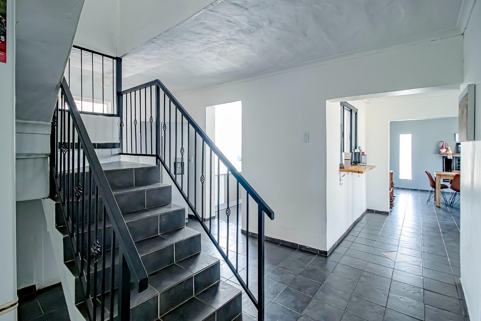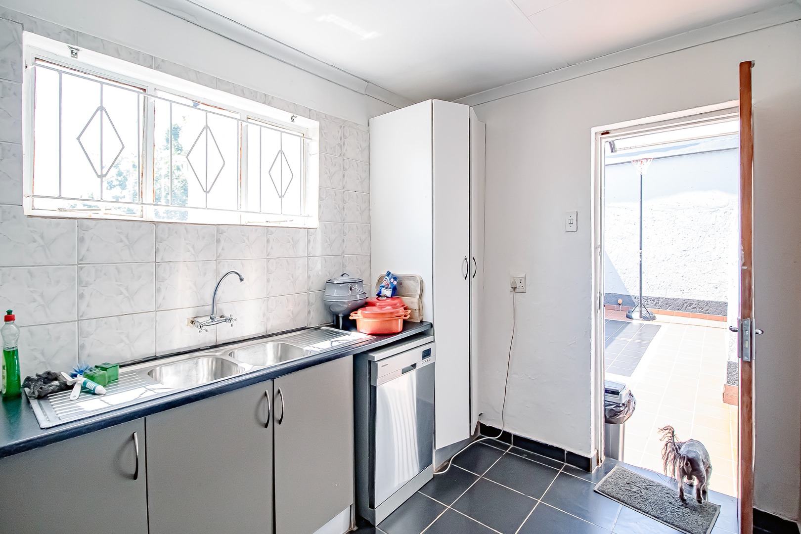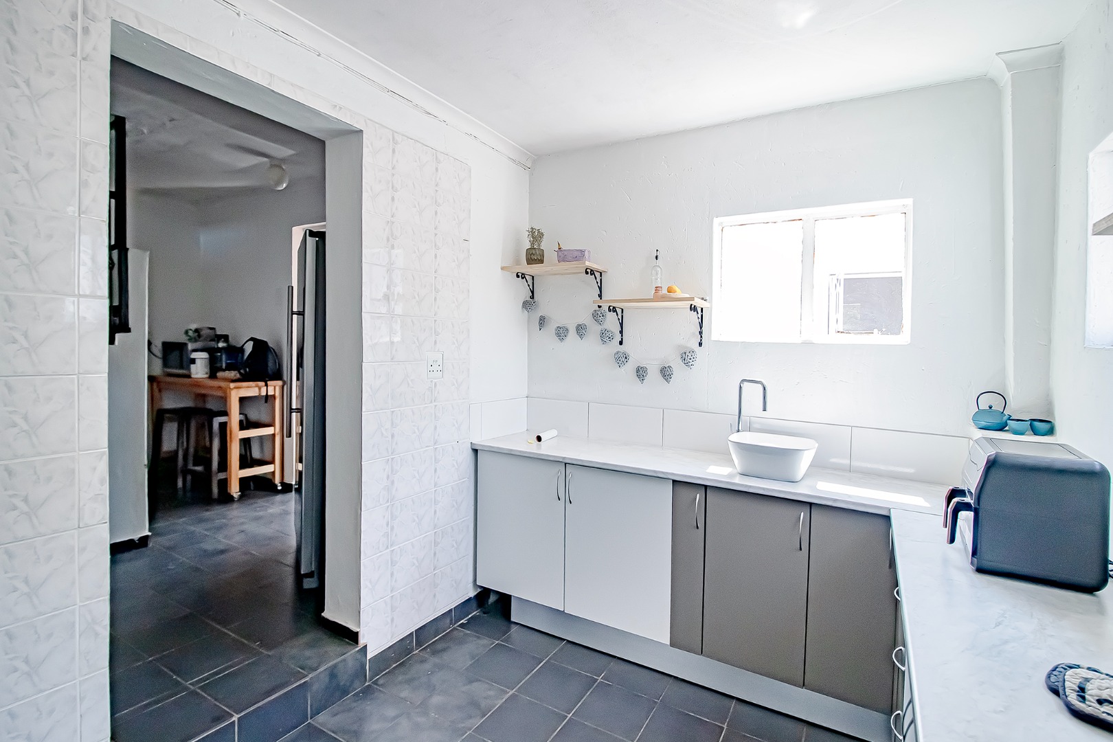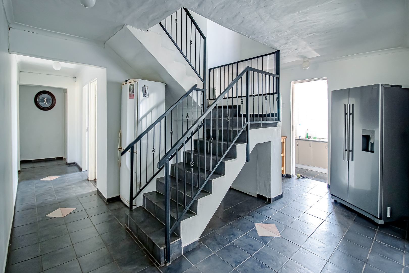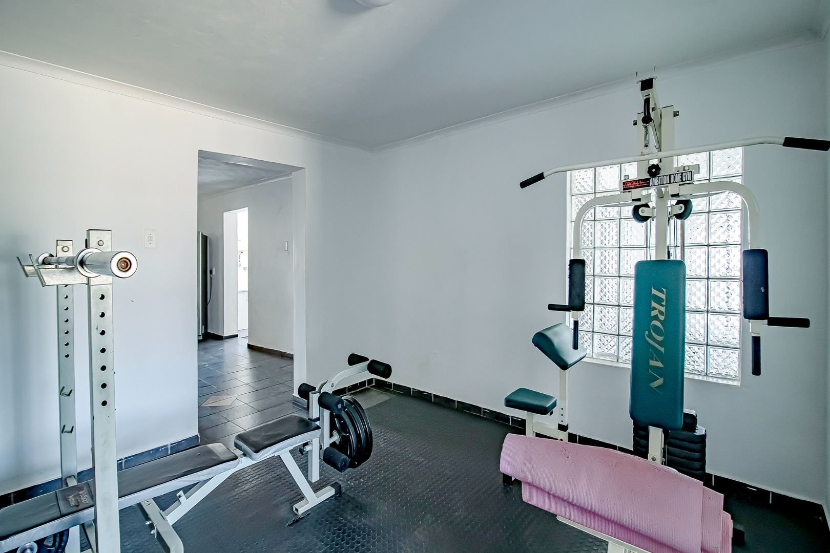 Step into an inviting entrance hall that leads to a modernised dining room on the right. The home offers a lounge currently converted into a gym, as well as a contemporary kitchen fitted with Caesarstone countertops, gas stove, a separate scullery, and an enclosed courtyard for added convenience.