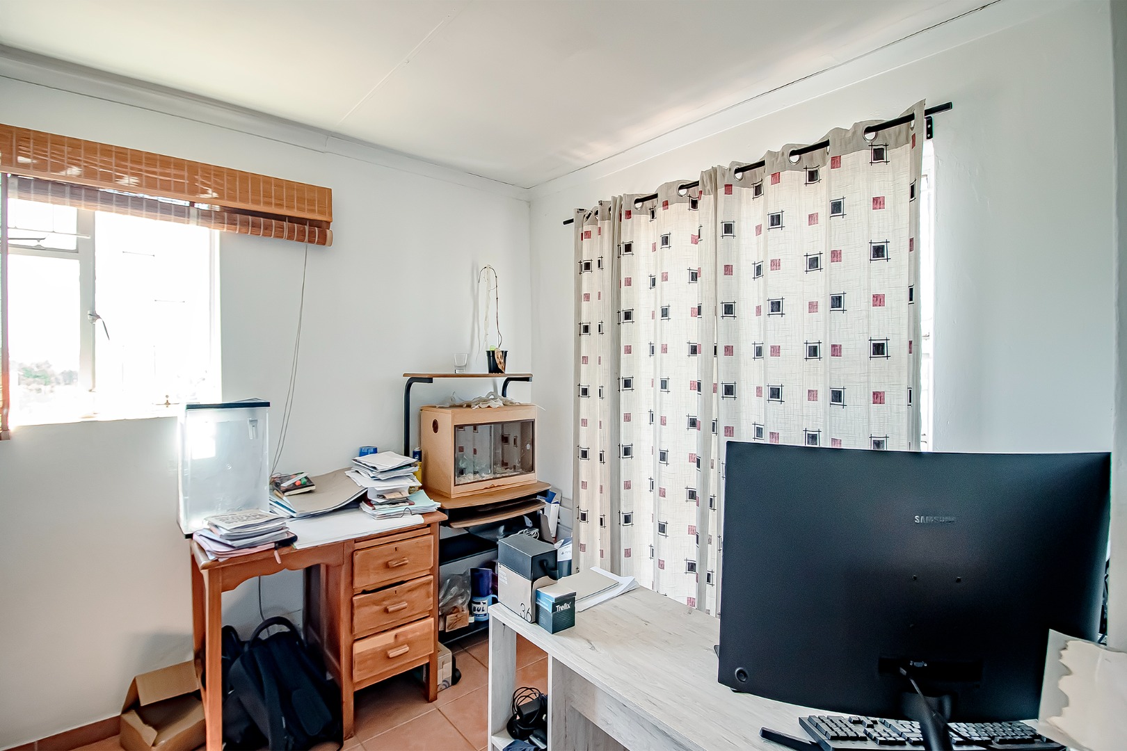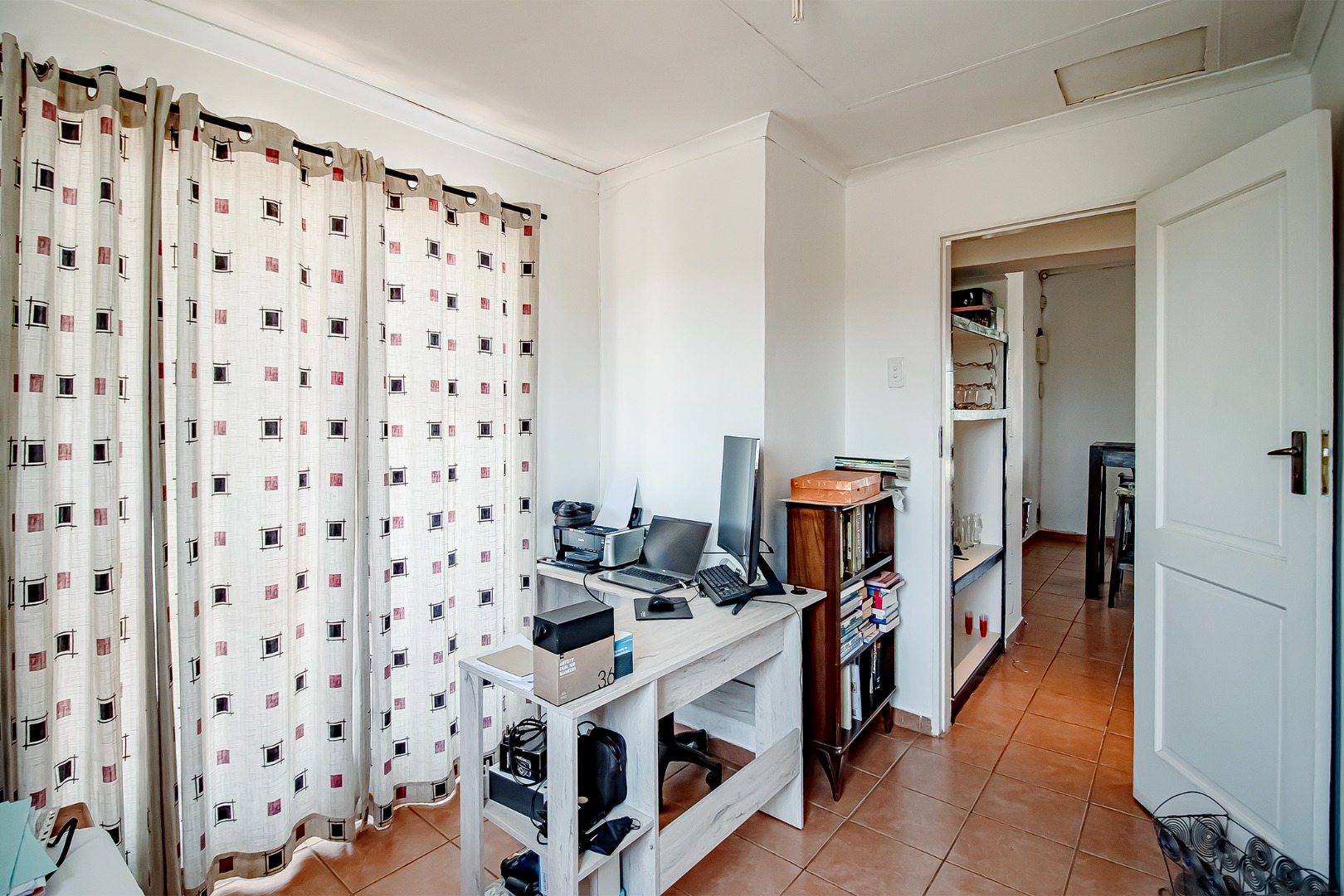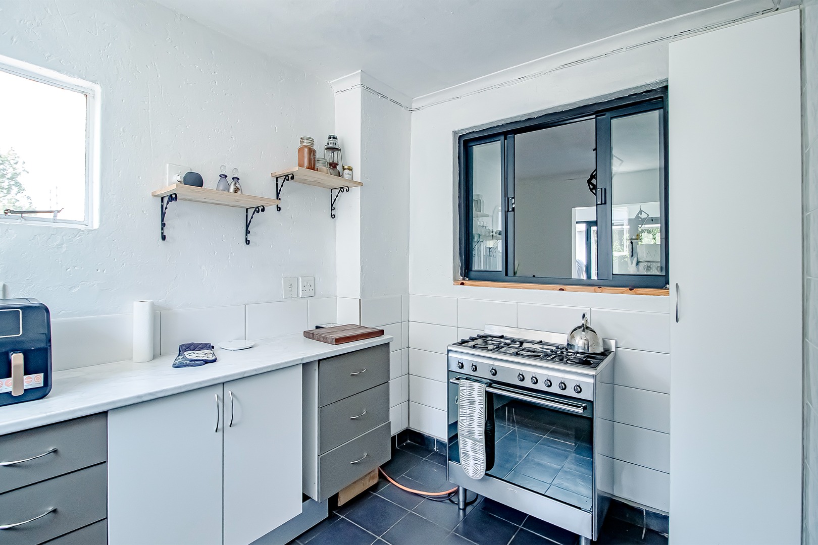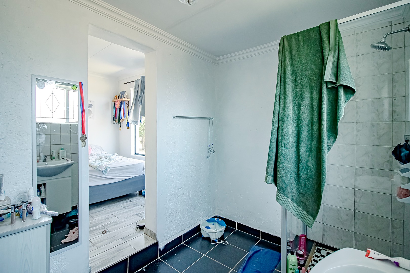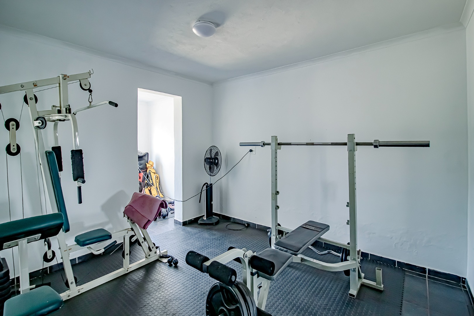Step into an inviting entrance hall that leads to a modernised dining room on the right. The home offers a lounge currently converted into a gym, as well as a contemporary kitchen fitted with Caesarstone countertops, gas stove, a separate scullery, and an enclosed courtyard for added convenience.