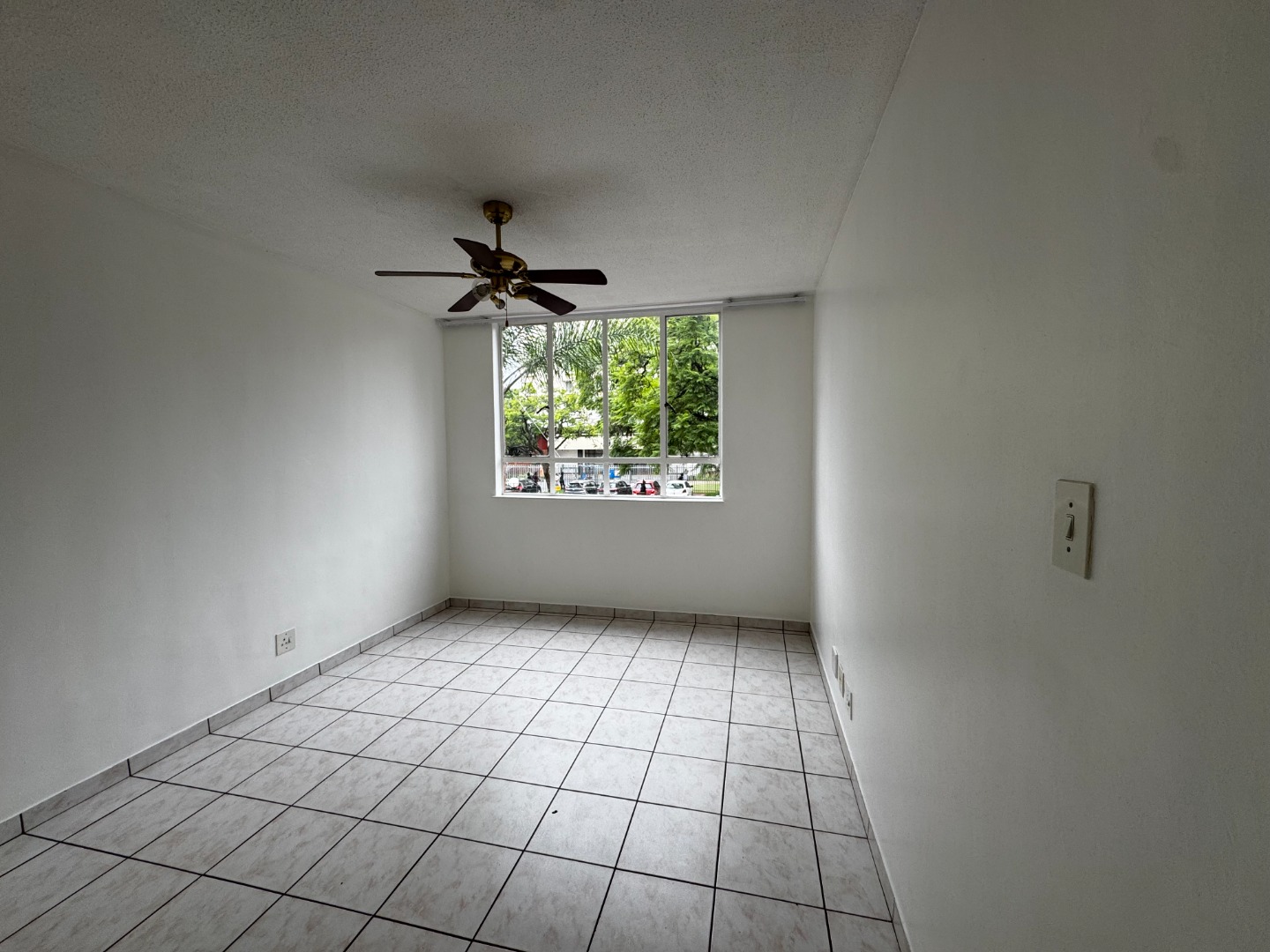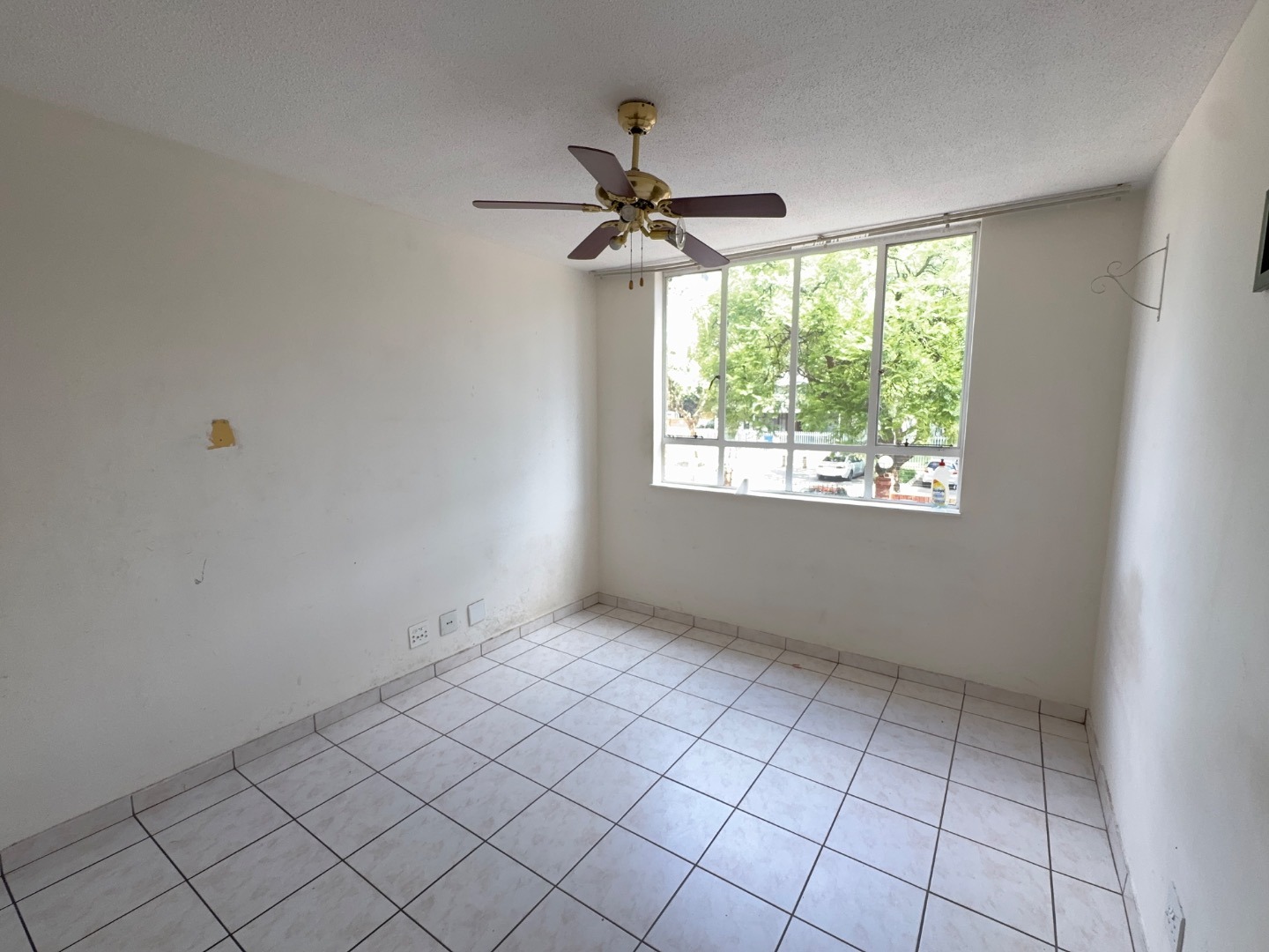 The two comfortable bedrooms are designed for practicality, each featuring durable, light-colored tiled flooring, neutral white walls. Built-in closets offer valuable storage, while large windows invite ample natural light and views of greenery. The single bathroom is functional and well-maintained, catering to daily needs.