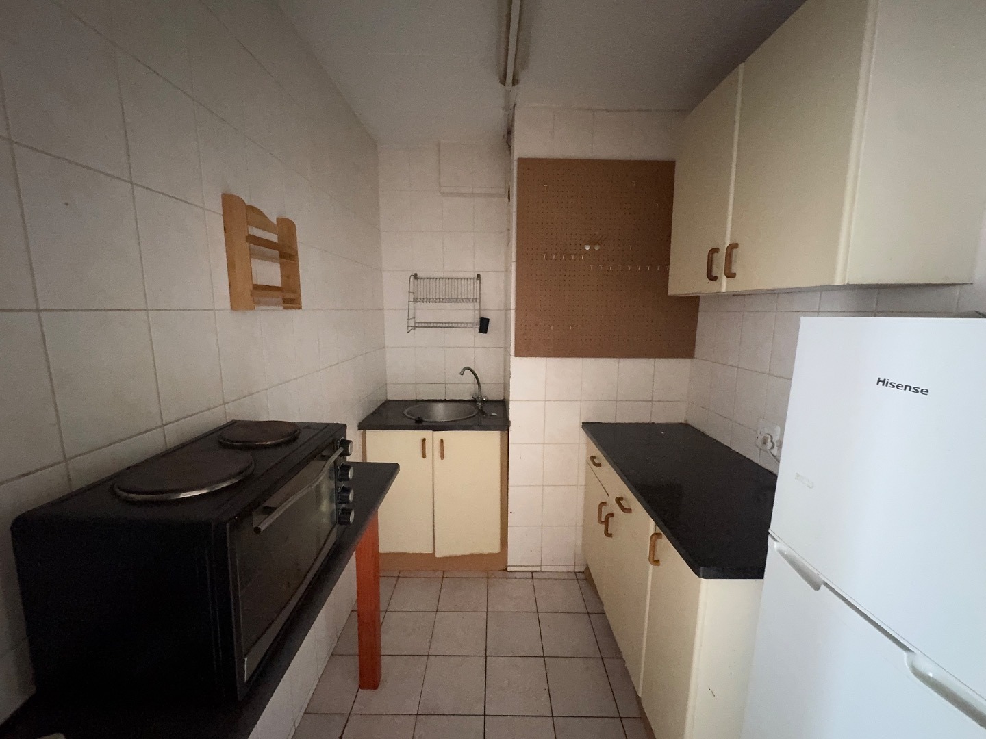 Spanning 43 square meters, this compact apartment offers a functional layout. The kitchen, though efficient, includes essential appliances like a refrigerator, sink, and a mini-oven with hotplates, complemented by cream-colored cabinetry and easy-to-clean tiled walls and floors. The design efficiently integrates living functions within the space, providing a practical environment ideal for student life.