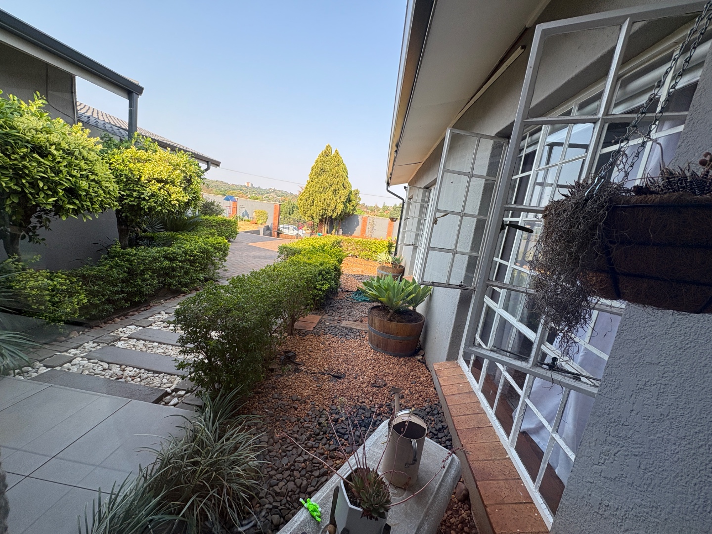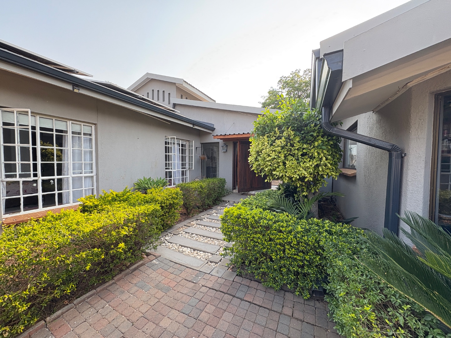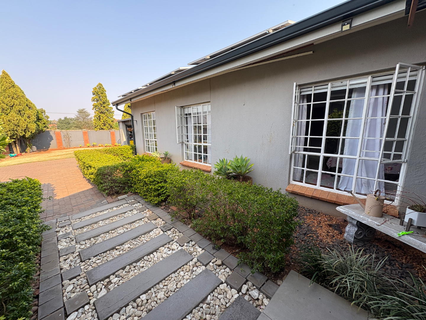 Welcome to this charming Lynnwood Manor home, where modern style meets comfortable living. The neat light grey exterior, framed by well-kept hedges and a welcoming paved pathway, creates a lovely first impression. Step inside to a bright entrance hall, leading into spacious, open-plan living areas with light tiled floors and a distinctive v-groove paneled ceiling. Natural light floods in through large windows and sliding doors, creating an inviting atmosphere.