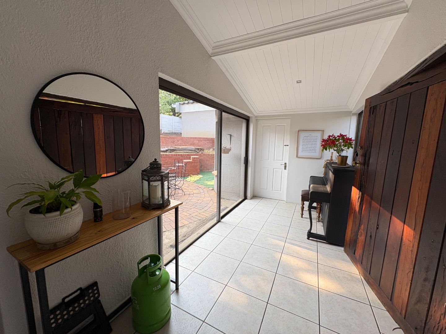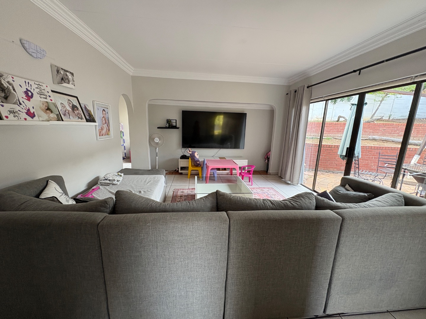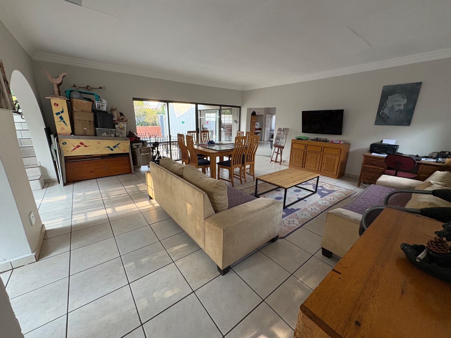 Welcome to this charming Lynnwood Manor home, where modern style meets comfortable living. The neat light grey exterior, framed by well-kept hedges and a welcoming paved pathway, creates a lovely first impression. Step inside to a bright entrance hall, leading into spacious, open-plan living areas with light tiled floors and a distinctive v-groove paneled ceiling. Natural light floods in through large windows and sliding doors, creating an inviting atmosphere.