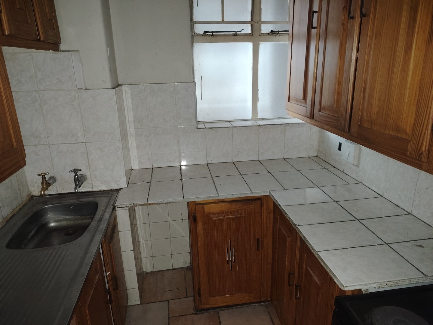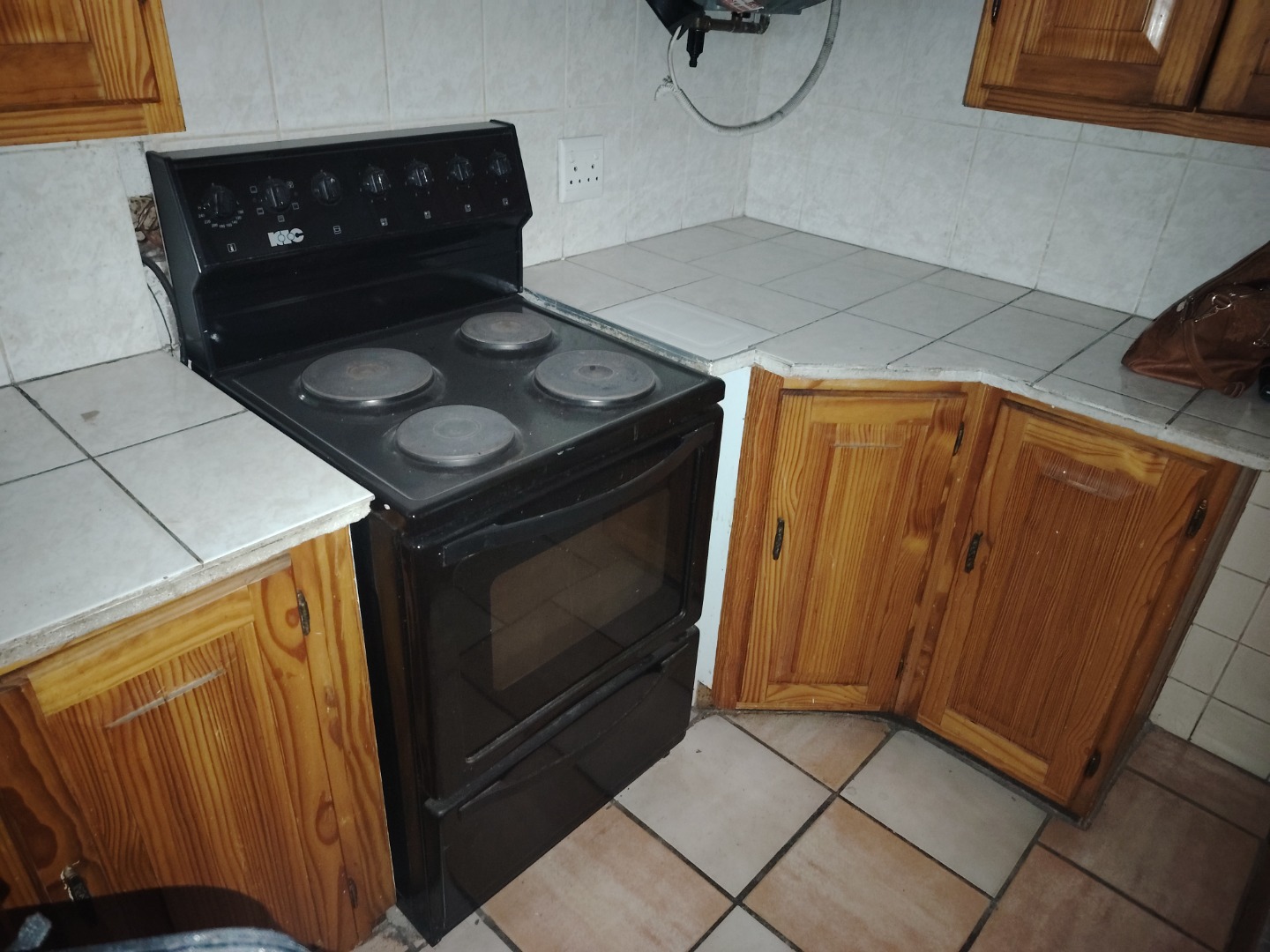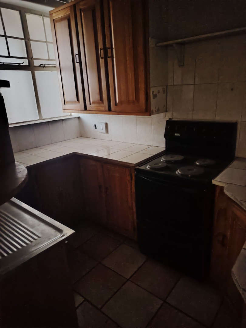 The kitchen is practical and ready for action, featuring tiled countertops, wooden cabinets, and an electric stove. It’s got all the basics covered, and with a little bit of love, it can easily become a modern, inviting space for all your cooking adventures. Plus, there's a window to let in that lovely South African sunshine and a breeze.
