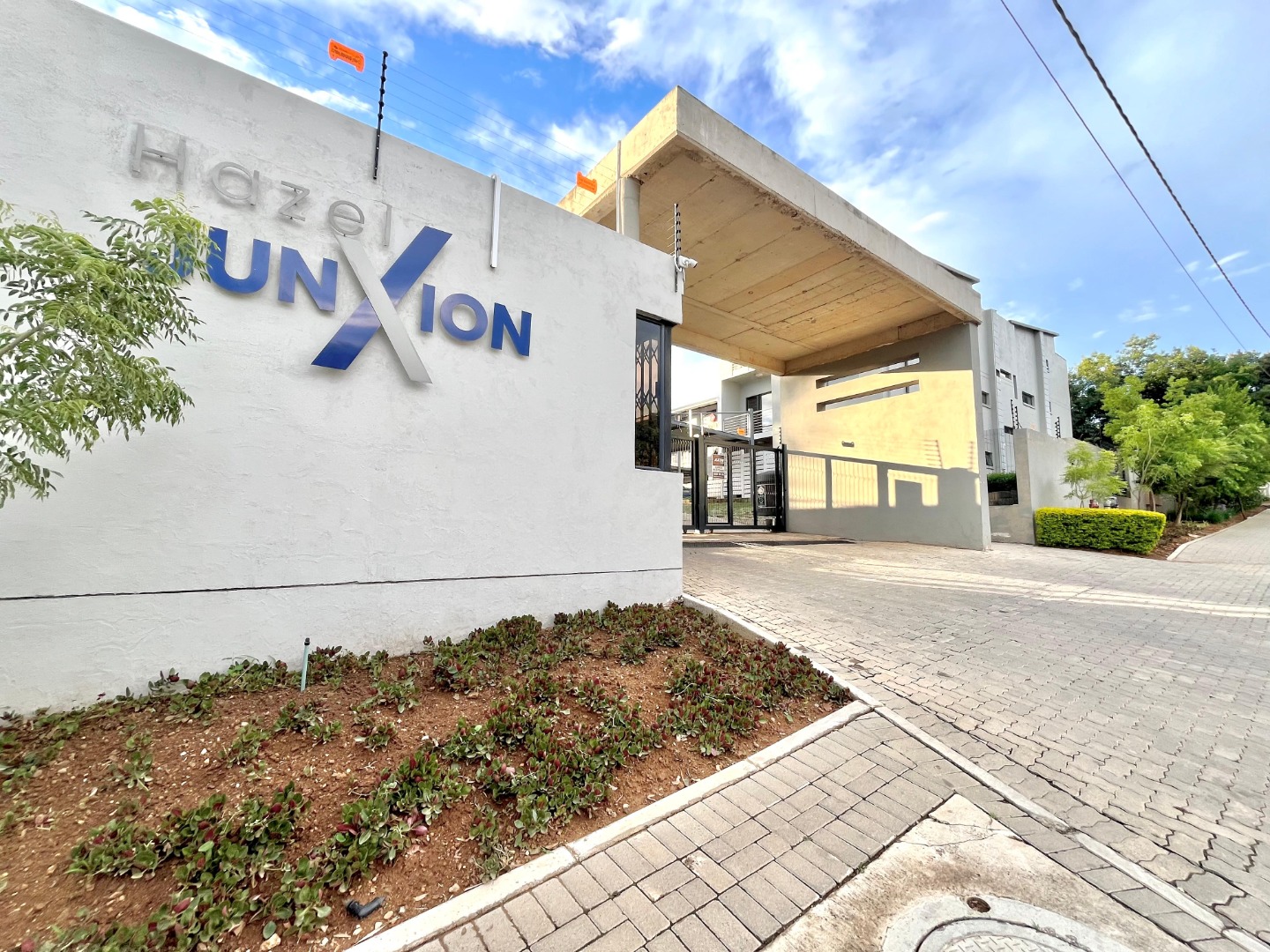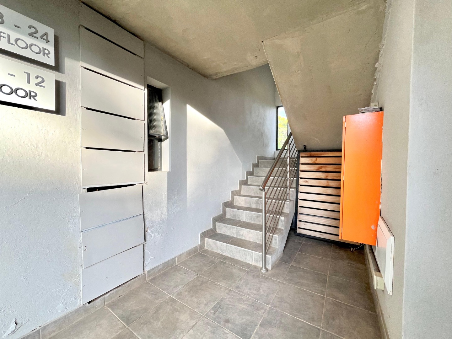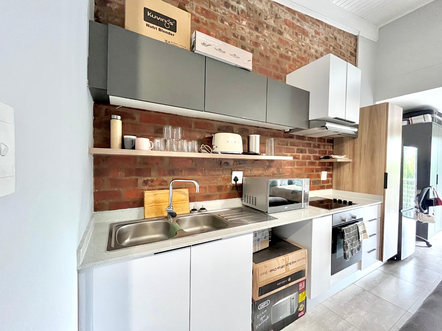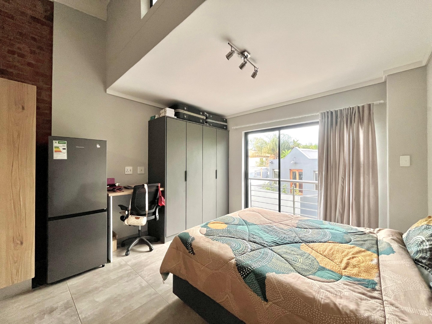 Discover modern living in this stylish studio apartment located in the sought-after Menlo Park, Pretoria. This open-plan unit boasts high vaulted ceilings and large sliding doors that invite abundant natural light, creating an airy and spacious ambiance. Contemporary finishes, including an exposed brick accent wall and sleek tiled flooring, define the interior's aesthetic.