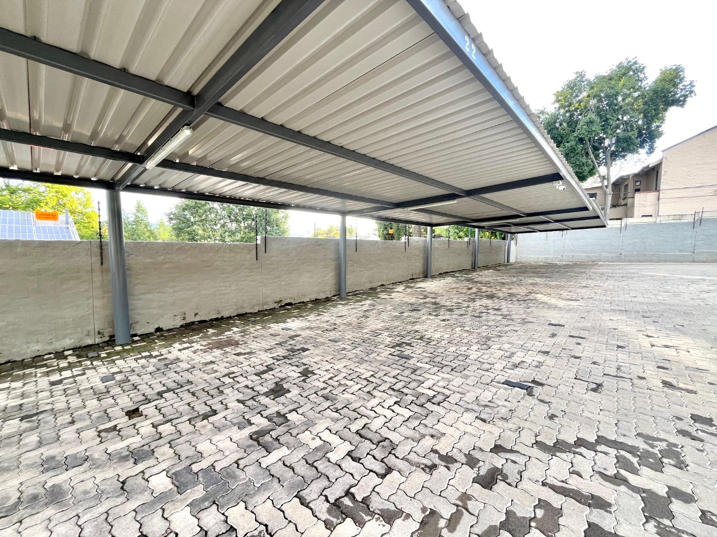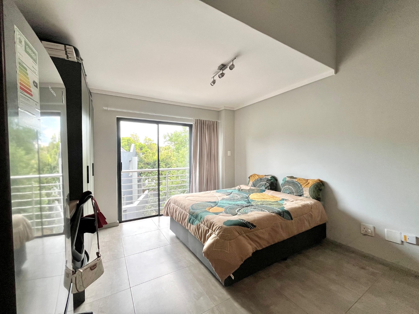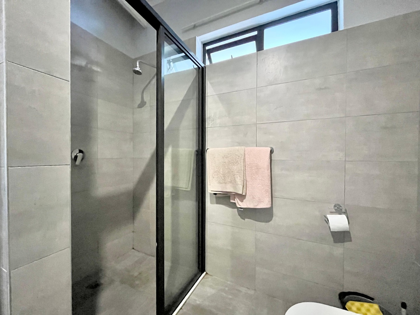 Discover modern living in this stylish studio apartment located in the sought-after Menlo Park, Pretoria. This open-plan unit boasts high vaulted ceilings and large sliding doors that invite abundant natural light, creating an airy and spacious ambiance. Contemporary finishes, including an exposed brick accent wall and sleek tiled flooring, define the interior's aesthetic.